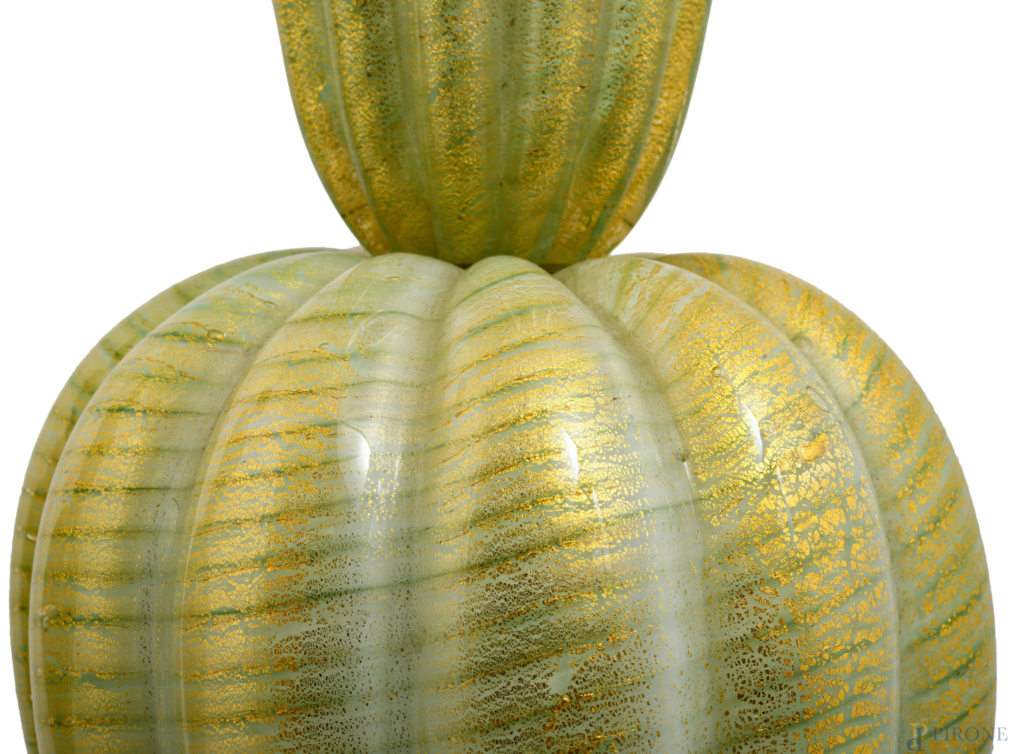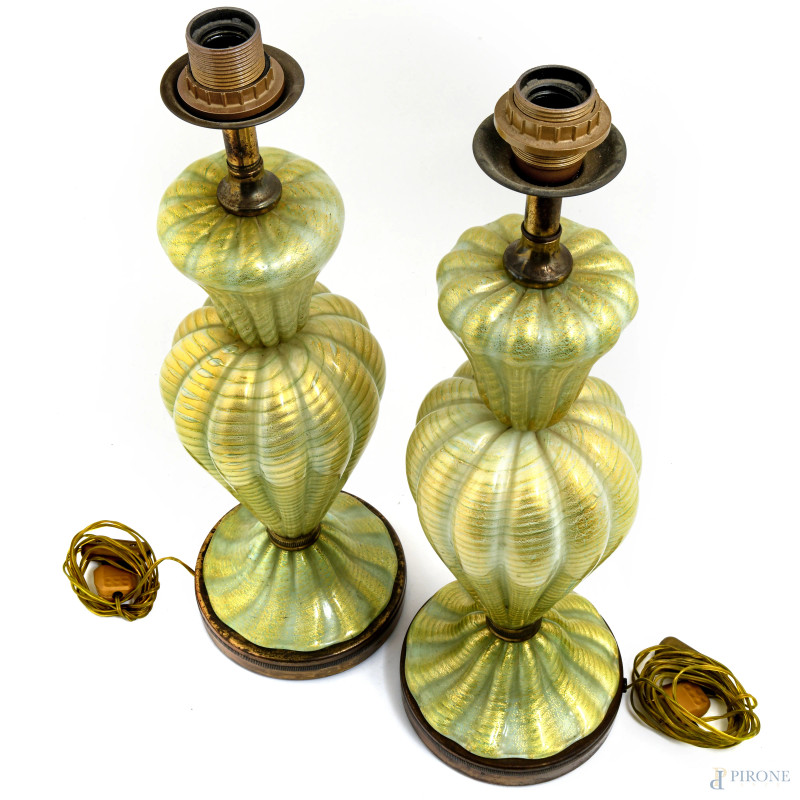 Coppia di lampade in vetro di Murano nei toni del verde e dell'oro, XX secolo, altezza cm 57,5. (segni di usura, da revisionare)