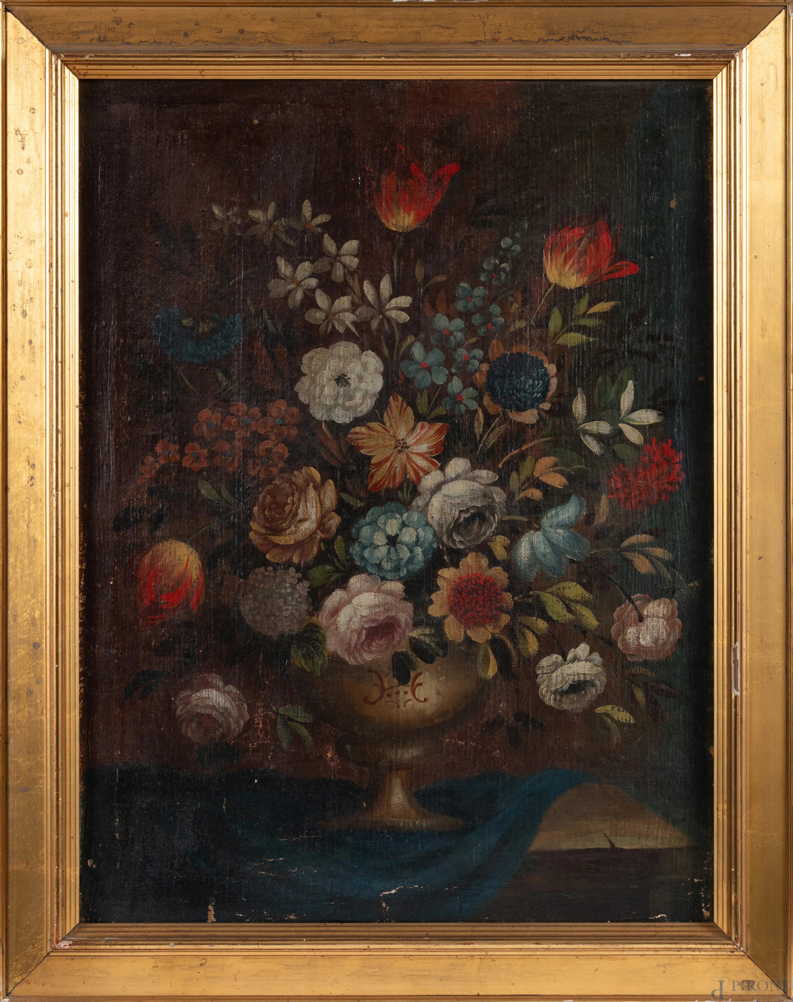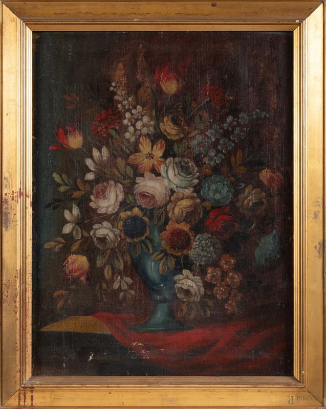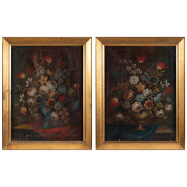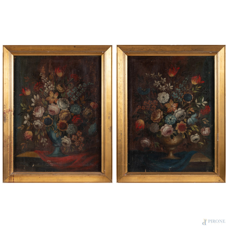 Coppia di nature morte, XIX secolo, olio su tela, cm 81x61, entro cornice, (abrasioni, cadute di colore, difetti, tela da ritensionare)