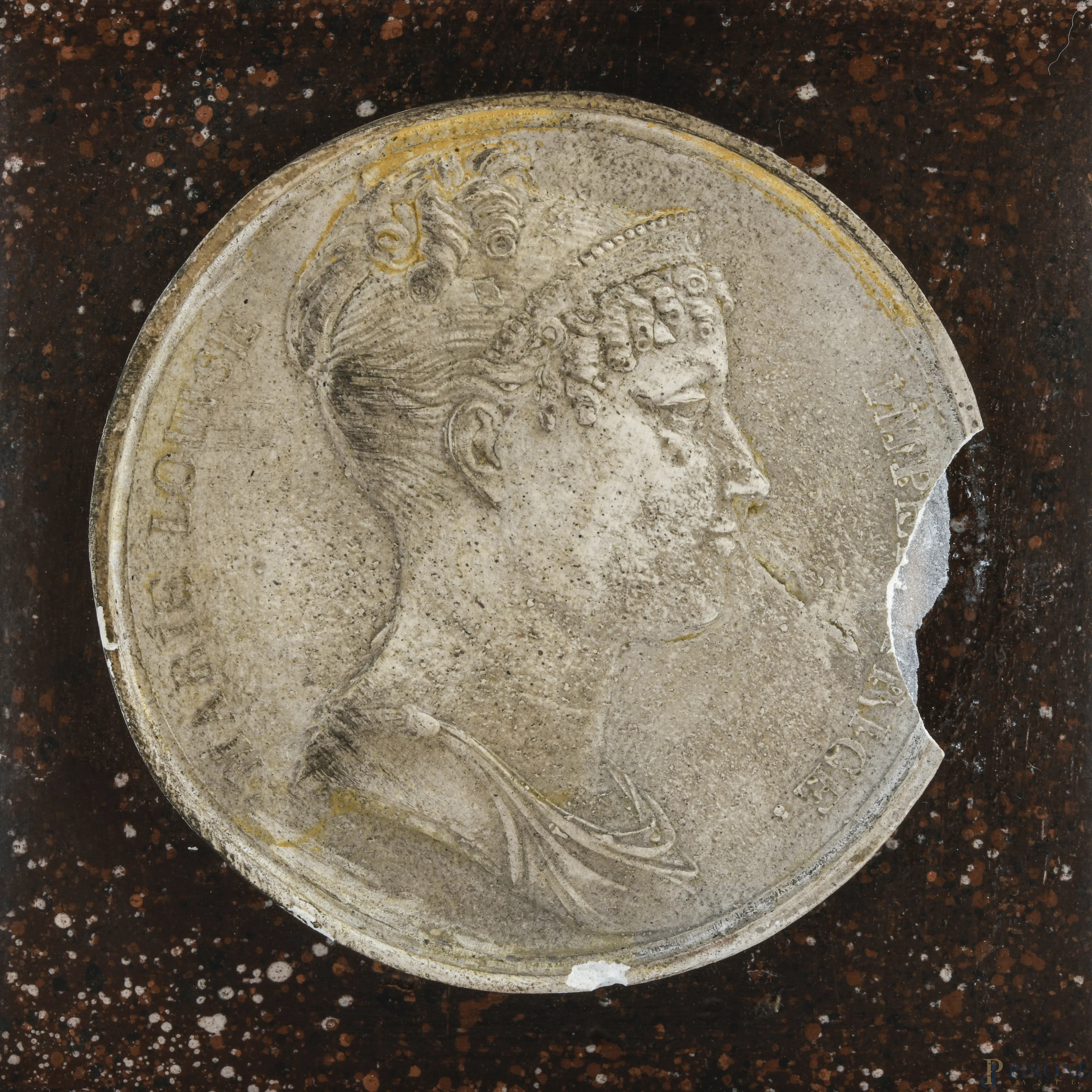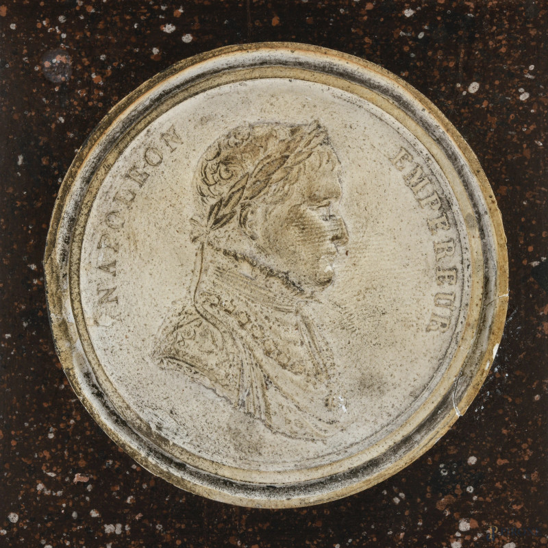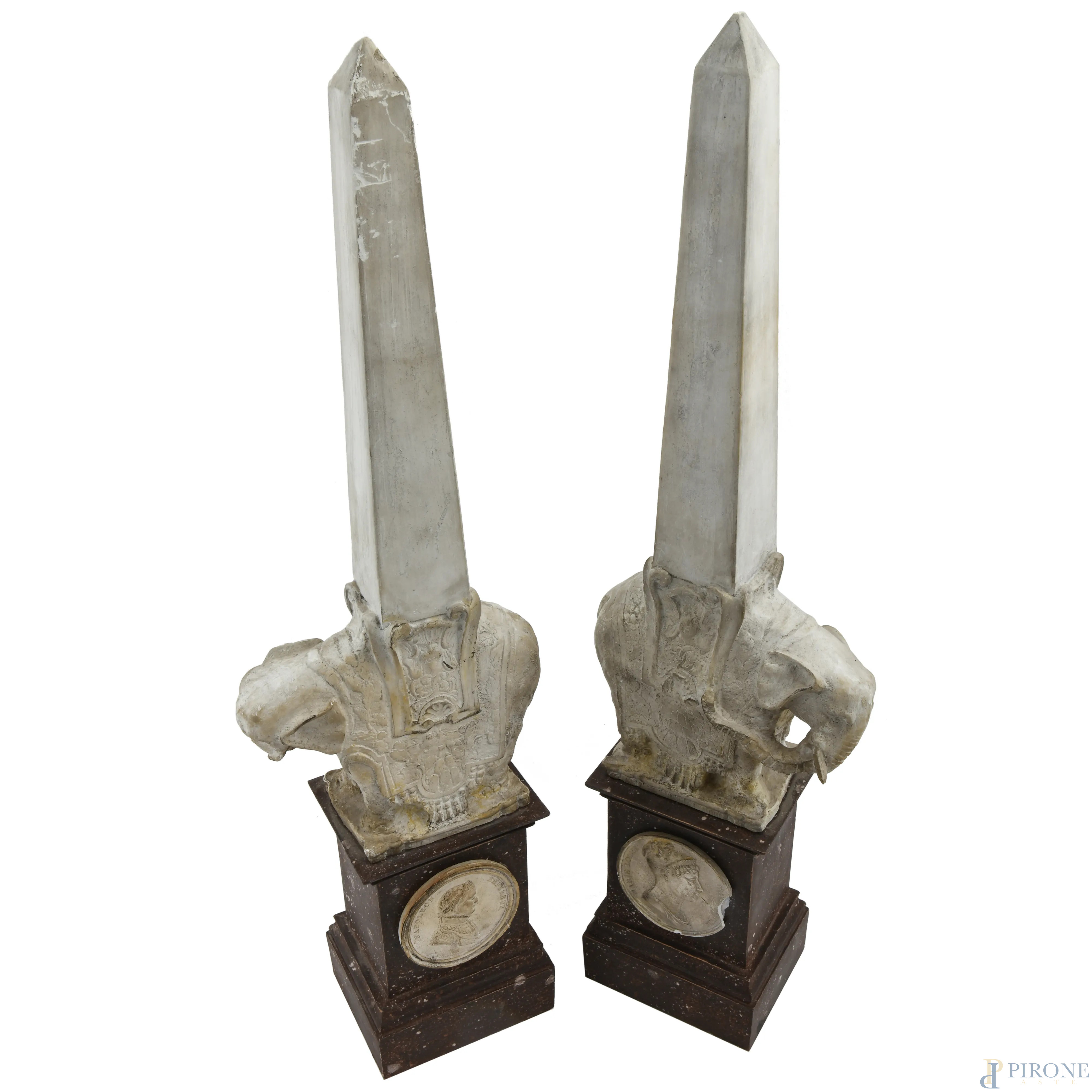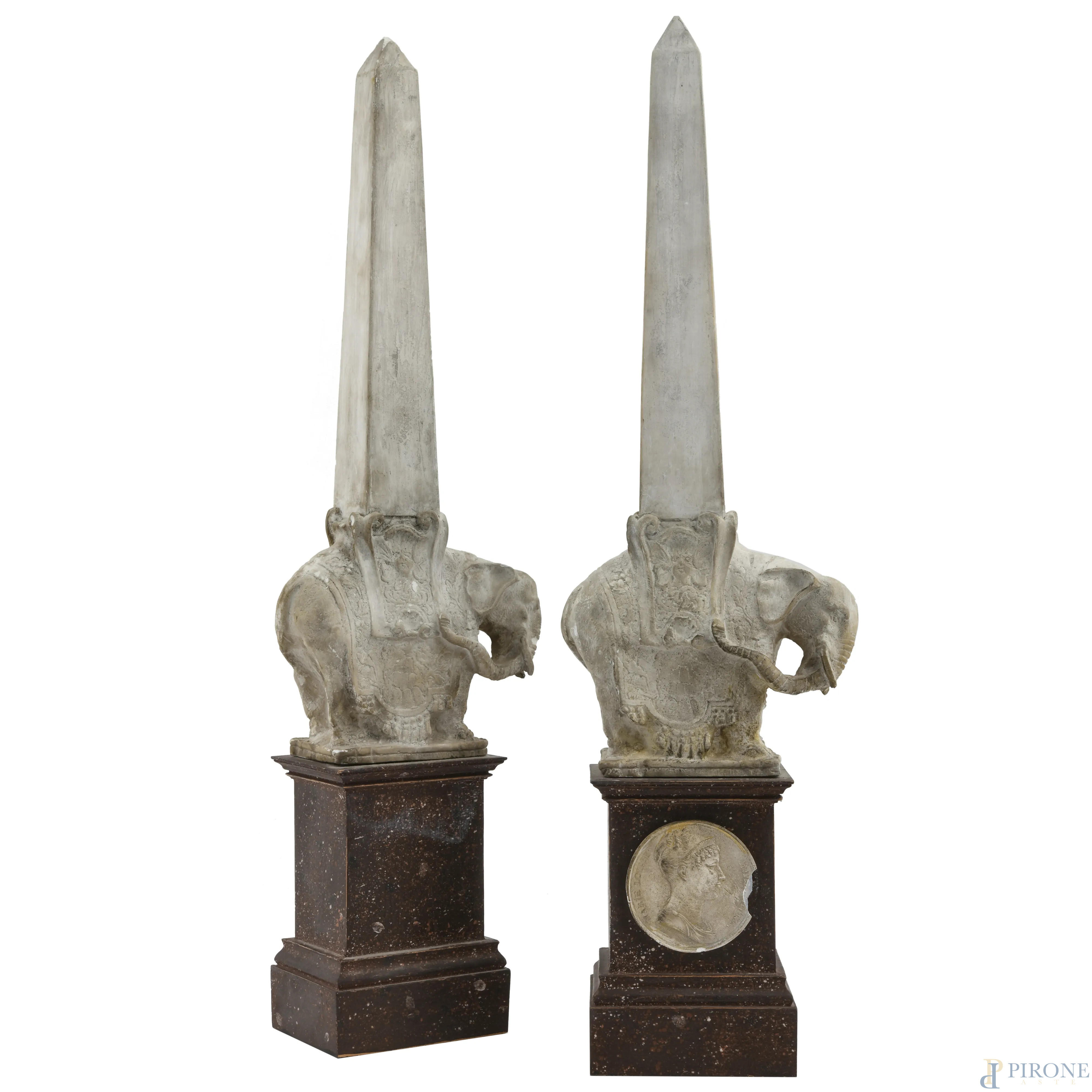 Coppia di obelischi crisoelefantini in stucco e legno a finto marmo con cammei degli imperatori Napoleone e Maria Luisa, XX secolo, altezza cm 54,5, (segni di usura, scalfiture, difetti)