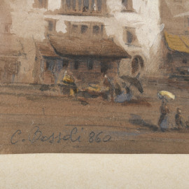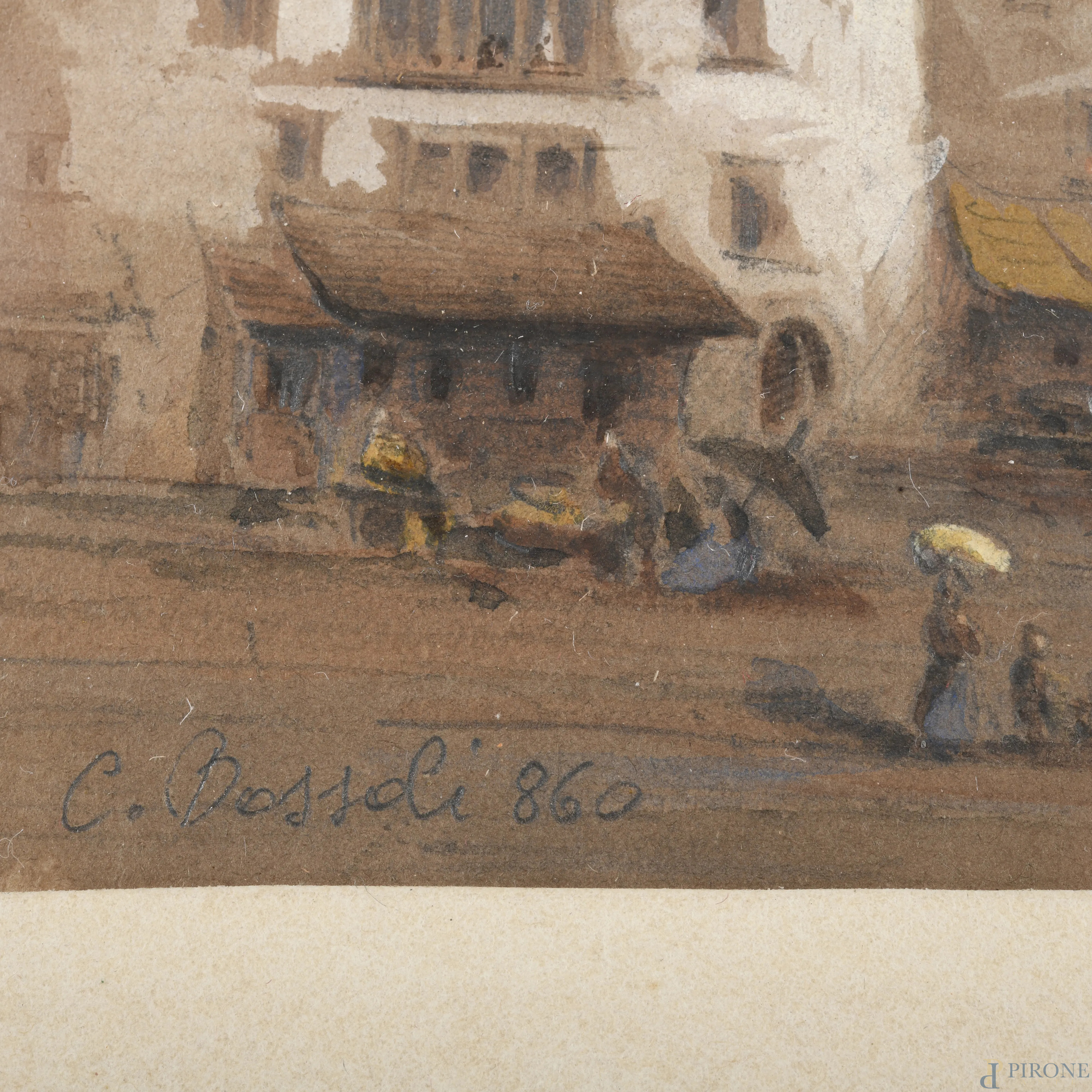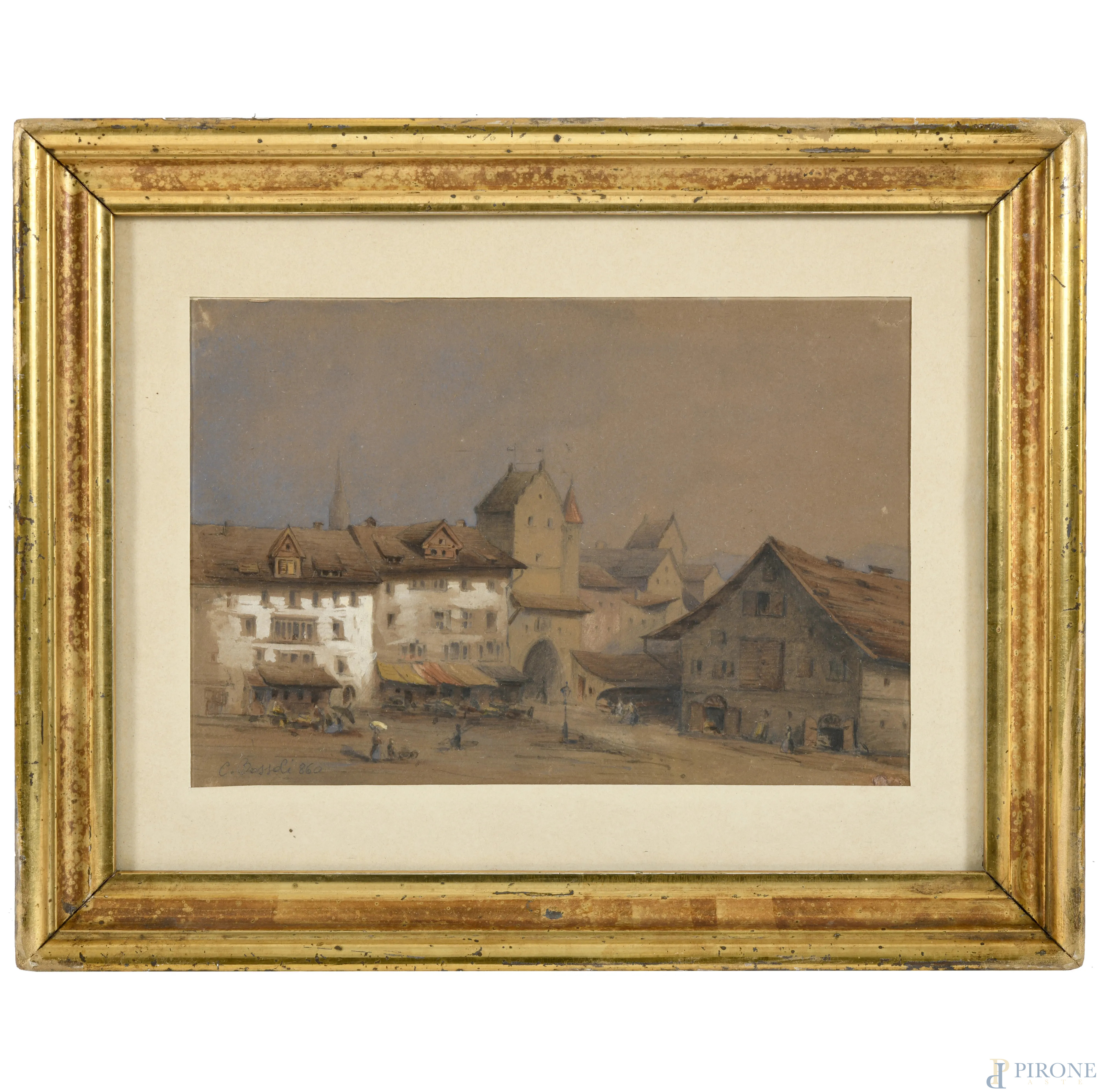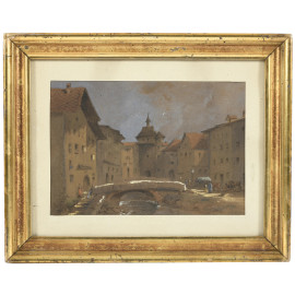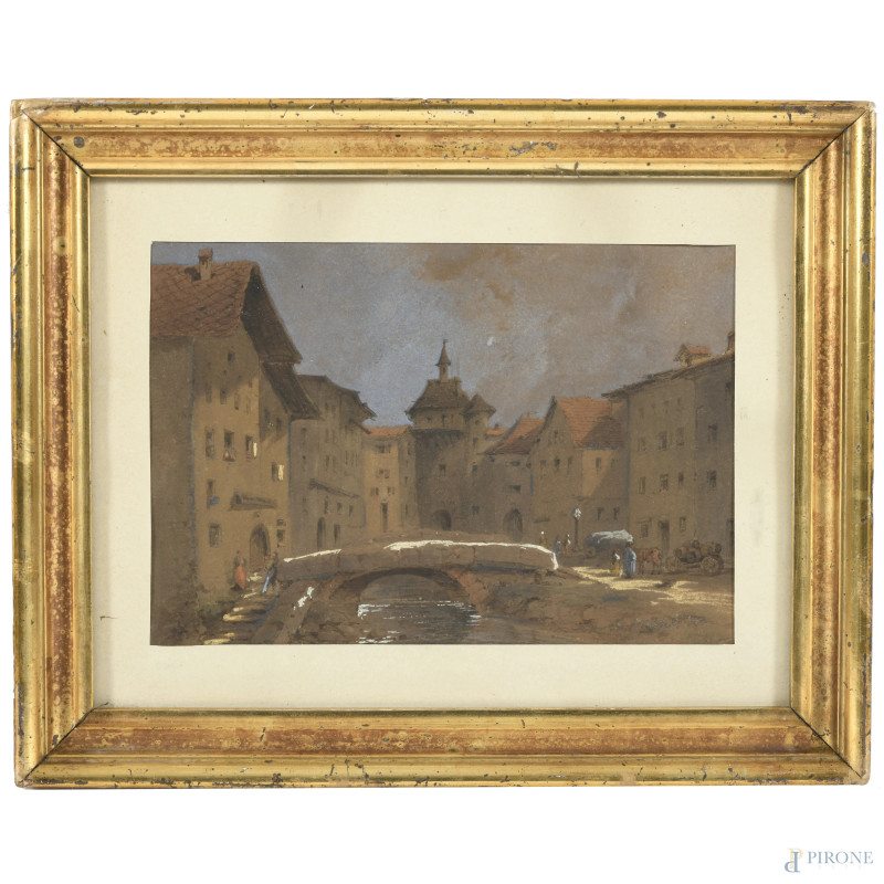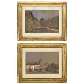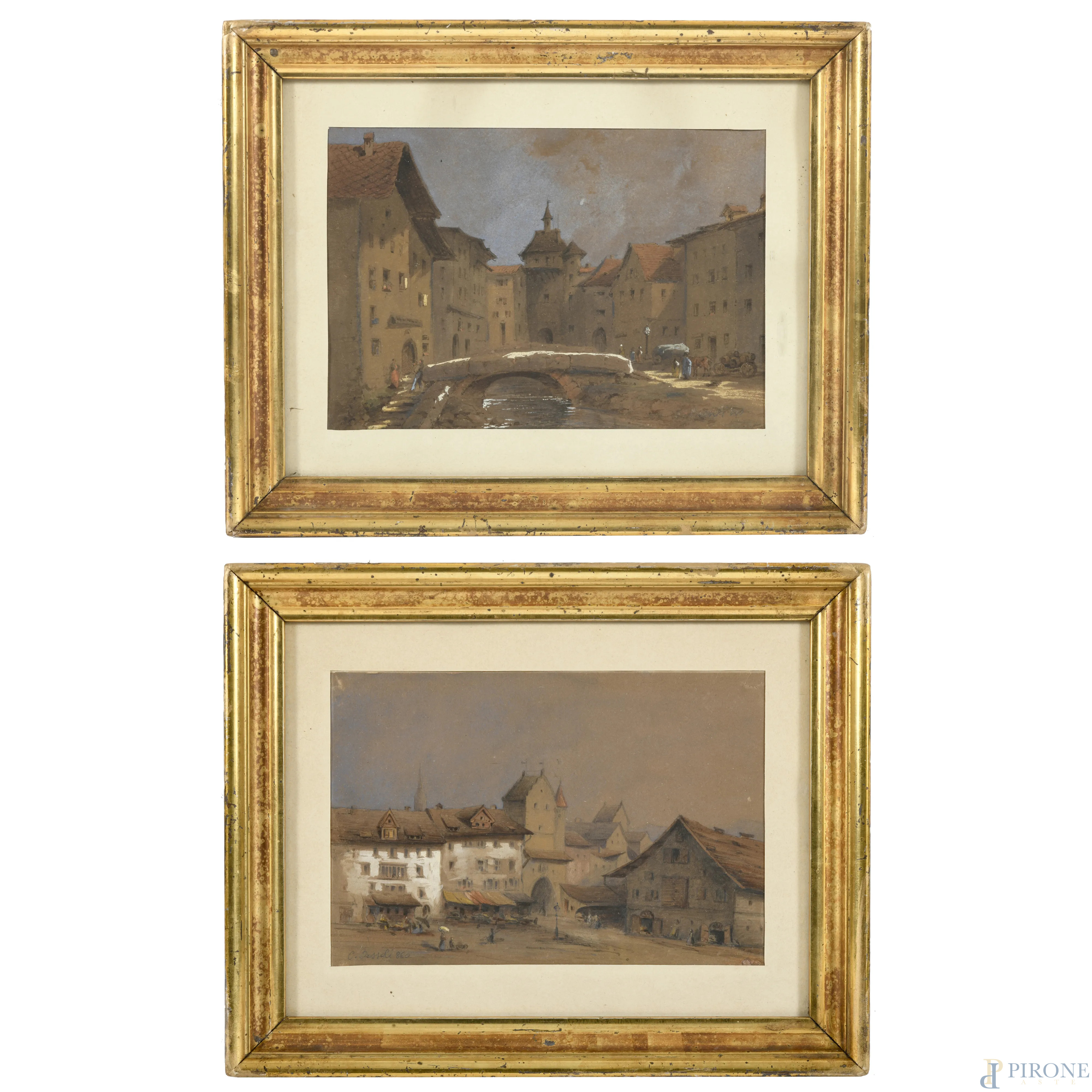 Coppia di scorci di città nordiche, XIX secolo, tecnica mista su carta, cm 12,5x19, firmati e datati "1860", entro cornice