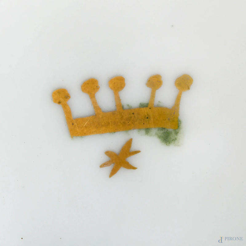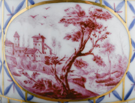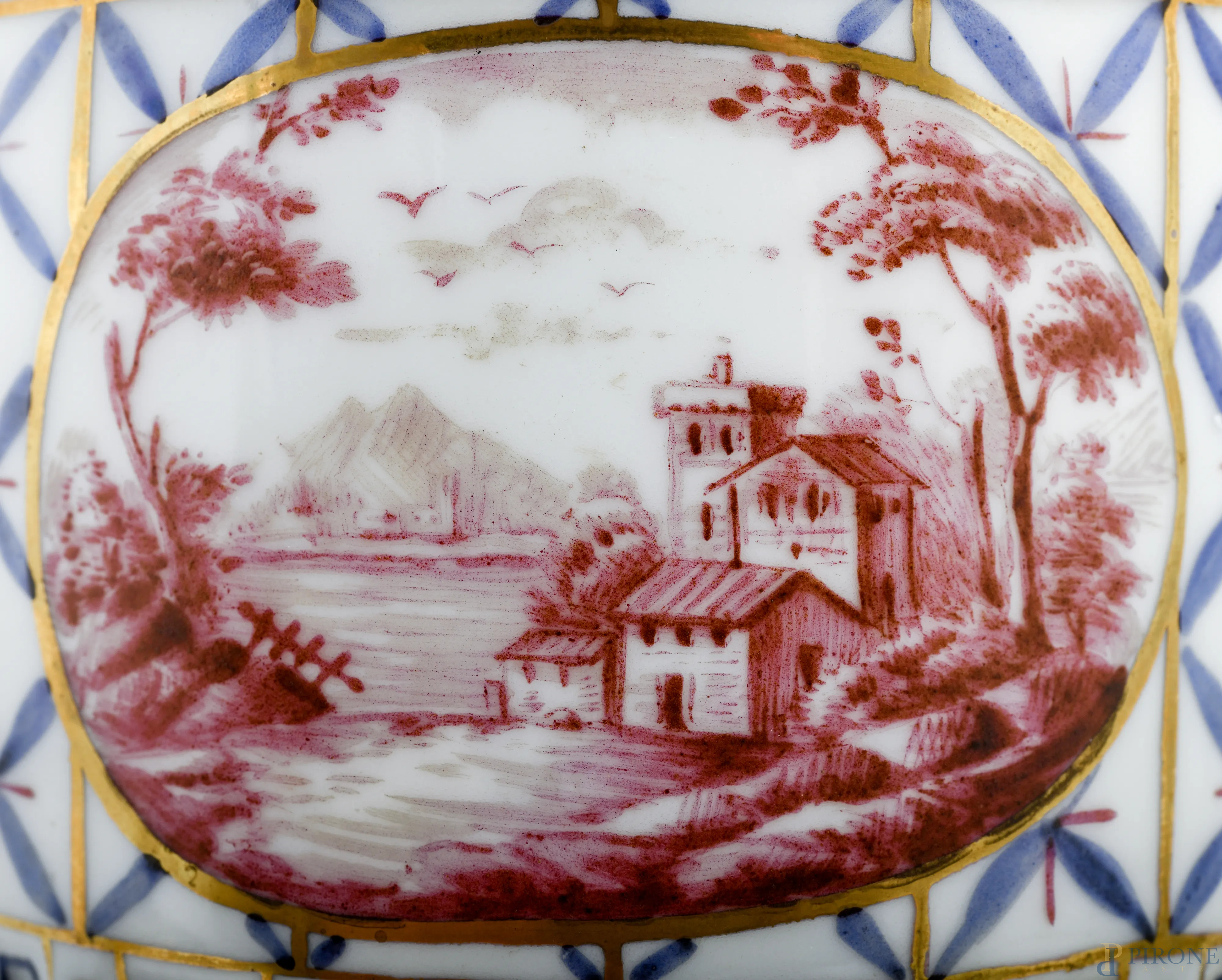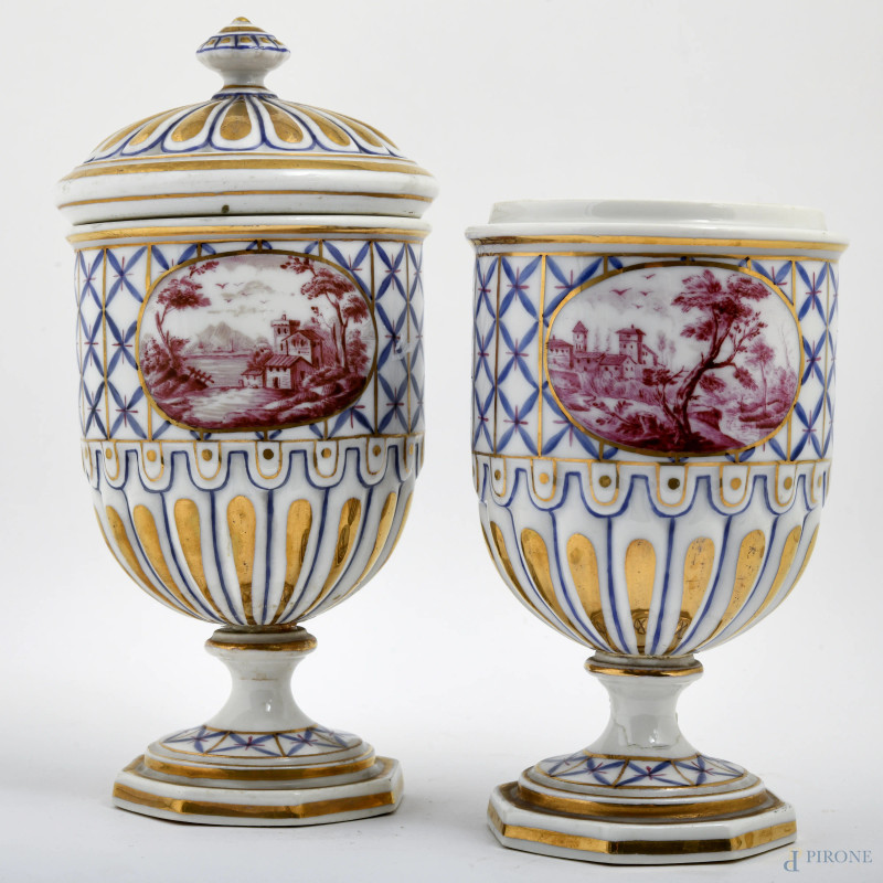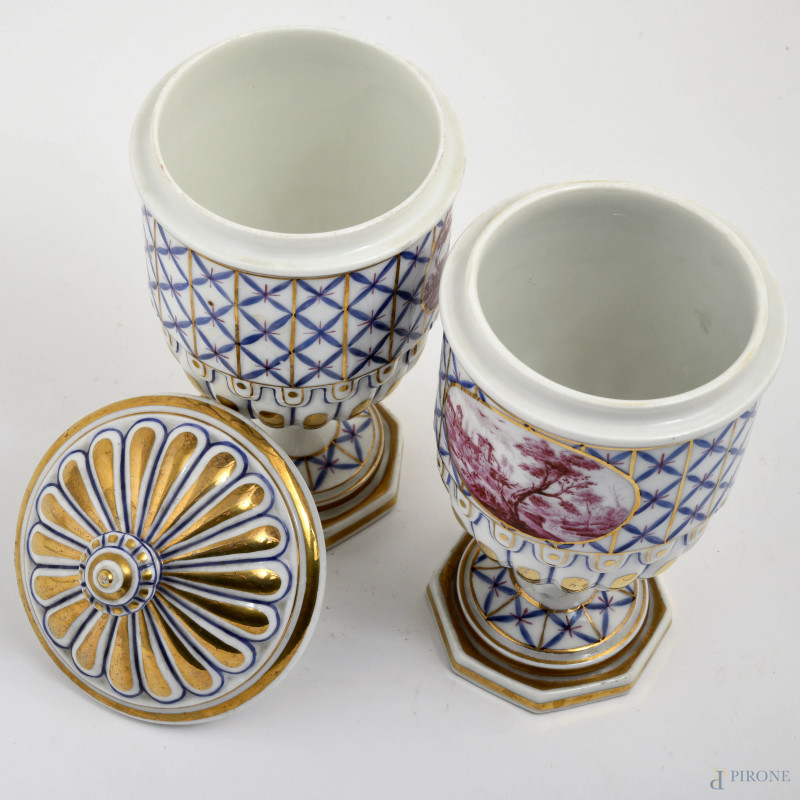 Coppia di vasetti in porcellana dipinta e dorata decorata a motivi geometrici e scene di paesaggio, XIX-XX secolo, altezza cm 22,5 (un coperchio mancante)
