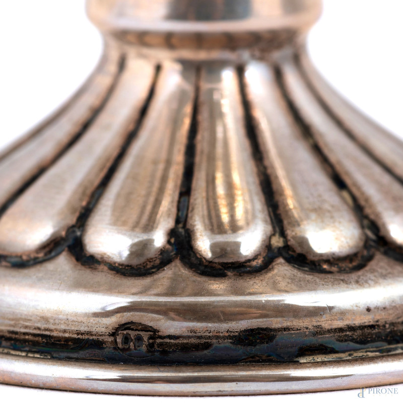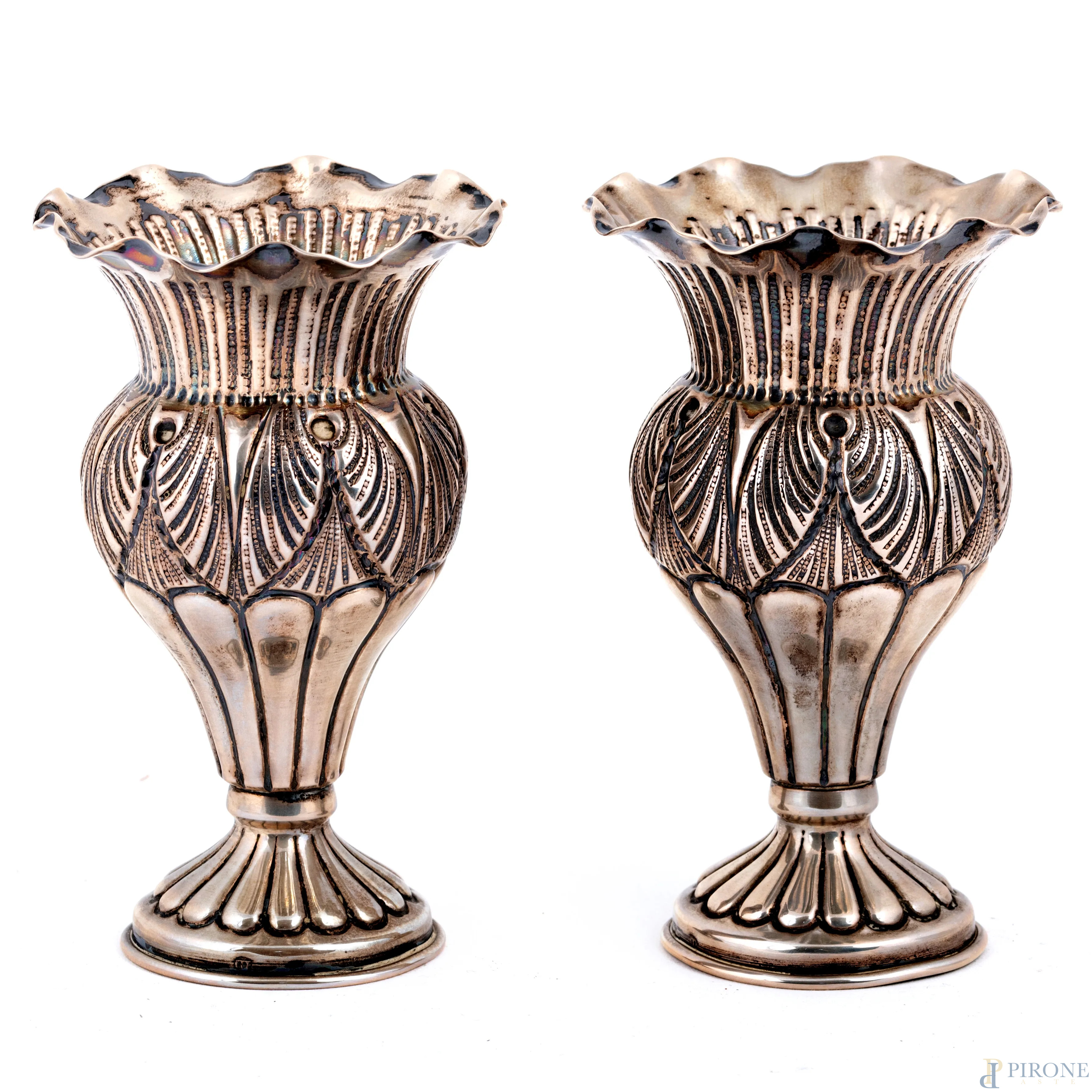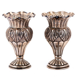 Coppia di vasi a tulipano in argento 800/000 finemente cesellato, altezza cm 12, peso complessivo gr 150