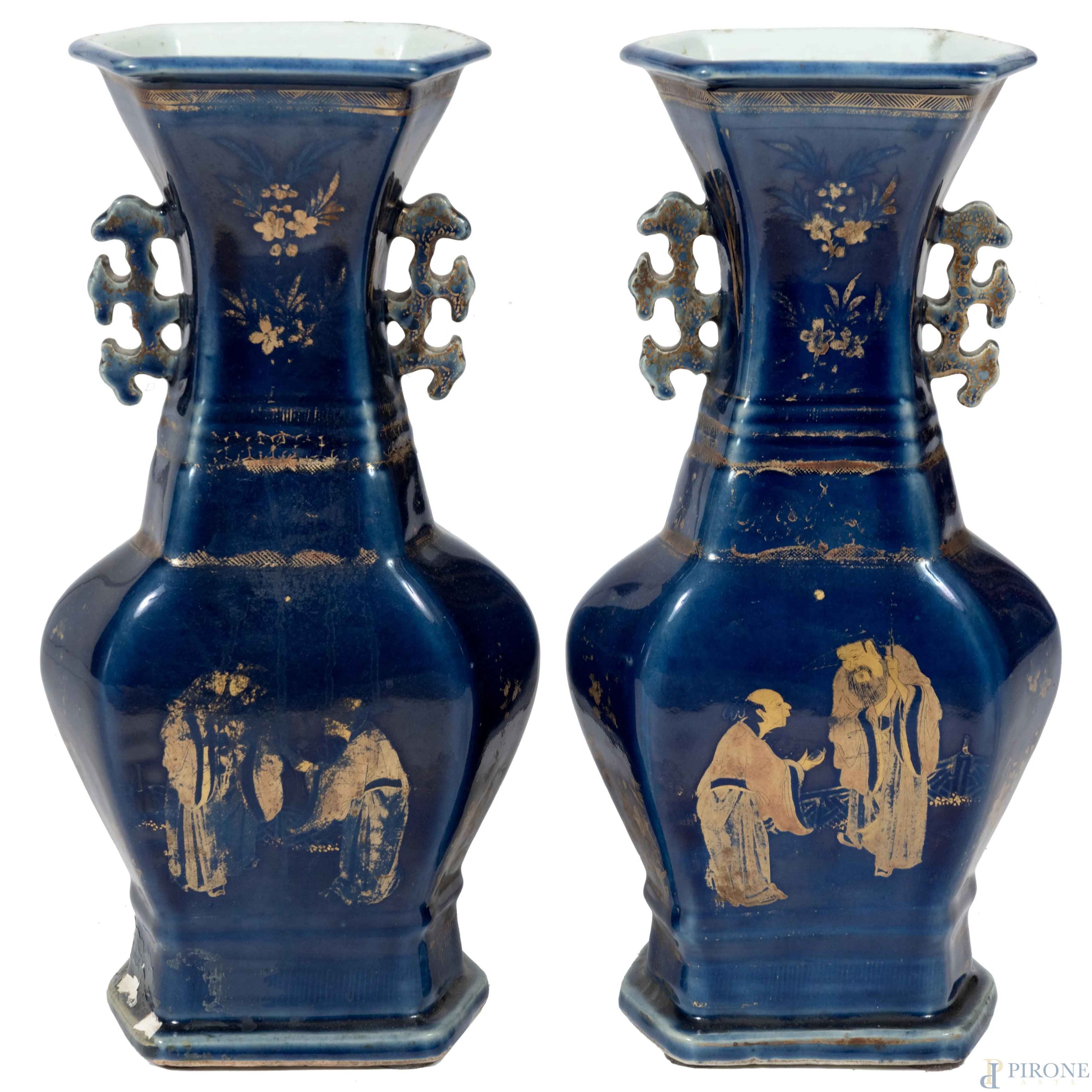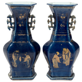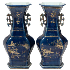 Coppia di vasi in porcellana cinese nei toni del blu con decori oro, XIX secolo, altezza cm 40, (segni di usura, felature, caduta di smalto, scalfiture, restauri e difetti di cottura)