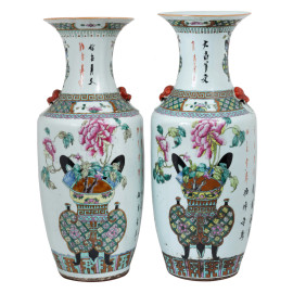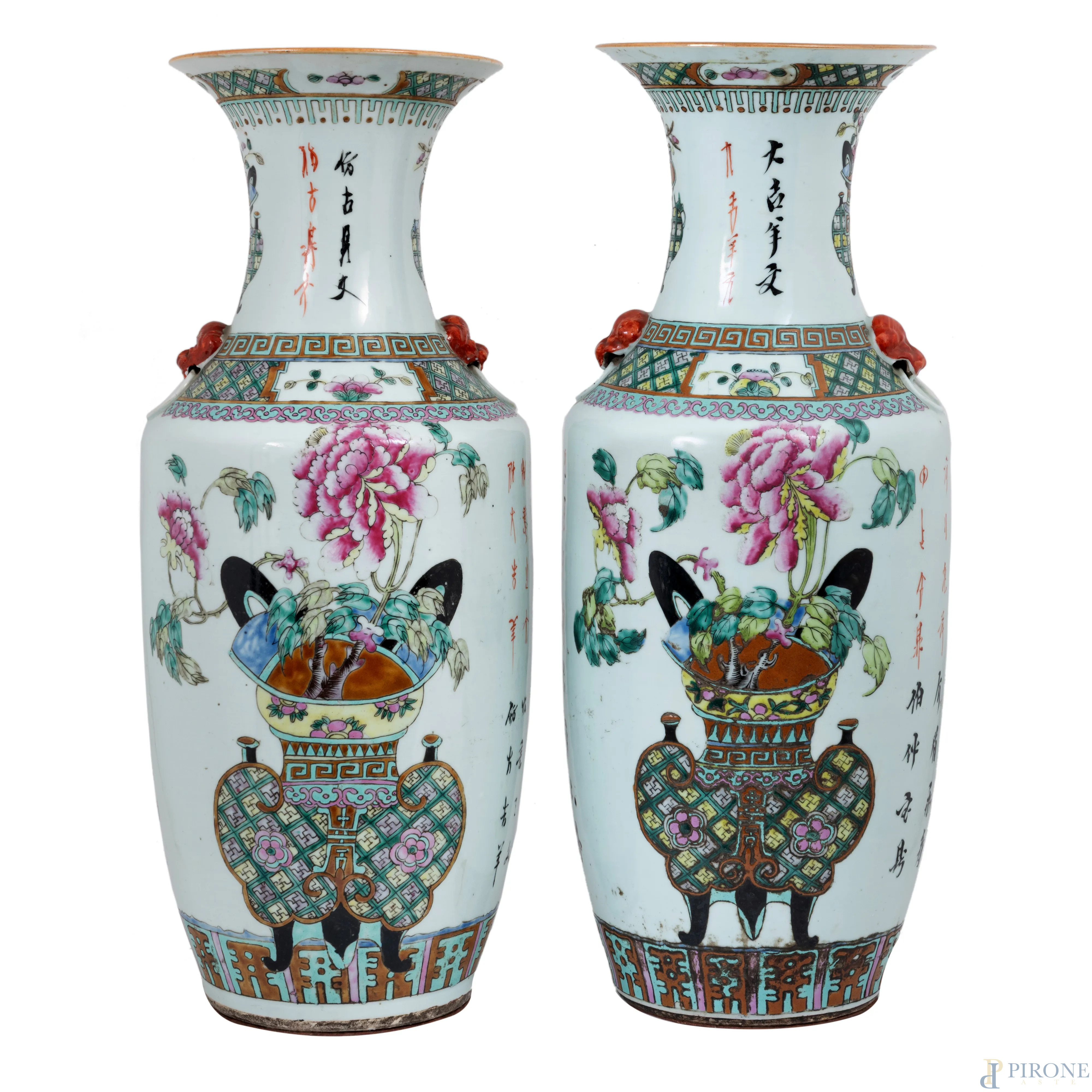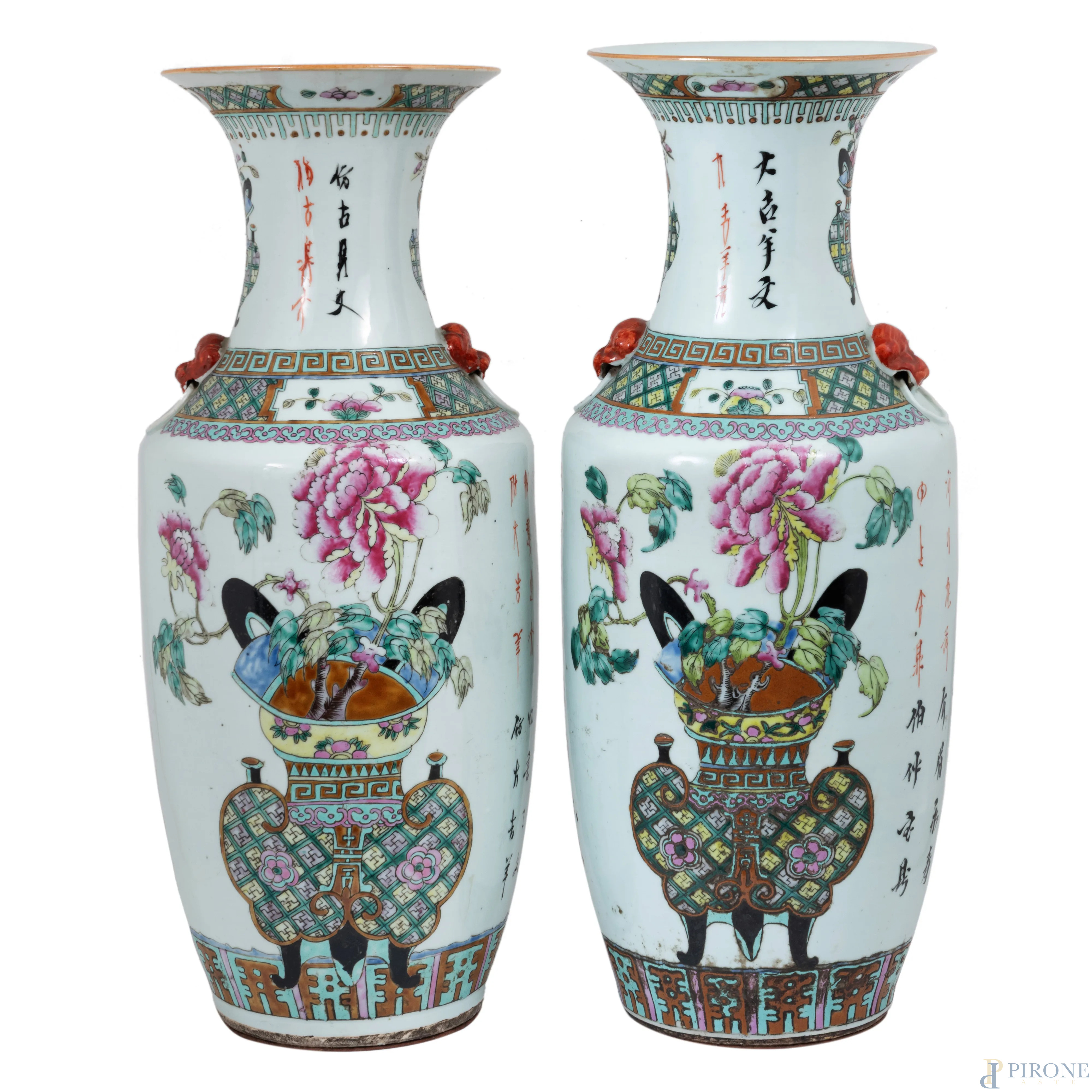 Coppia di vasi in porcellana cinese policroma decorata a motivi floreali, geometrico e ideogrammi, XX secolo, altezza massima cm 59, (segni di usura, difetti di cottura)