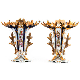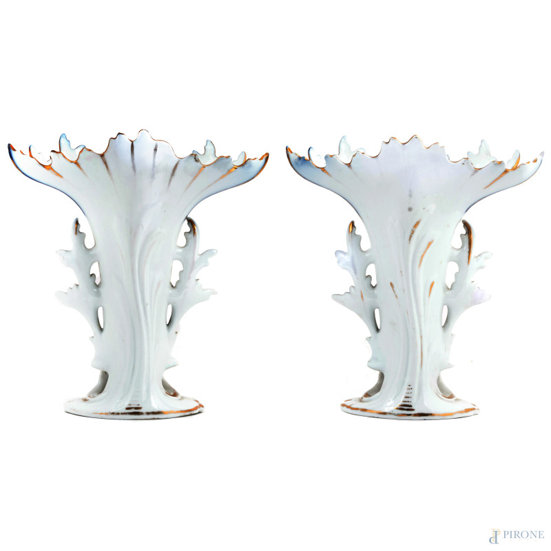 Coppia di vasi Luigi Filippo in porcellana bianca, blu e oro decorati a motivi floreali, XIX secolo, altezza cm 33 (segni di usura, perdita di doratura, restauri)