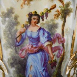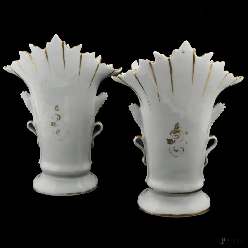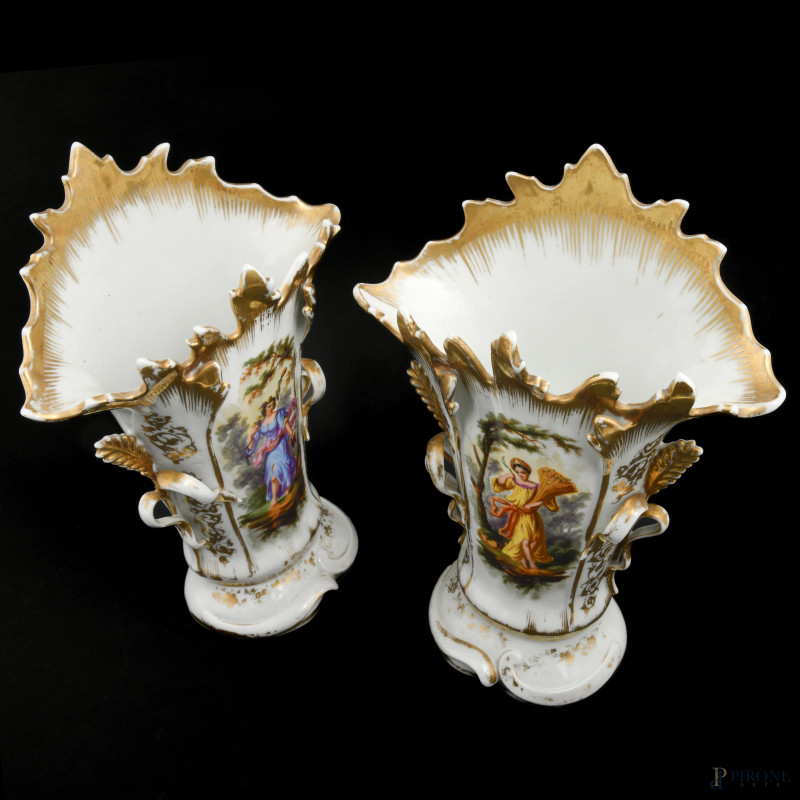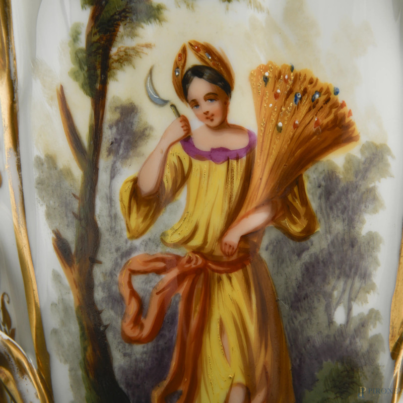 Coppia di vasi Luigi Filippo in porcellana bianca e oro con Allegoria dell'Estate e dell'Autunno, XIX secolo, altezza cm 38 (segni di usura, perdita di doratura, restauri)