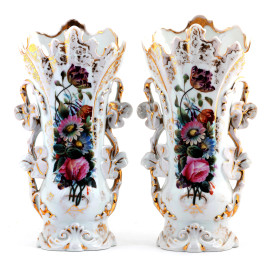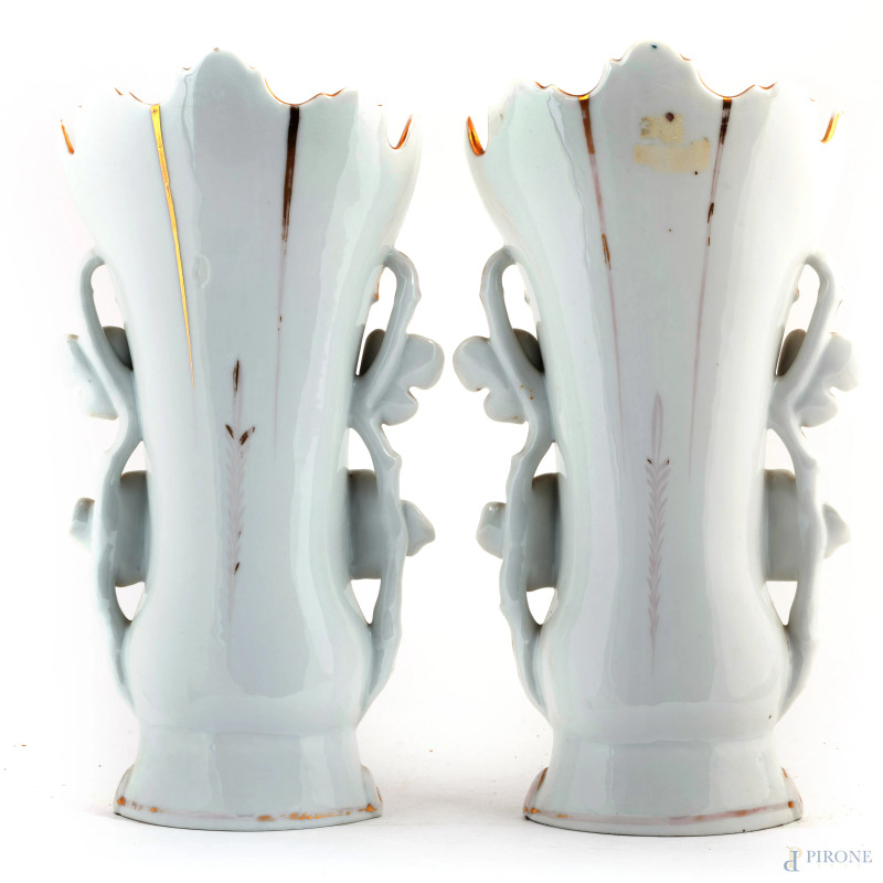 Coppia di vasi Luigi Filippo in porcellana bianca e oro decorati a motivi floreali, XIX secolo, altezza cm 40, (segni di usura, perdita di doratura)