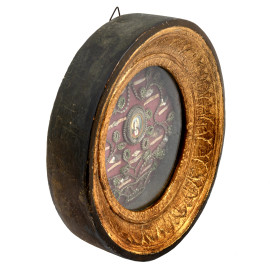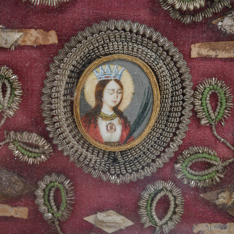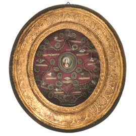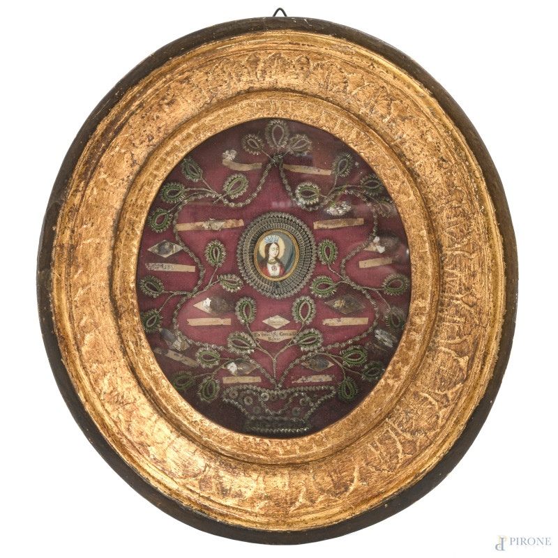 Cornice in legno dorato a serto circolare contenente ex voto, XIX secolo, misure complessive cm 22,5x22