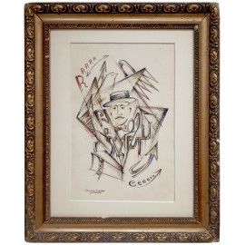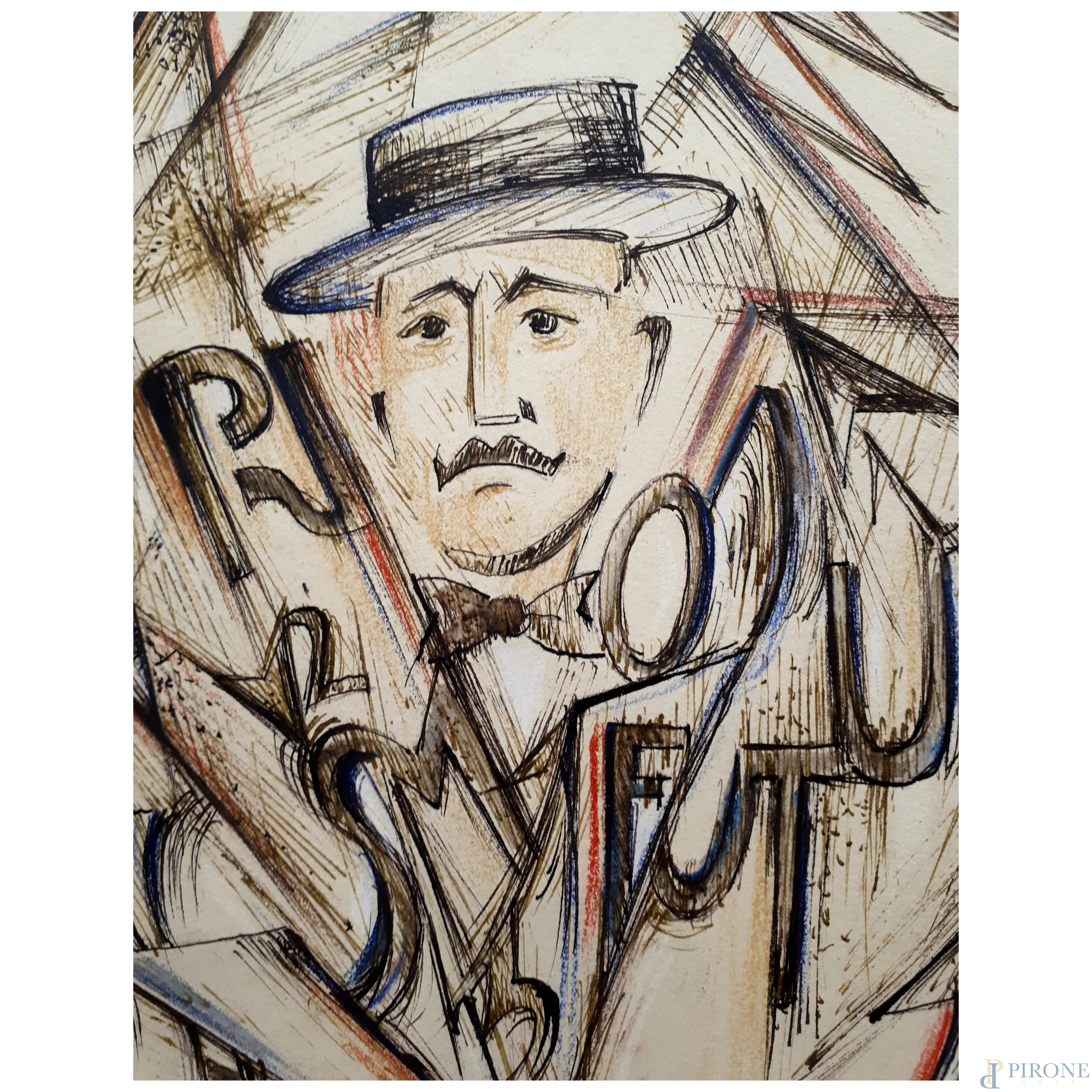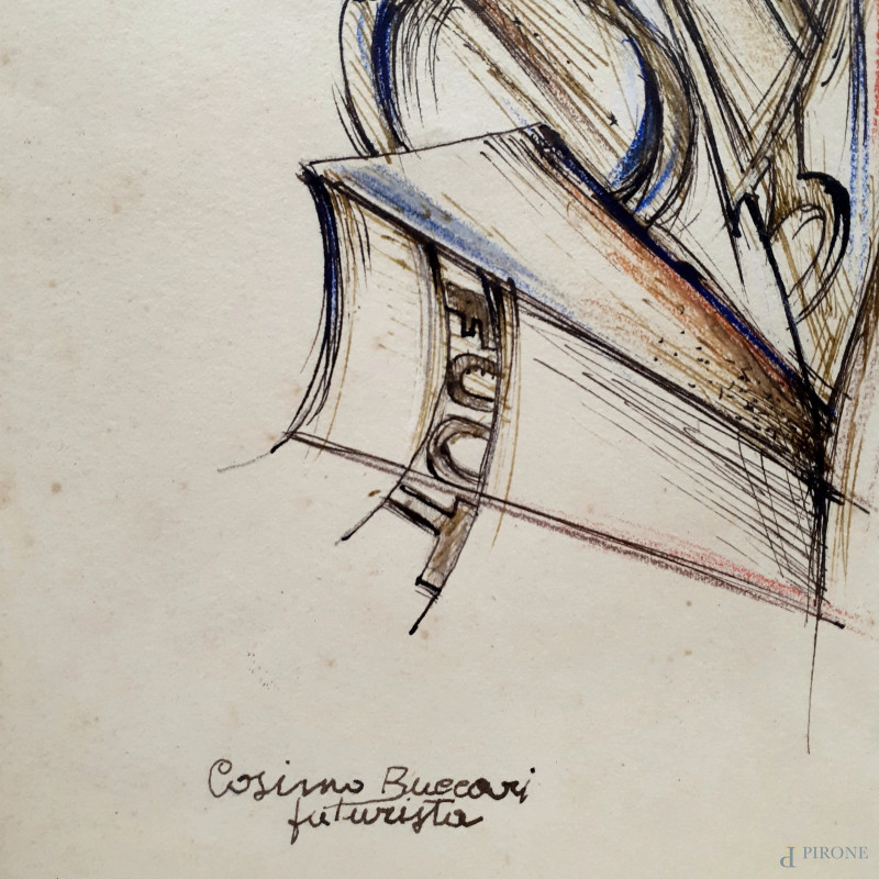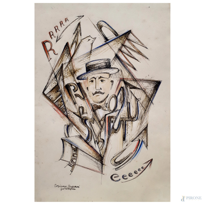 Cosimo Buccari (XX sec.) Composizione con parole libere, tecnica mista su carta, cm 33x22, firmato “Cosimo Buccari Futurista” in basso a sinistra, con cornice
