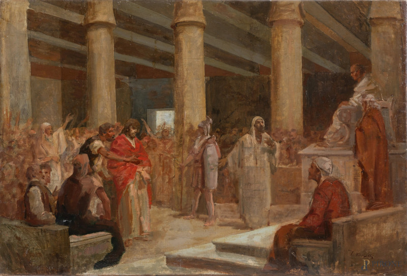 Cristo davanti a Pilato, XIX-XX secolo, olio su tela, cm 51x76, firmato in basso a destra, (piccole abrasioni)