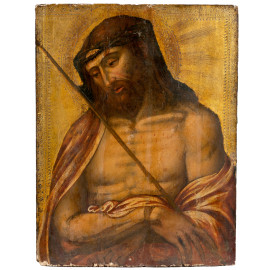 Ecce homo, XIX secolo, tempera su tavola, cm 56,5x44, (segni di usura, cadute di colore, fori di tarlo, fessurazioni, restauri)