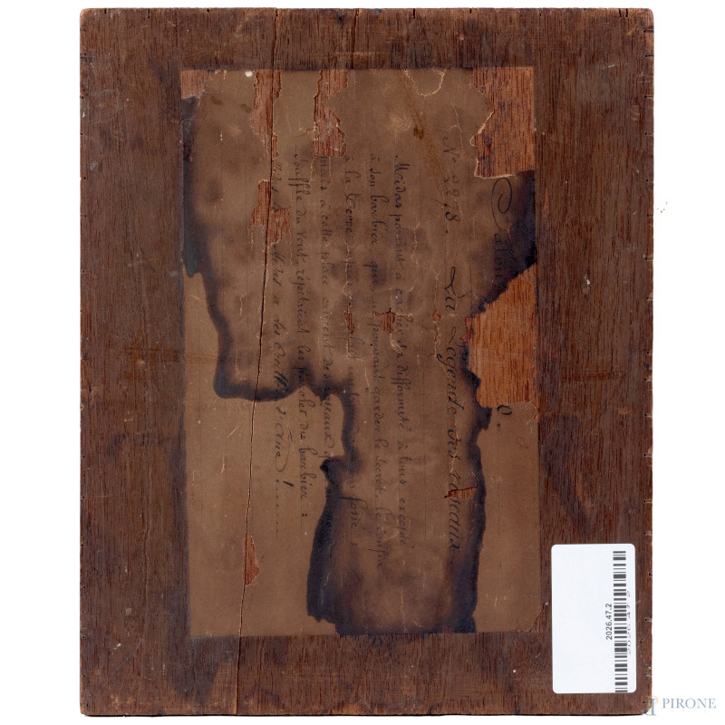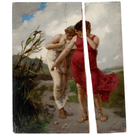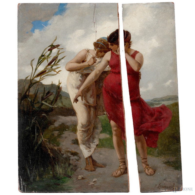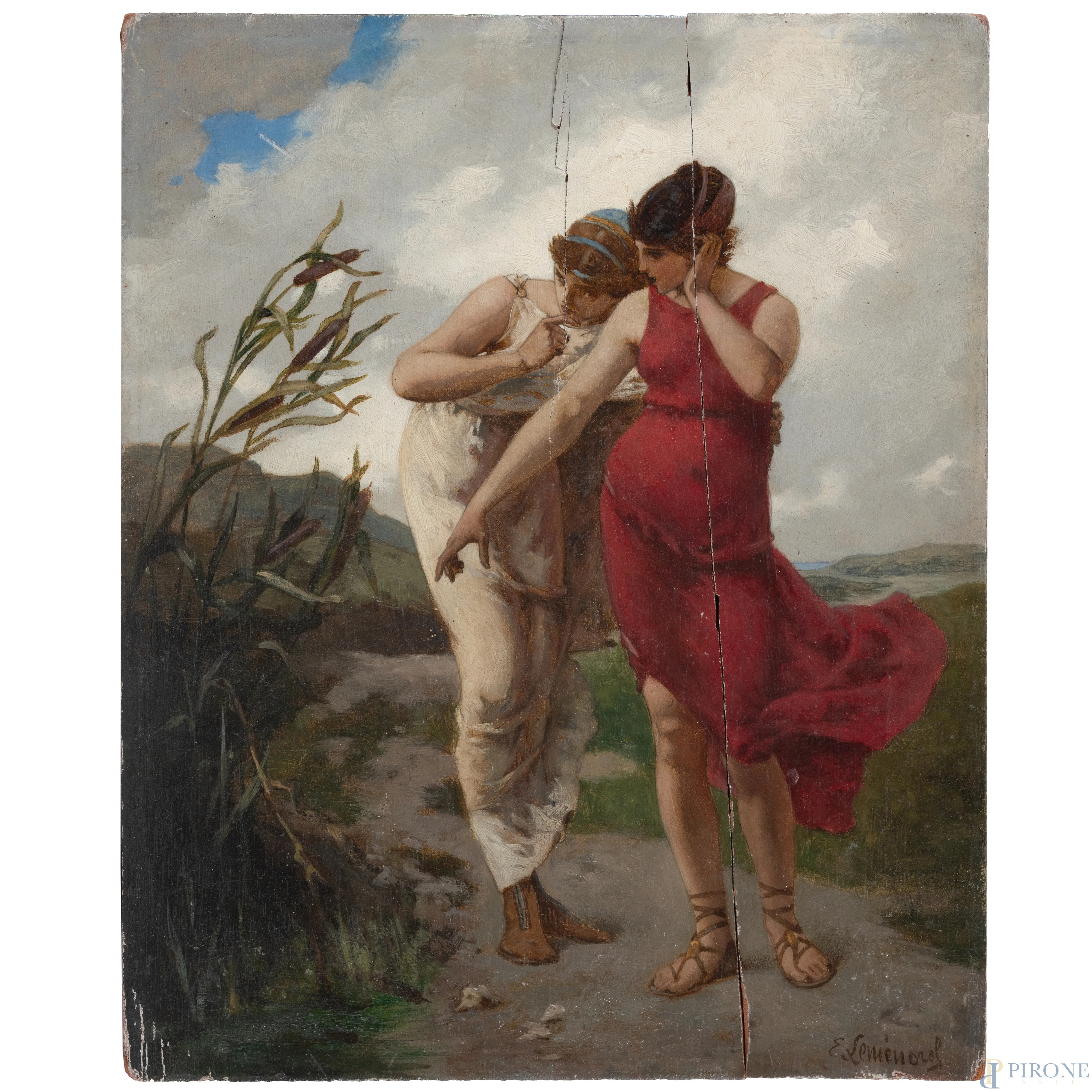 Ernest Émile Lemenorel (1848-1934), La légende des roseaux, XIX secolo, olio su tavoletta, cm 27x22, firmato in basso a destra (rottura netta e fessurazioni del supporto)