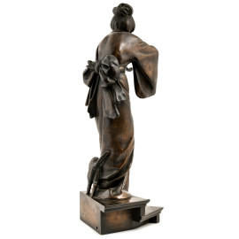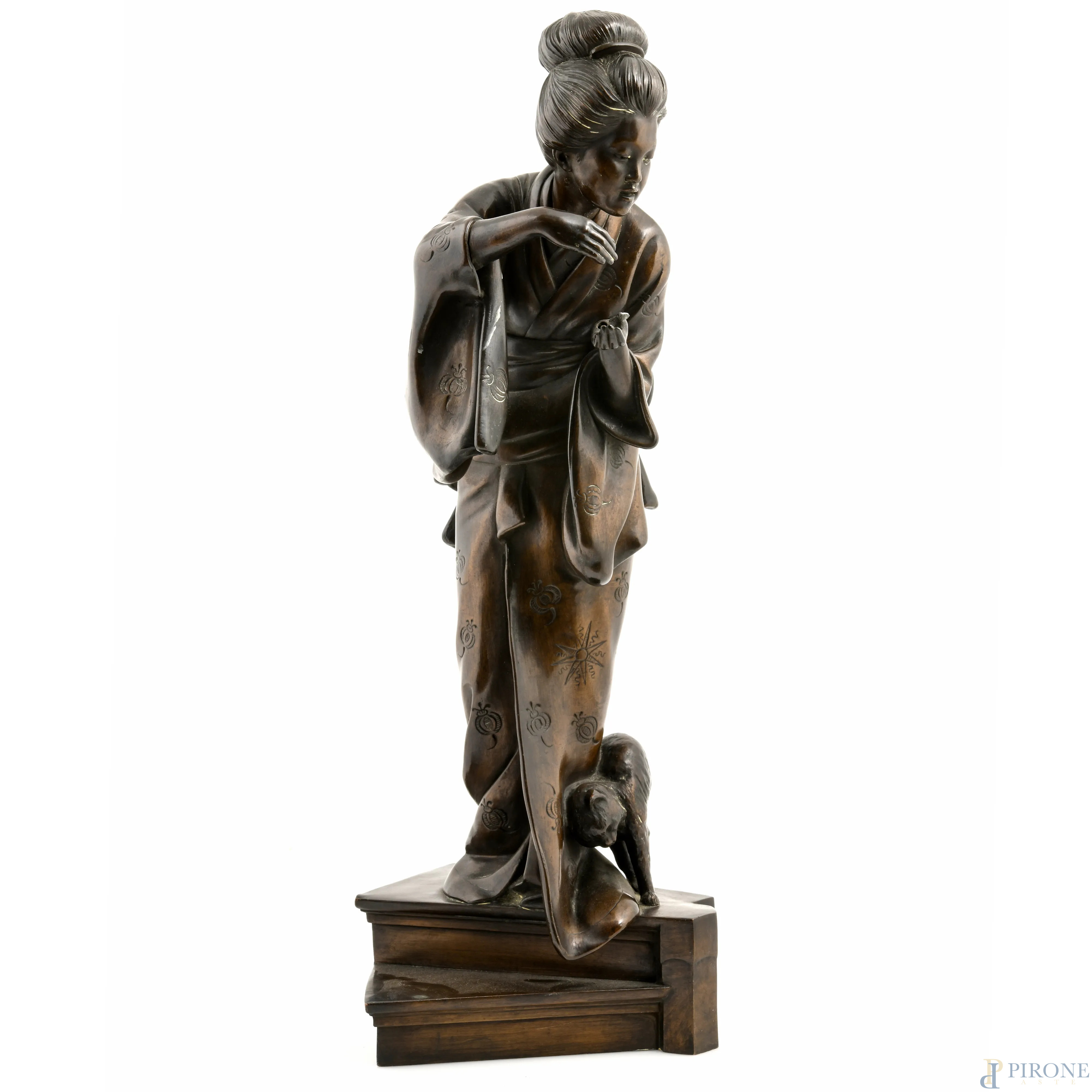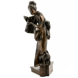 Fanciulla cinese con gatto, XX secolo, scultura in bronzo, altezza cm 63, (lievi segni di usura, mancanze)