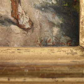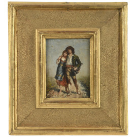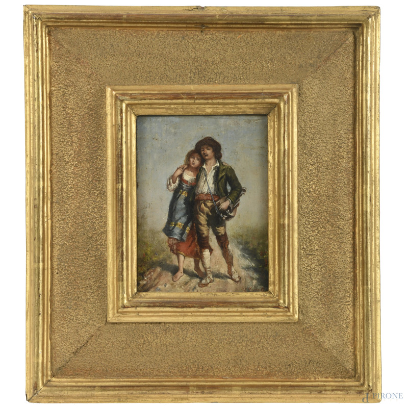 Gli innamorati, XIX secolo, olio su tavoletta, cm 16x11,5, firmato in basso a destra, entro cornice, (lievi e superficiali segni di usura del tempo)