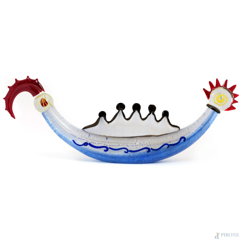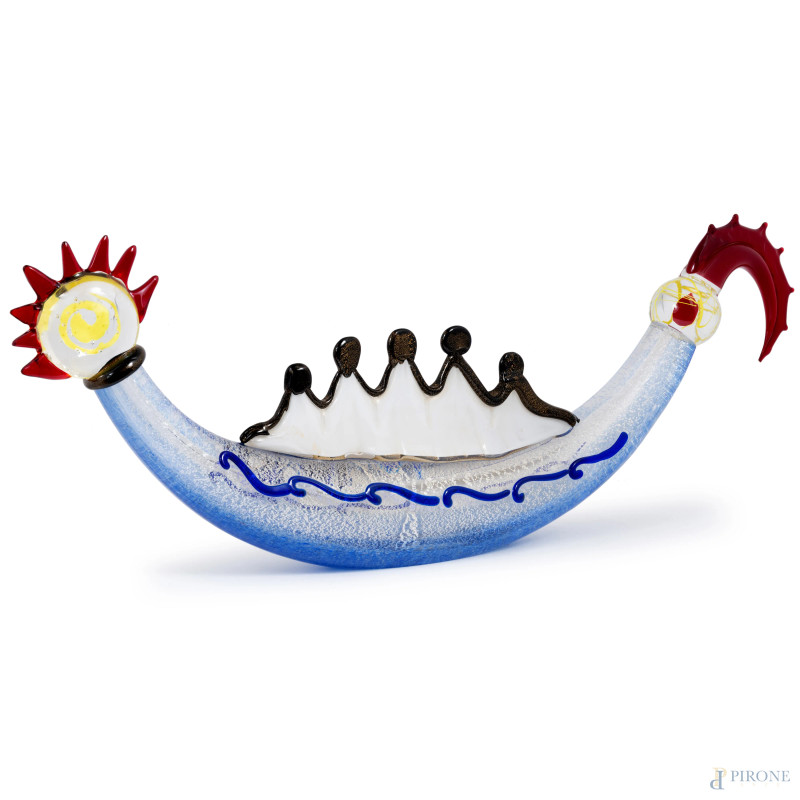 Gondola in vetro di Murano, XX secolo, firmato a graffio al fondo "S.Toso Murano", cm 31,5x84
