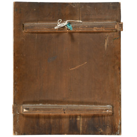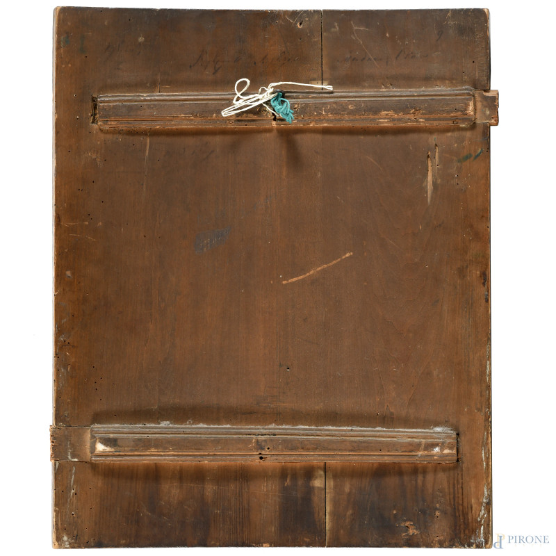 Icona raffigurante Crocifissione, XIX-XX secolo, olio su tela con inserto di croce in bronzo cesellato e smaltato, cm 53,5x43,5, (segni di usura, scalfiture, cadute di colore, difetti)