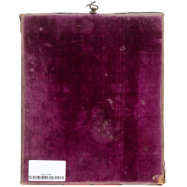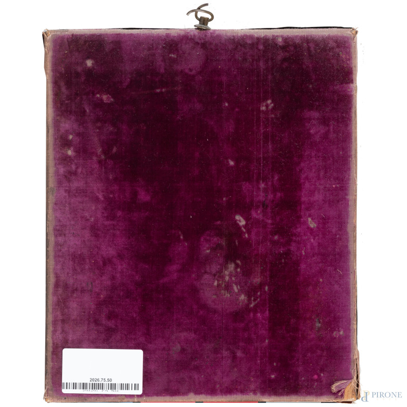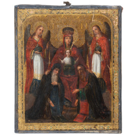 Icona raffigurante Vergine in trono con Bambino, angeli e due santi, XIX secolo, tempera su tavola con profilo in argento, cm 26,5x22, (segni di usura, sollevamenti e cadute di colore e doratura)