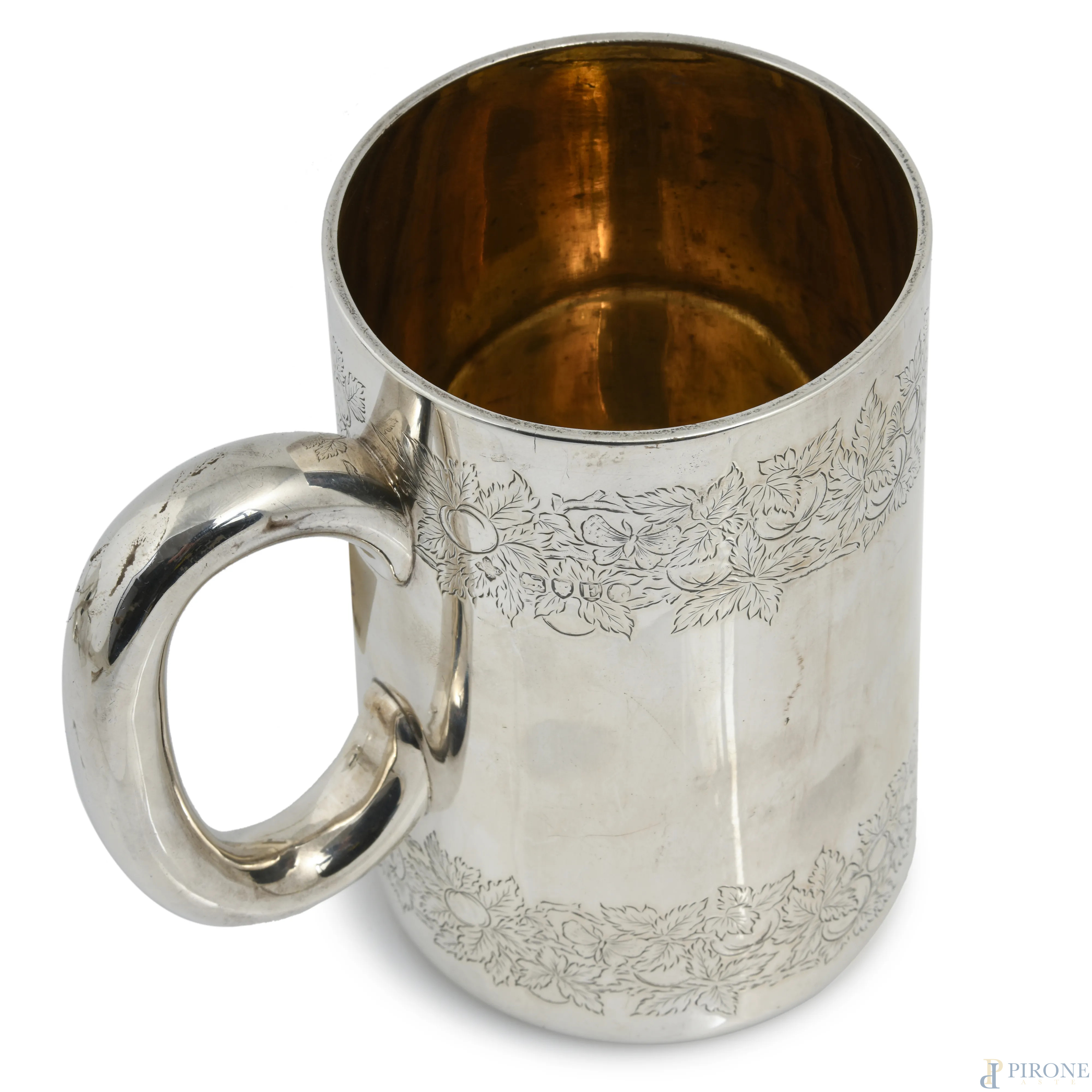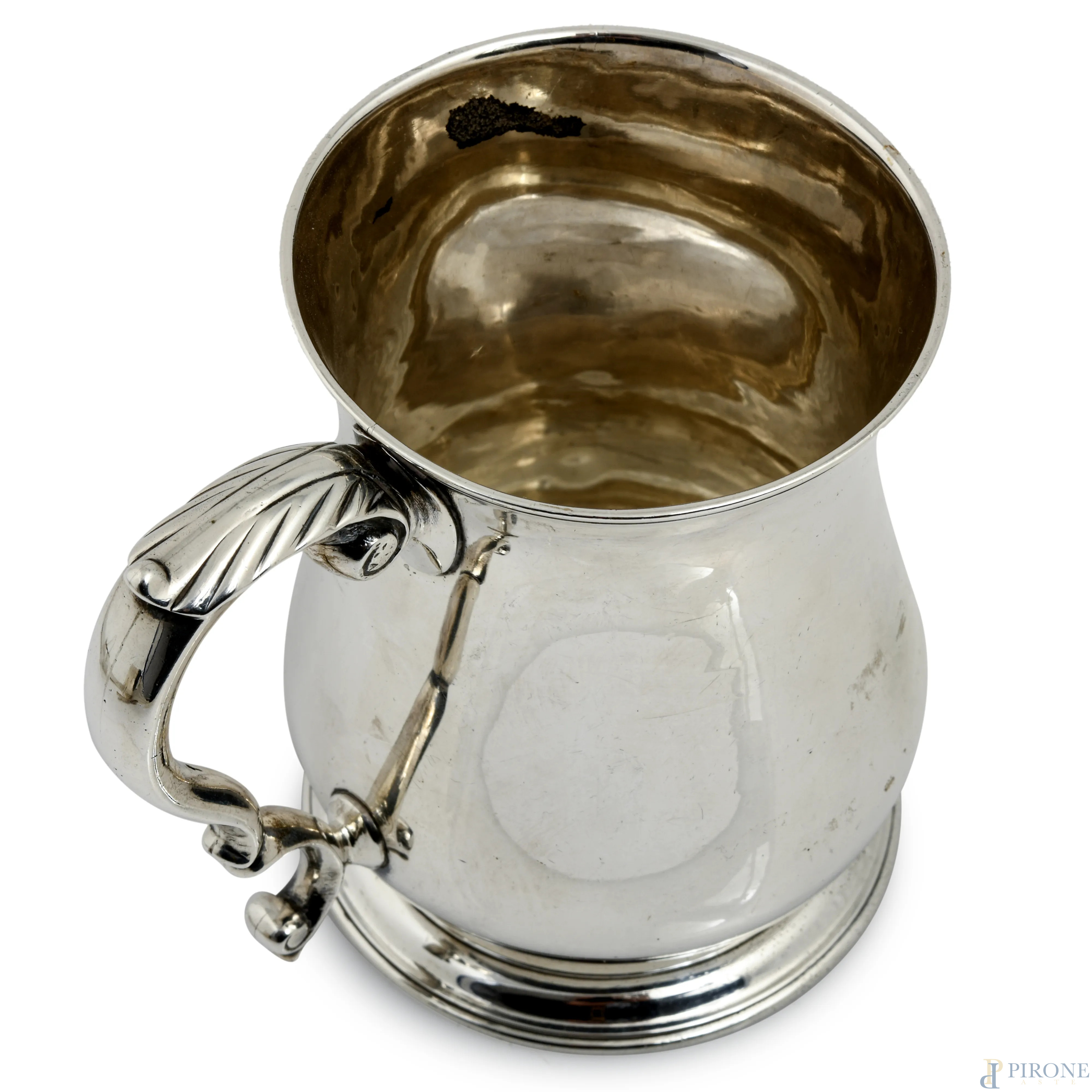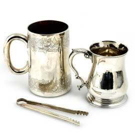 Lotto composto da due boccali e una pinza per ghiaccio in argento, XX secolo, altezza massima cm 15,5, peso complessivo gr 980