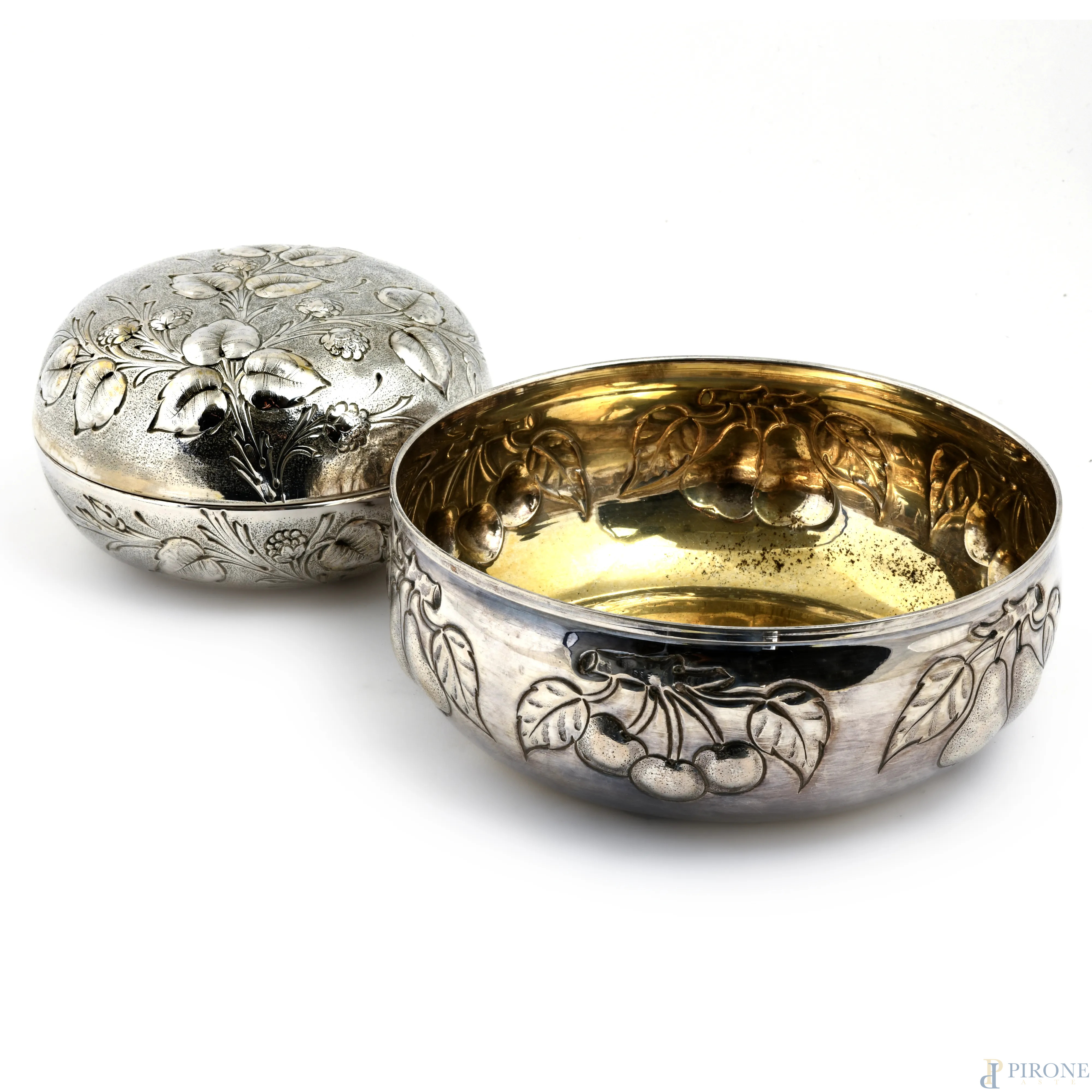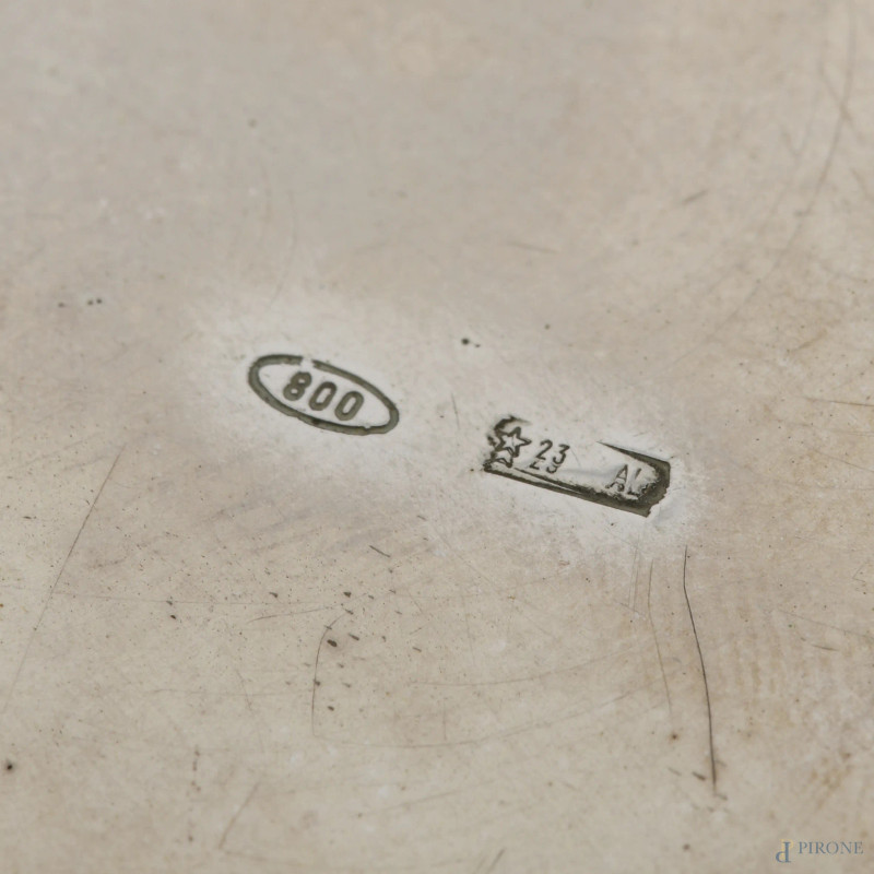 Lotto composto da porta bon-bon e centrotavola in argento 800/000 e interno vermeil, misure massime cm 7x18,5, peso complessivo gr 780