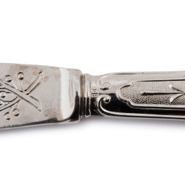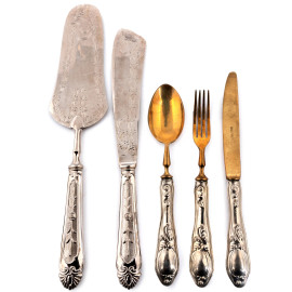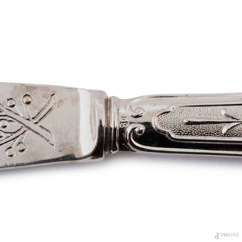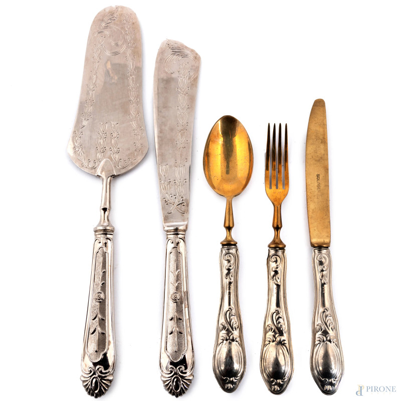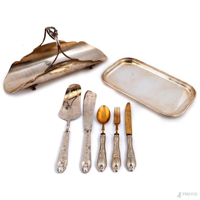 Lotto composto da portagrissini, posate e vassoietto in metallo argentato, misure massime cm 14,5x30x10, (segni di usura)