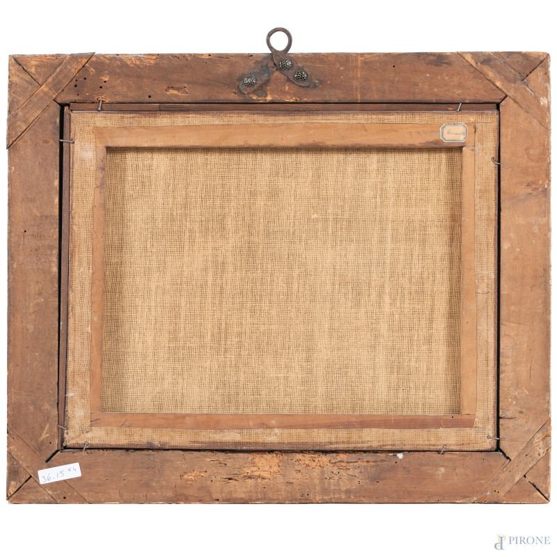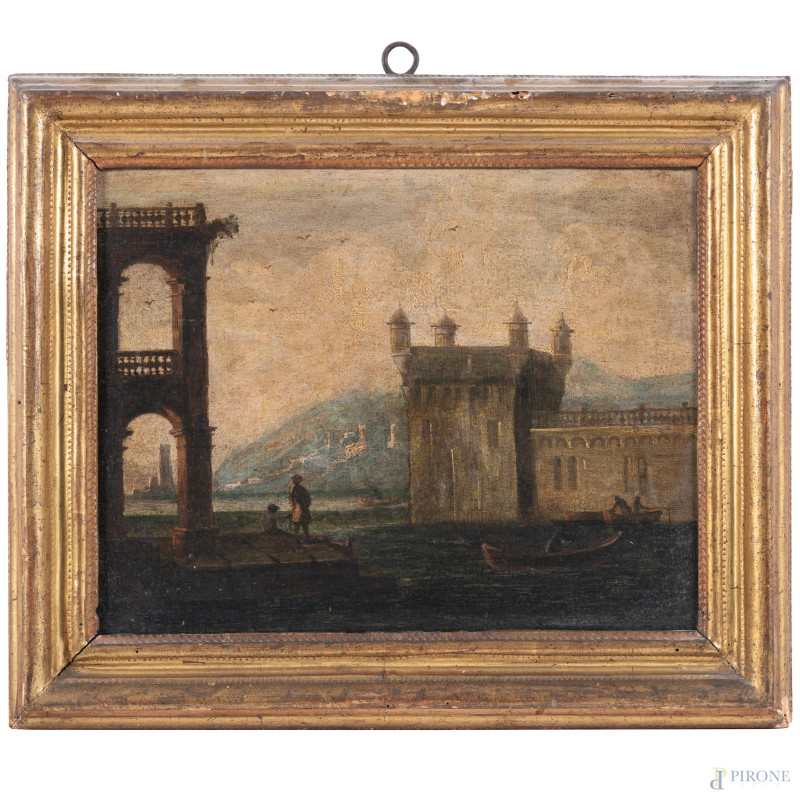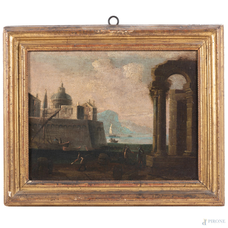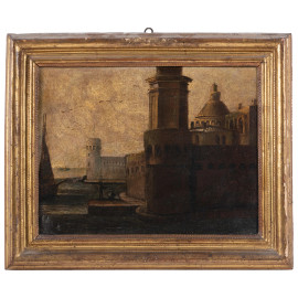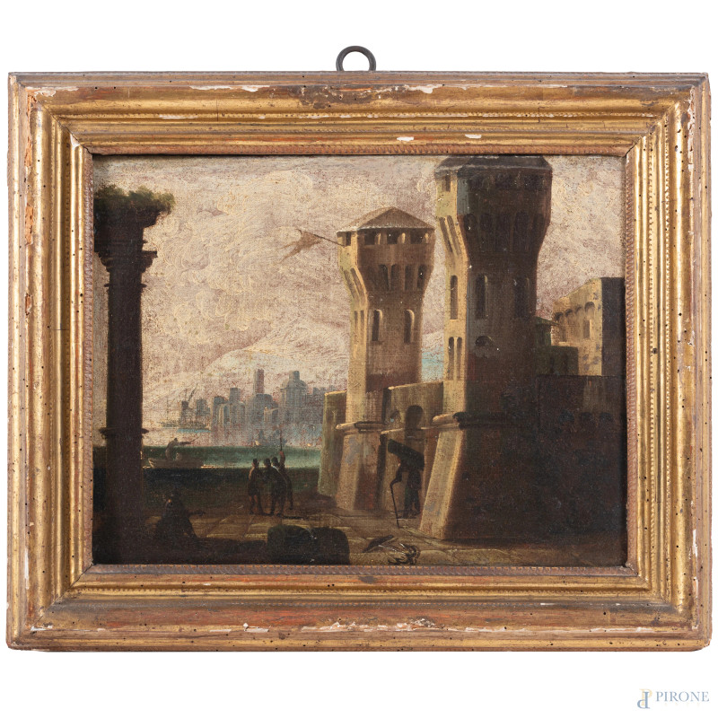 Lotto composto da quattro dipinti raffiguranti città fortificate, XVII secolo, olio su tela, misure massime cm 30x38, (restauri)