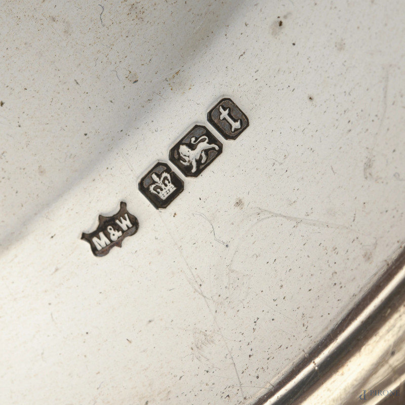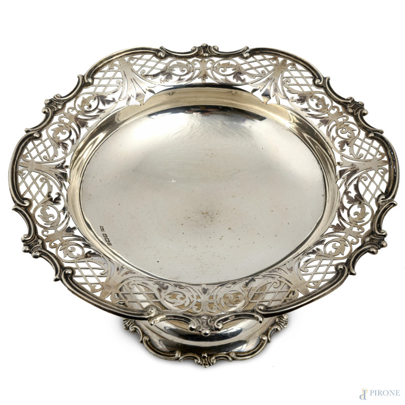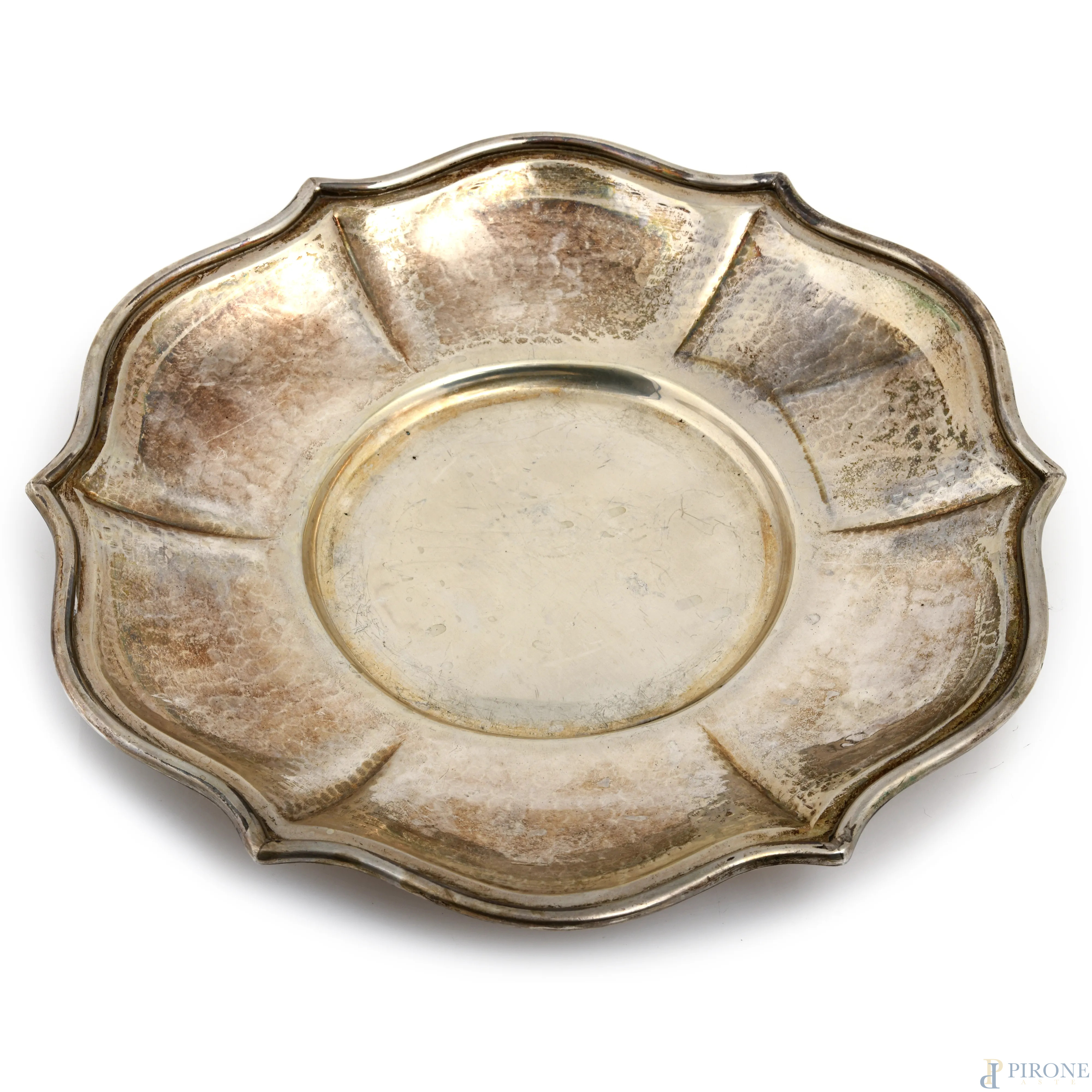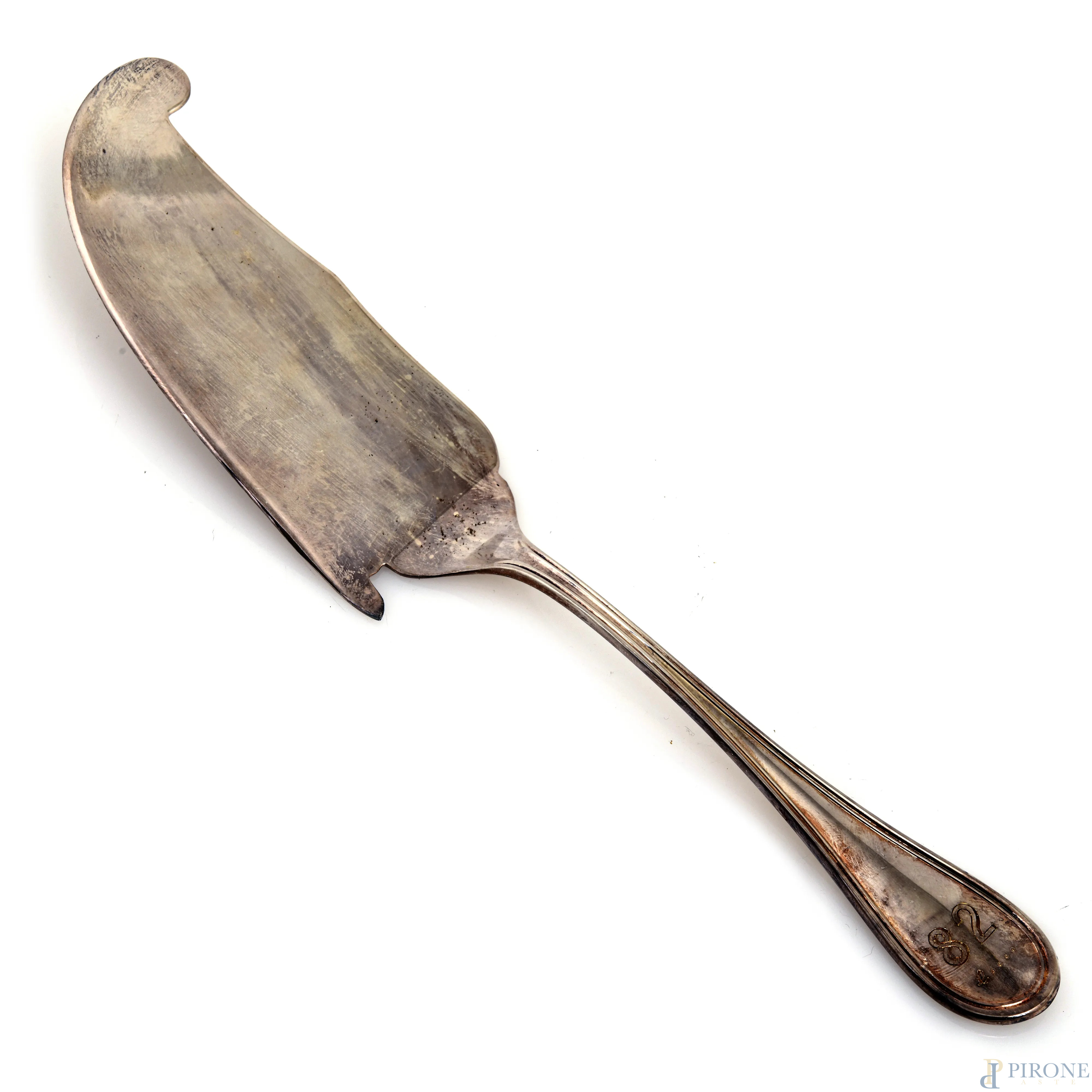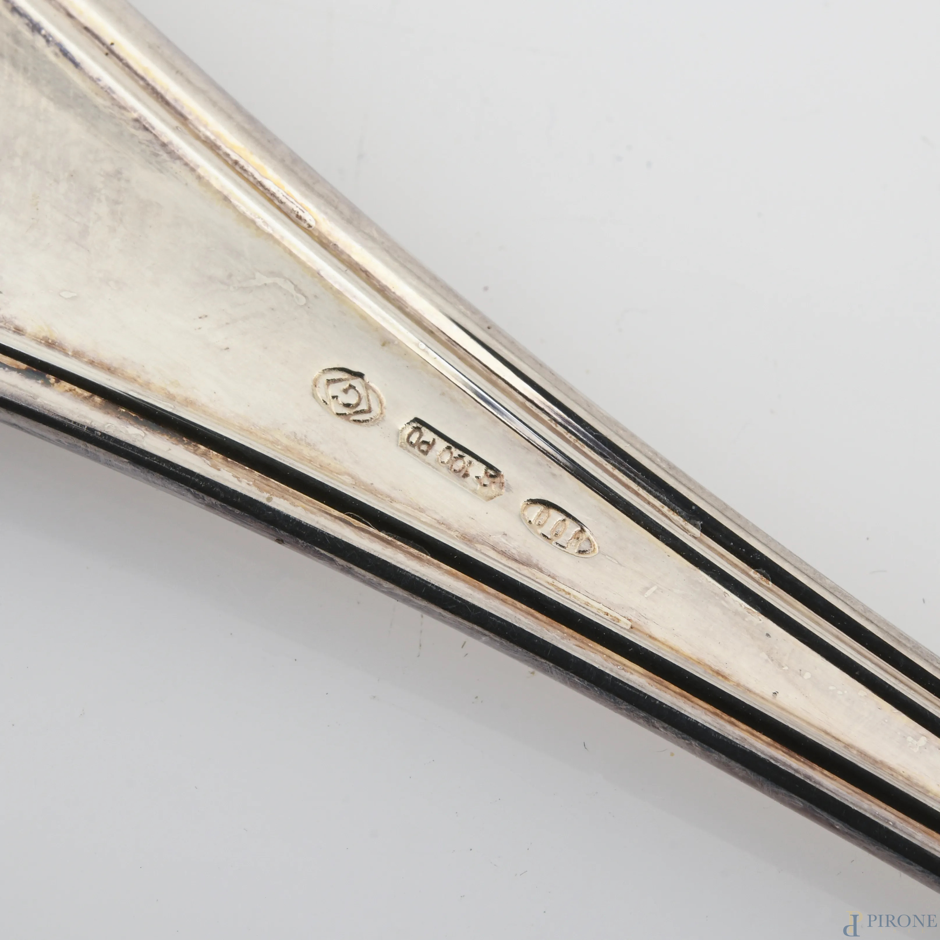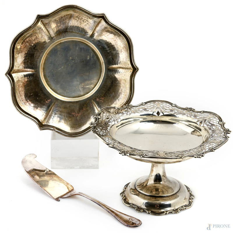 Lotto composto da un centrino sagomato, un'alzata e una paletta da dolce in argento, misure massime 13x23, peso complessivo gr 875