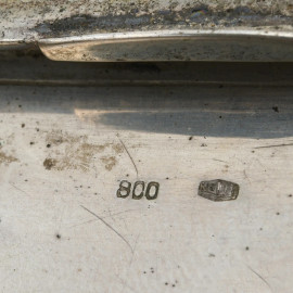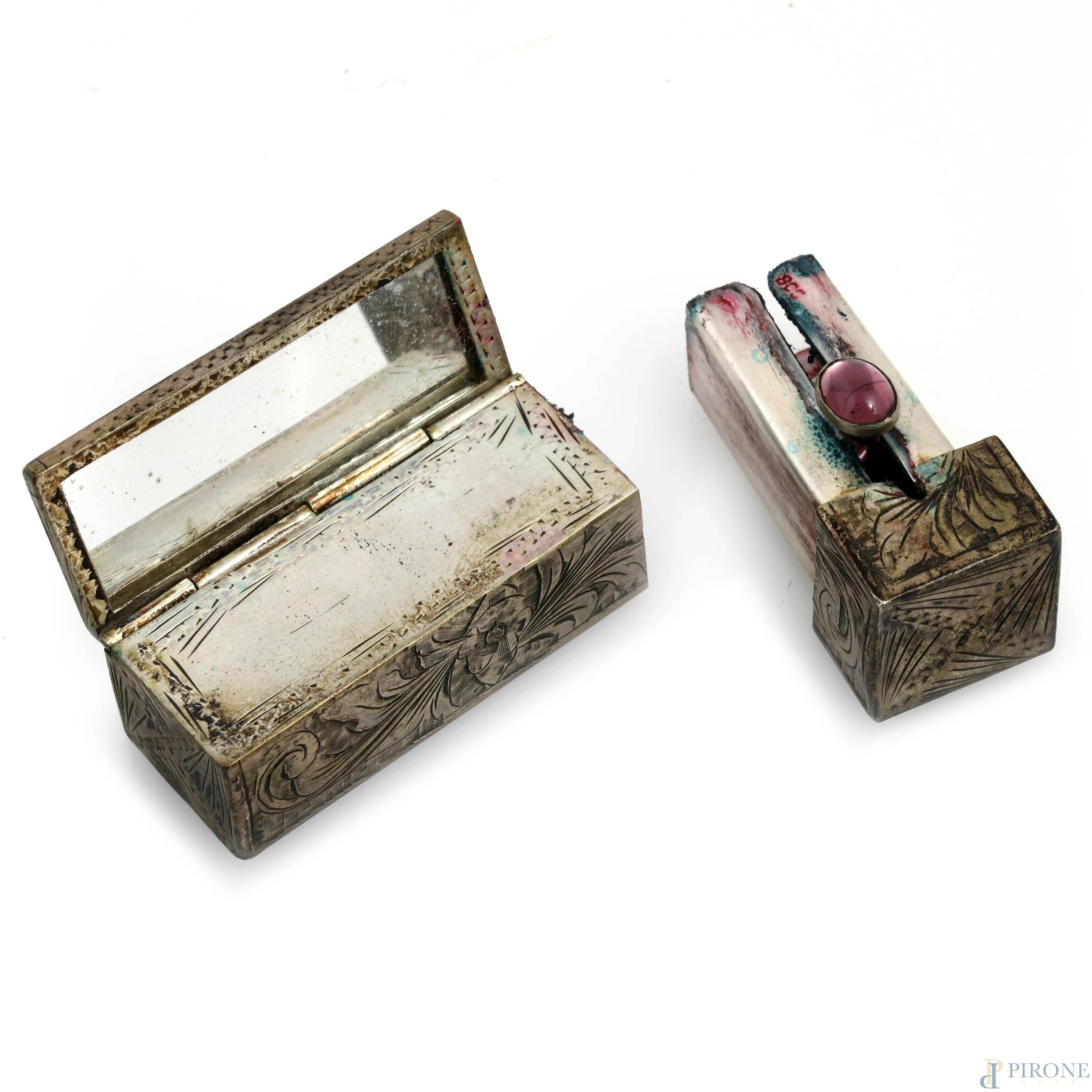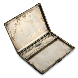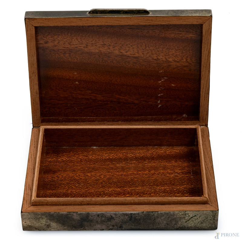 Lotto composto da una scatola in legno rivestita in argento, un portasigarette e un portarossetto in argento 800/000, misure massime cm 3x13,5x9, peso lordo complessivo gr 310, (segni di usura)