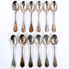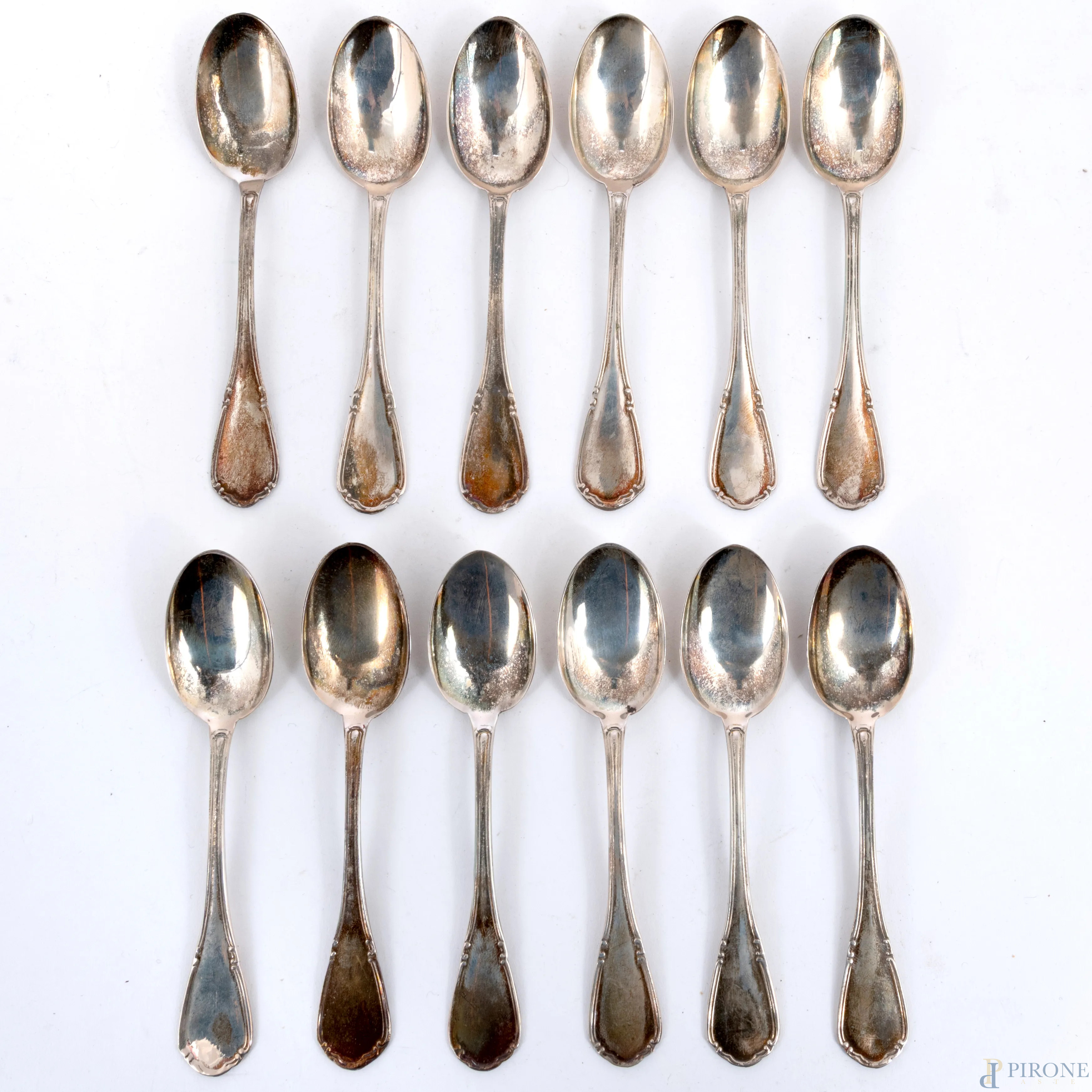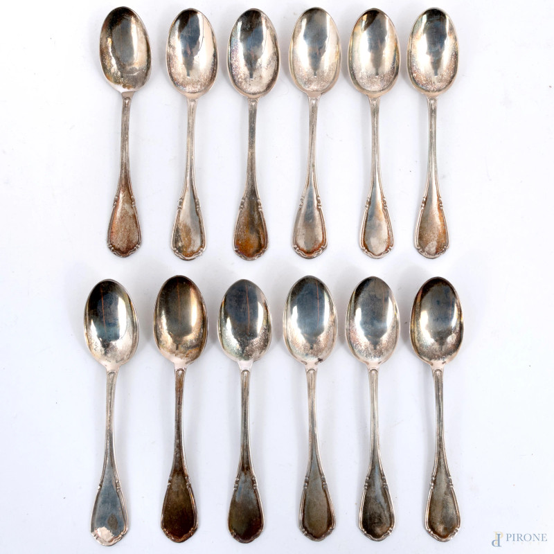 Lotto di 12 cucchiaini da the in argento 800/000, lunghezza cm 12, peso complessivo gr 150