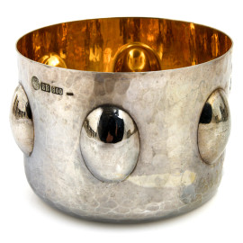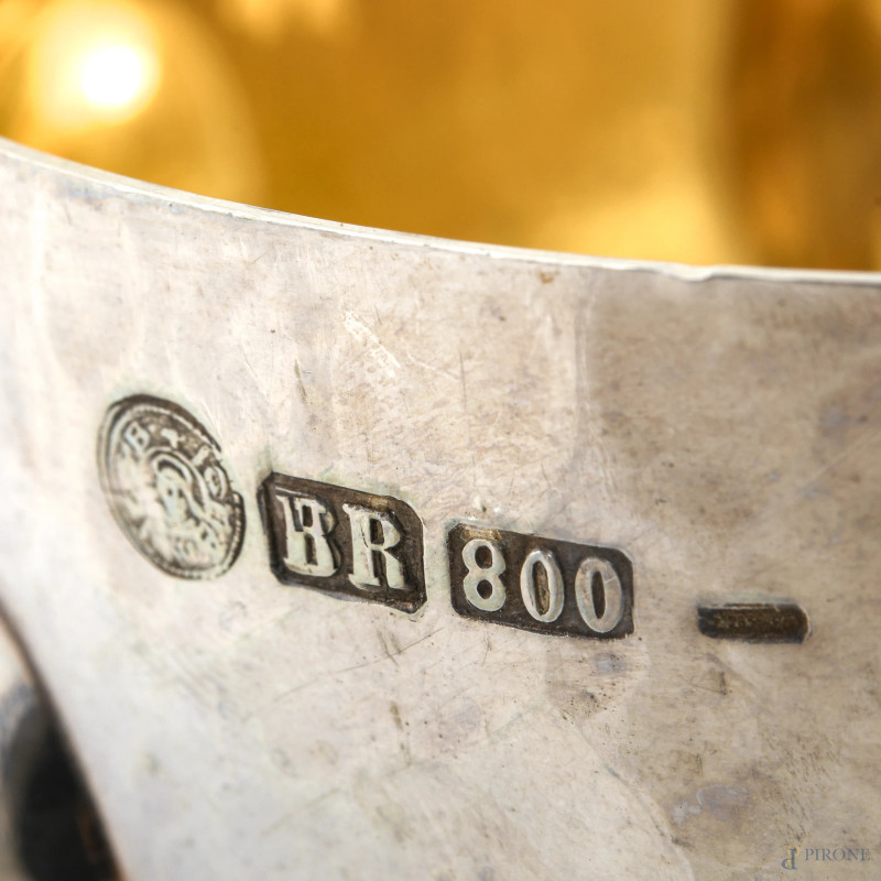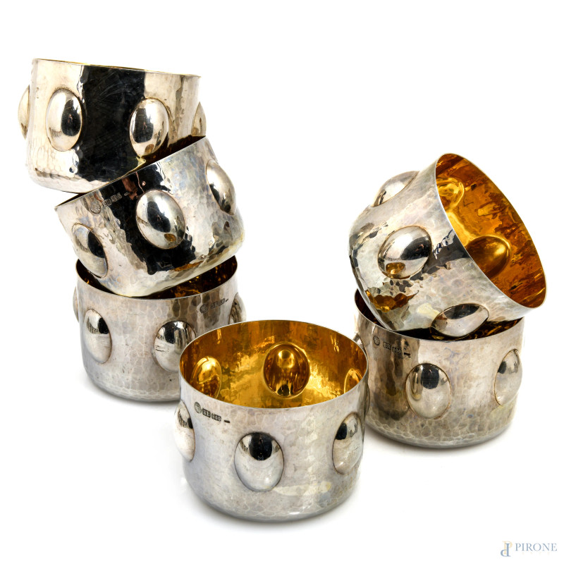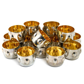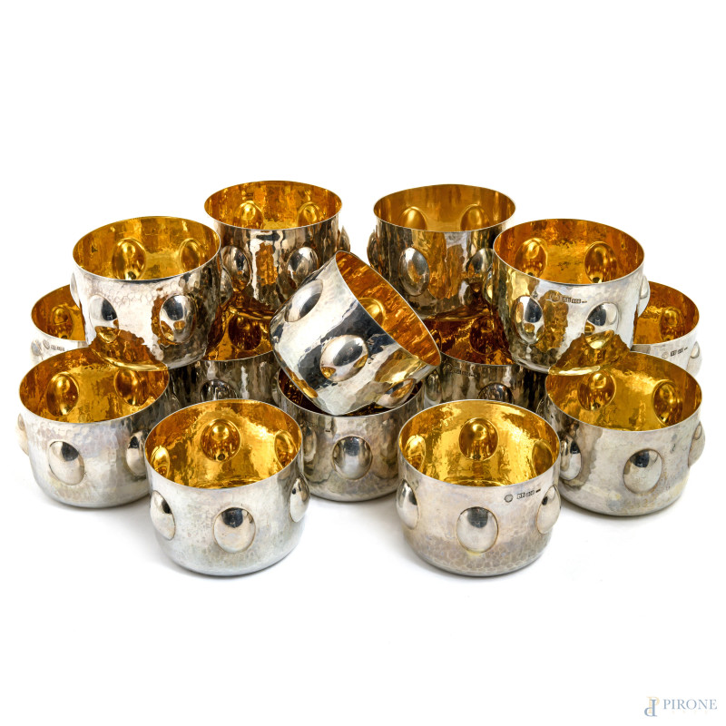 Lotto di 16 bicchieri in argento Brandimarte con decorazioni a sbalzo e interno vermeil, XX secolo, peso complessivo gr 1950, cm 6x9