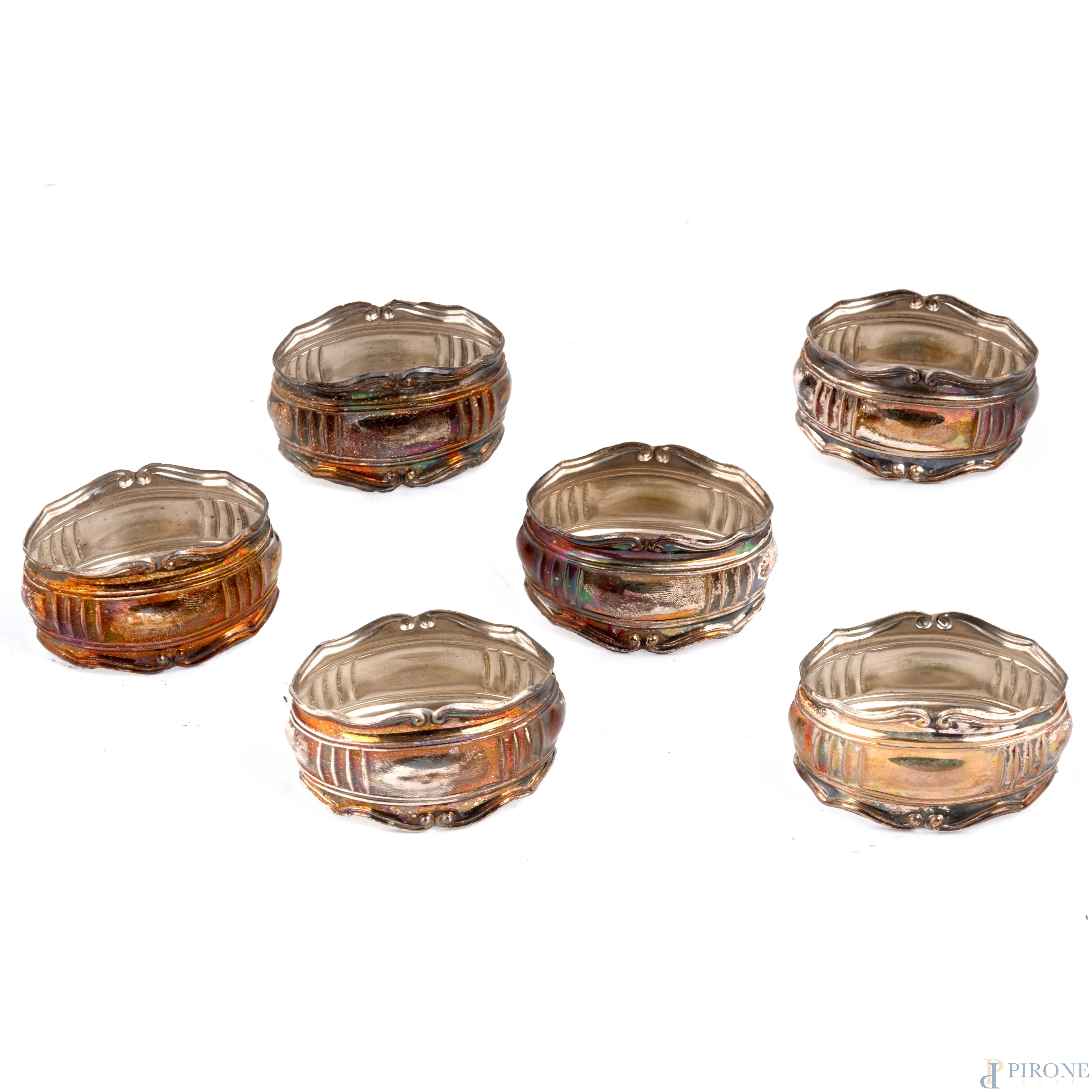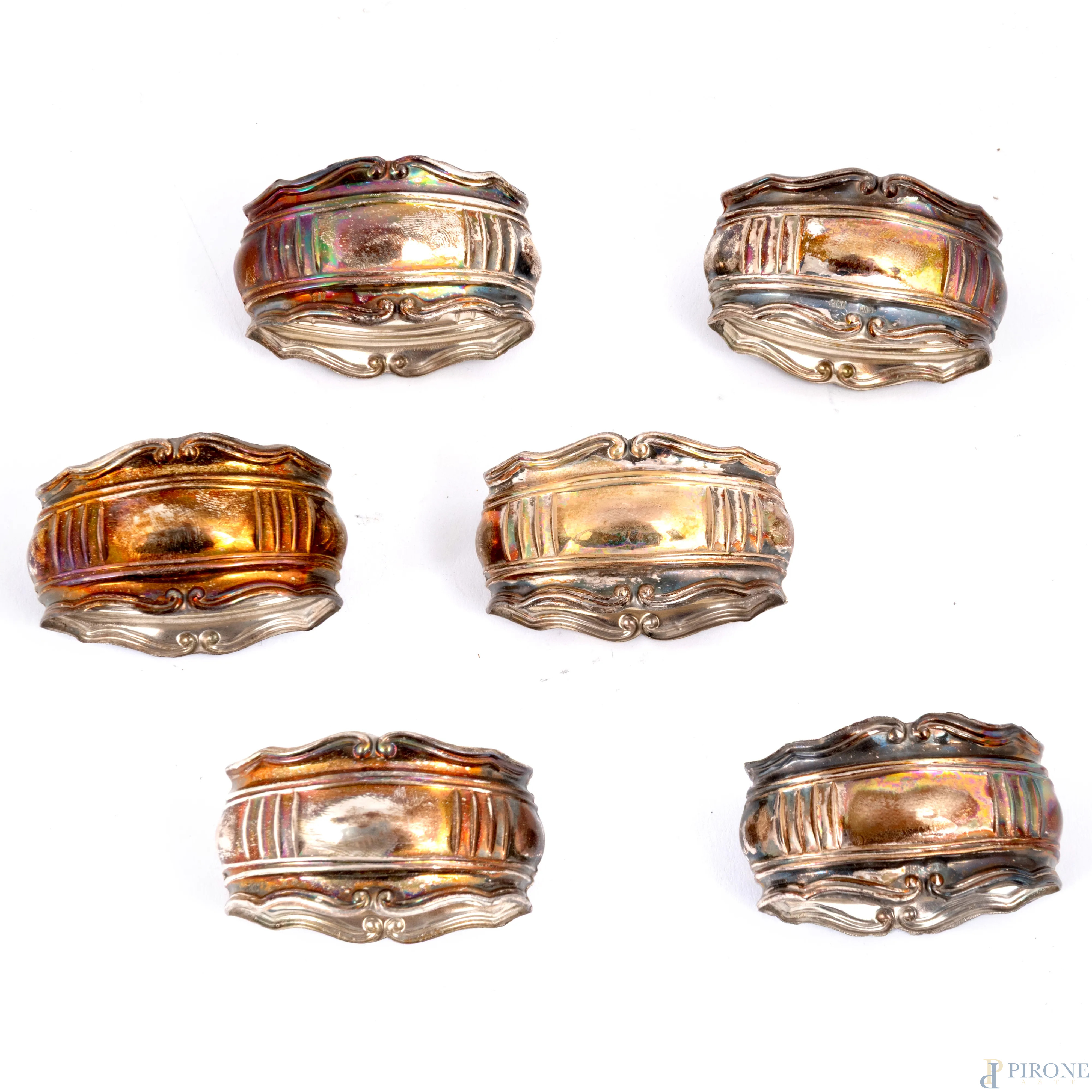 Lotto di 6 portatovagliolo in argento 800/000, punzone 29 VC Fabbrica Argenteria F.LLI BORZONI, cm 3x5x3, peso complessivo gr 40