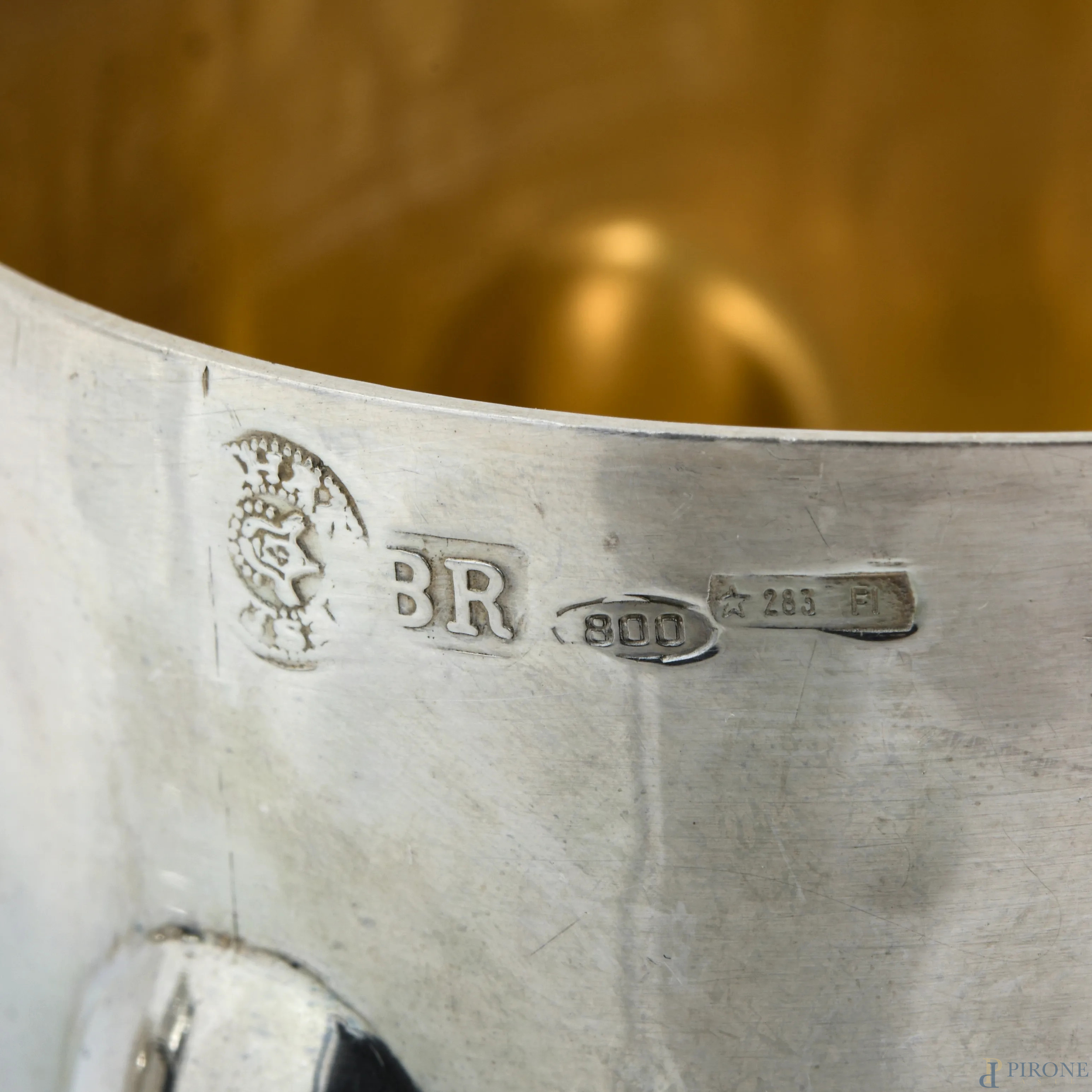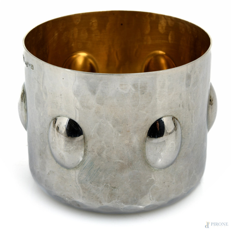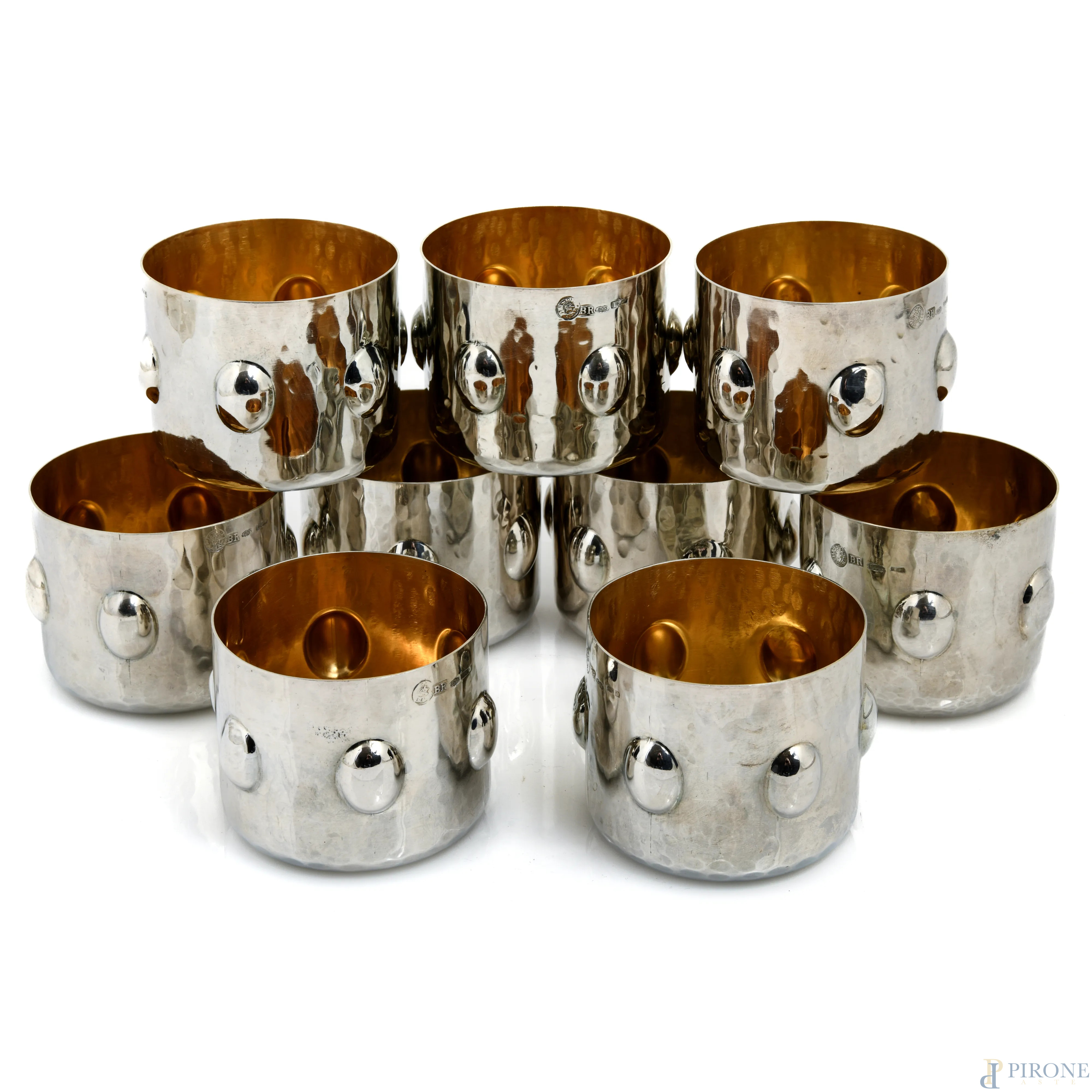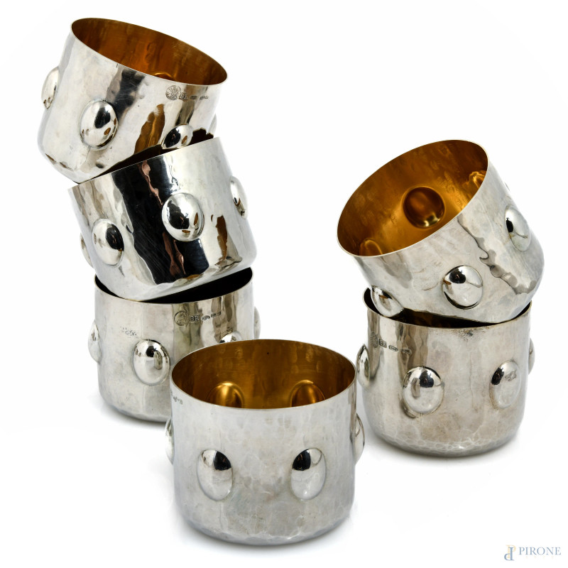 Lotto di 9 bicchieri in argento Brandimarte con decoro a sbalzo e interno vermeil, peso complessivo gr 950, cm 6x7,5