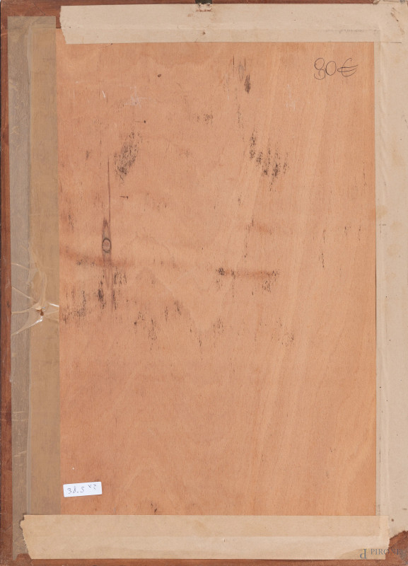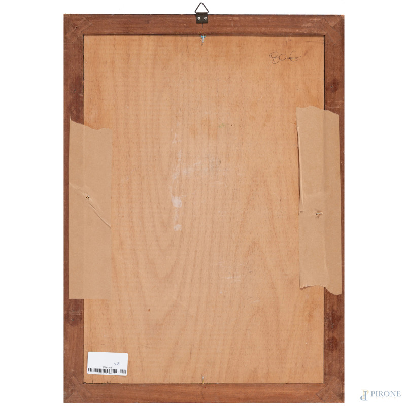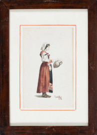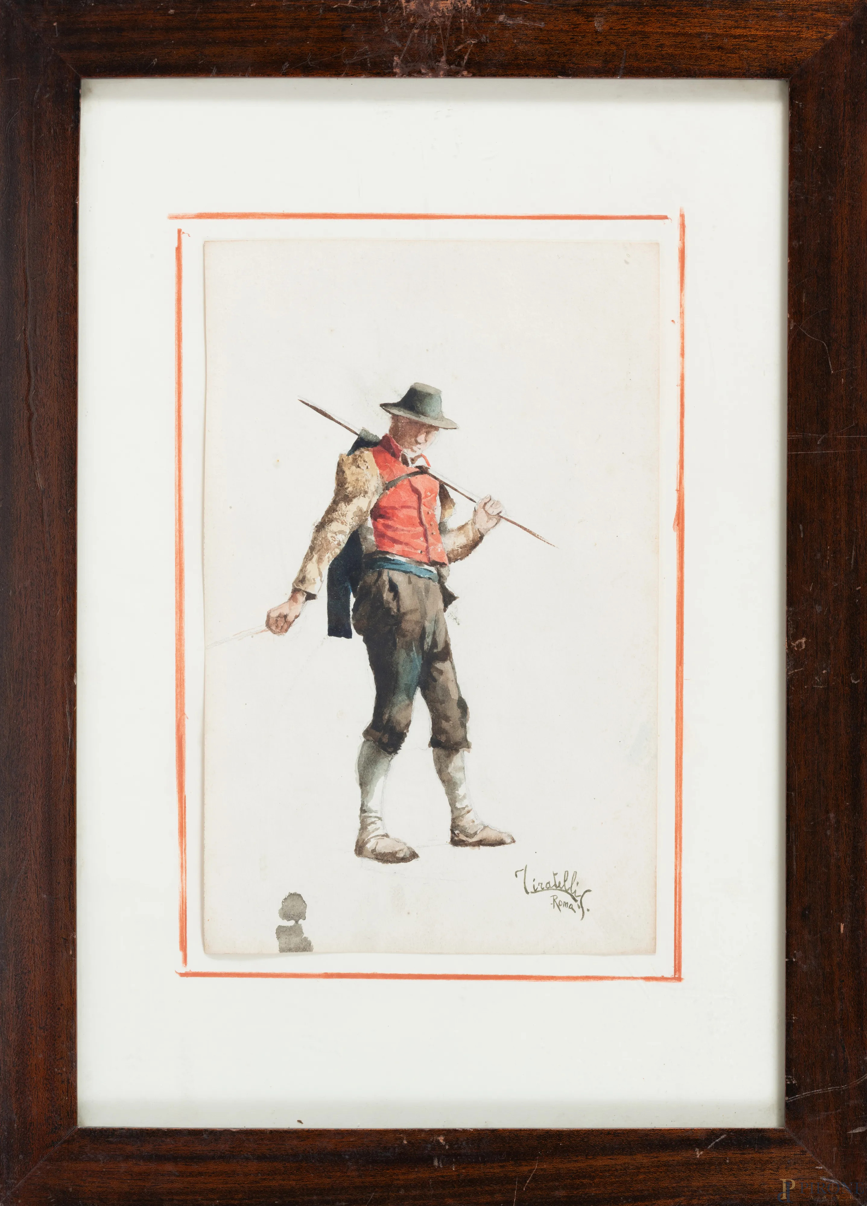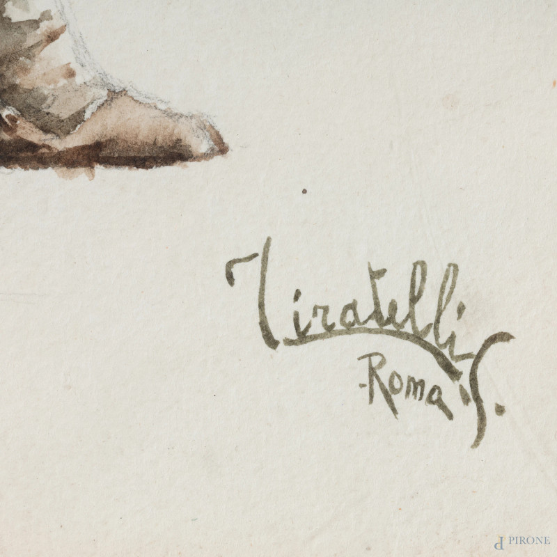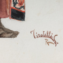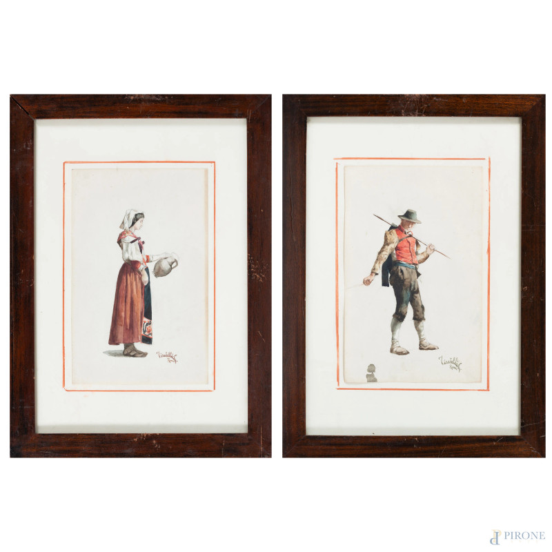 Lotto di due acquerelli su carta raffiguranti popolani, acquerello su carta, XX secolo, cm 33x21, firmati e iscritti "Roma" in basso a destra, entro cornice, (segni di usura del tempo)