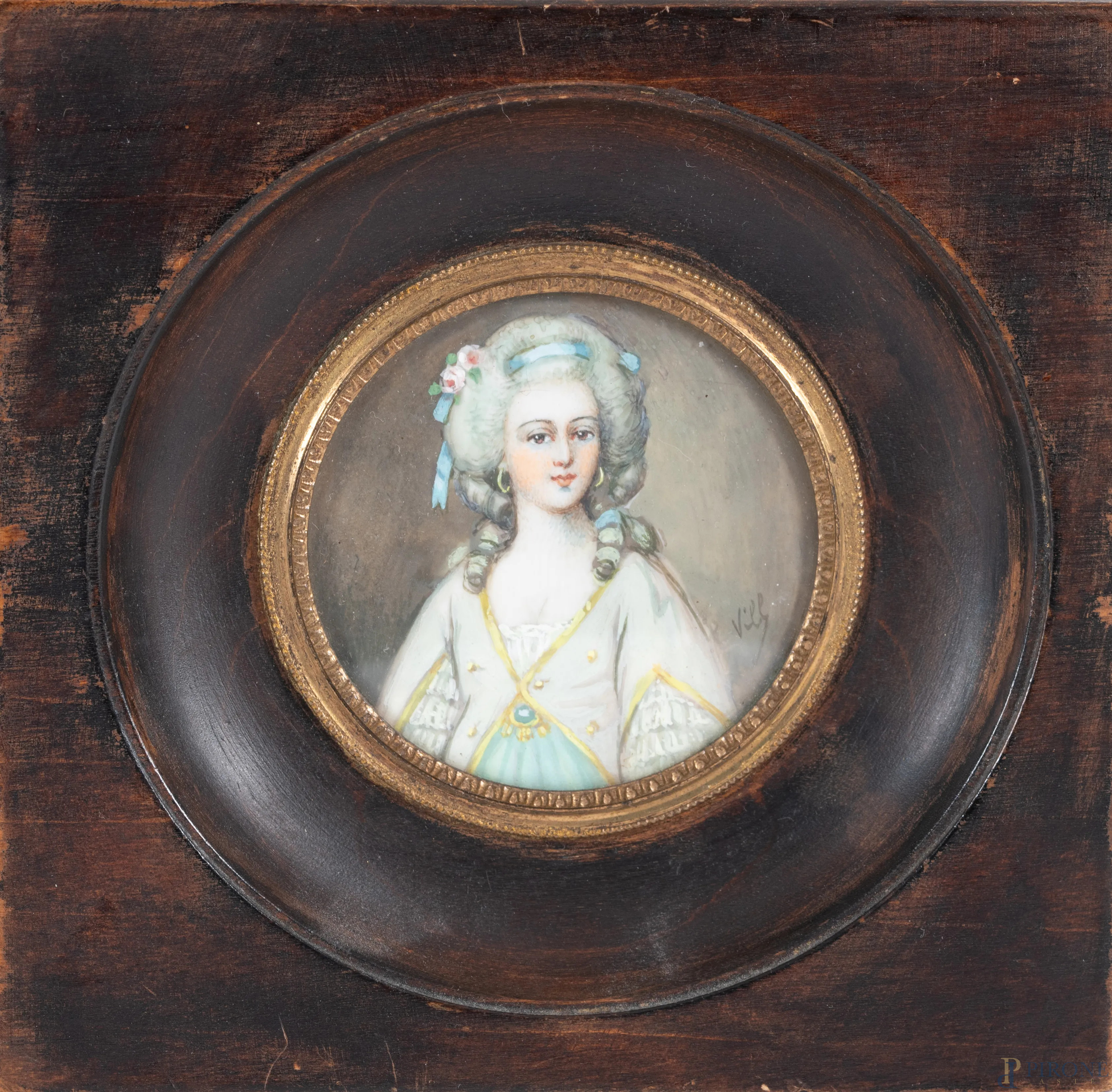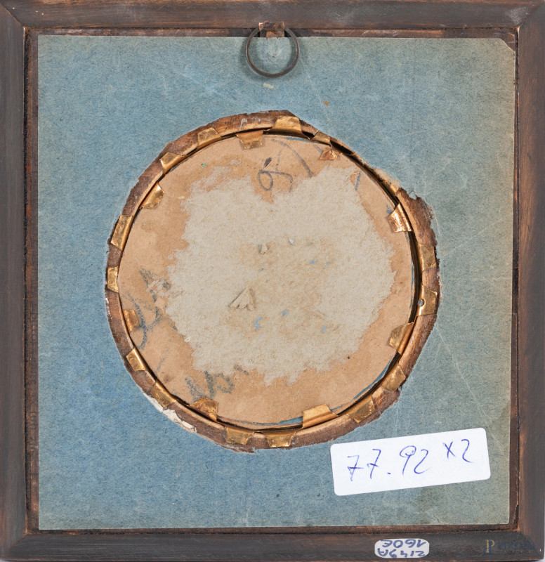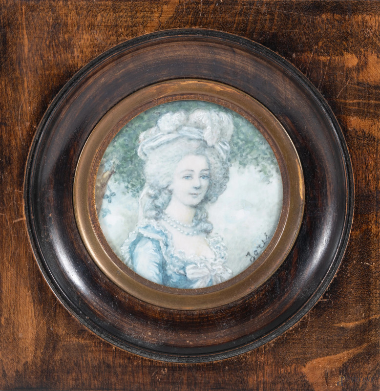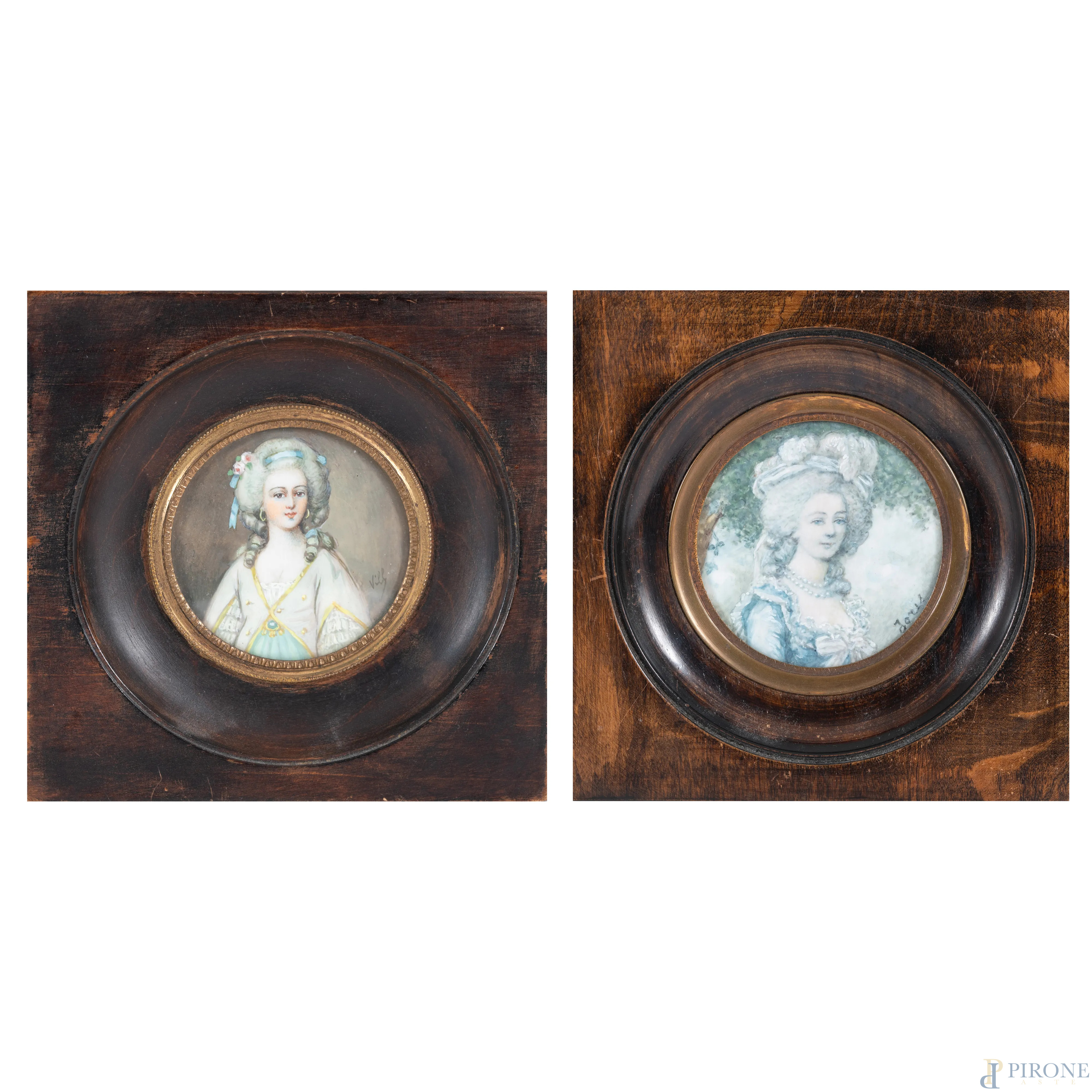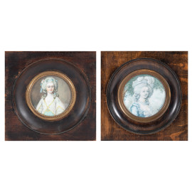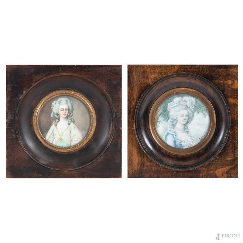 Lotto di due miniature a serto circolare raffiguranti nobildonne, XIX-XX secolo, misure massime comprensive di cornice, cm 13,5x13,5