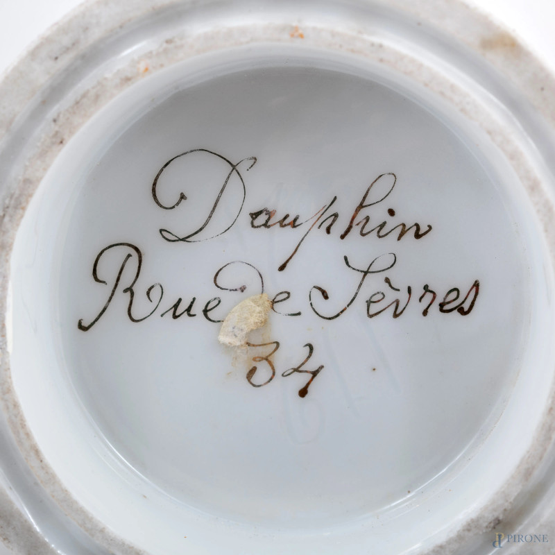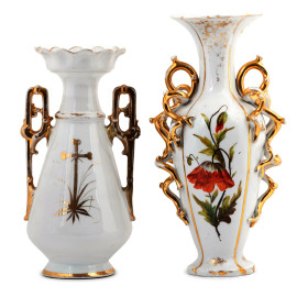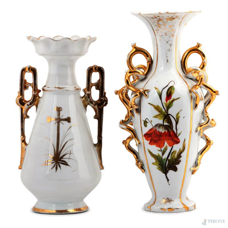 Lotto di due vasi in porcellana francese nei toni del bianco e dell'oro con decori floreali, XX secolo, altezza massima cm 34, (segni di usura, difetti)