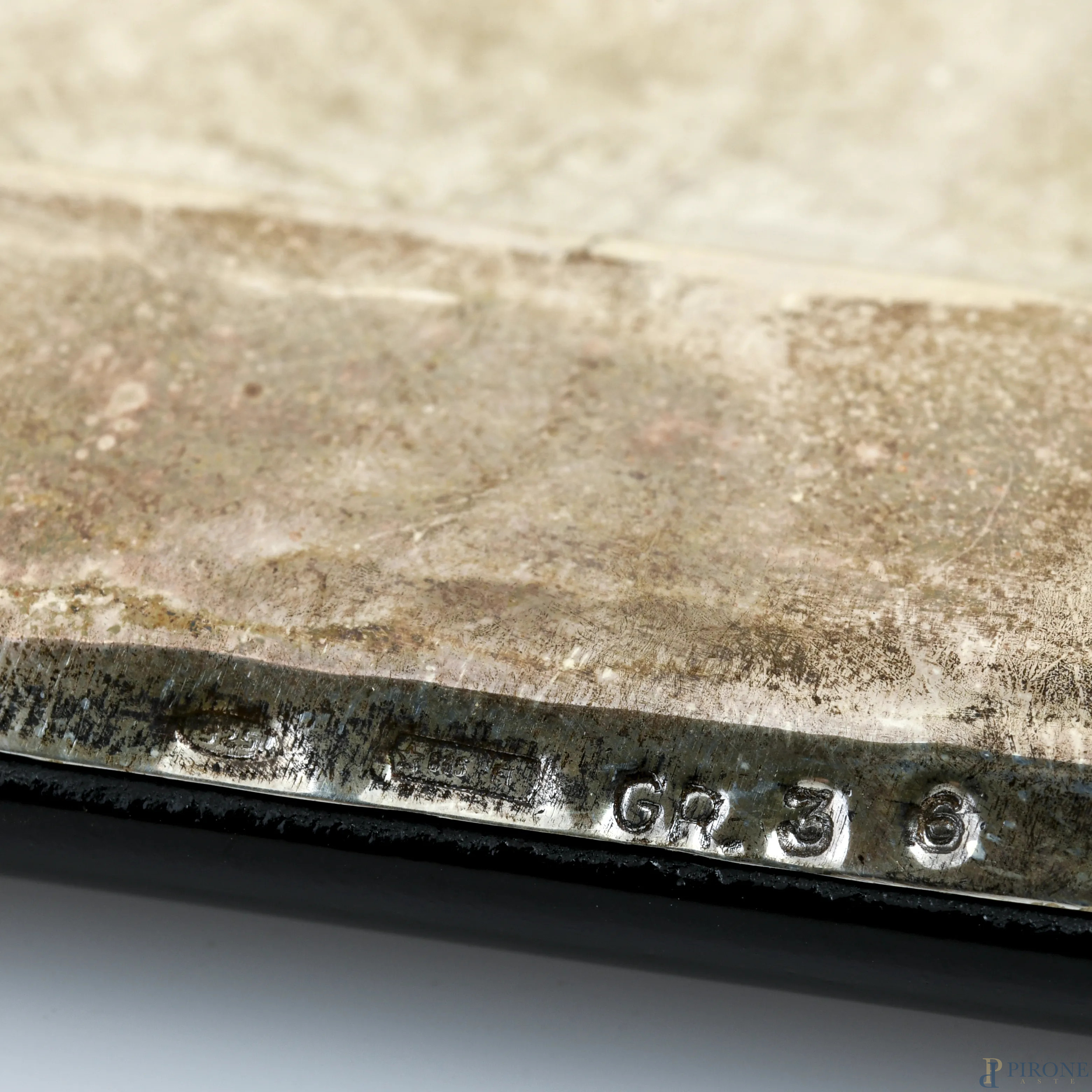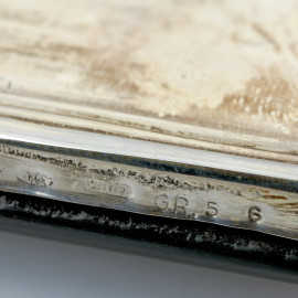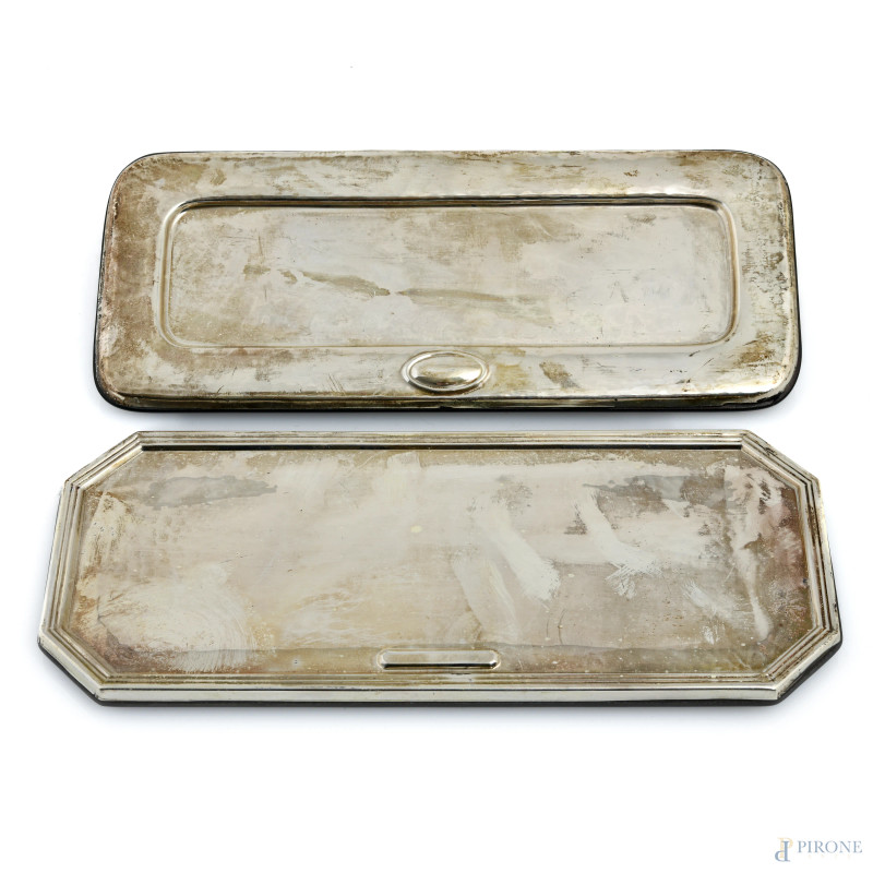 Lotto di due vassoietti portapenne rivestiti in lamina di argento, XX secolo, misura massima cm 24x10