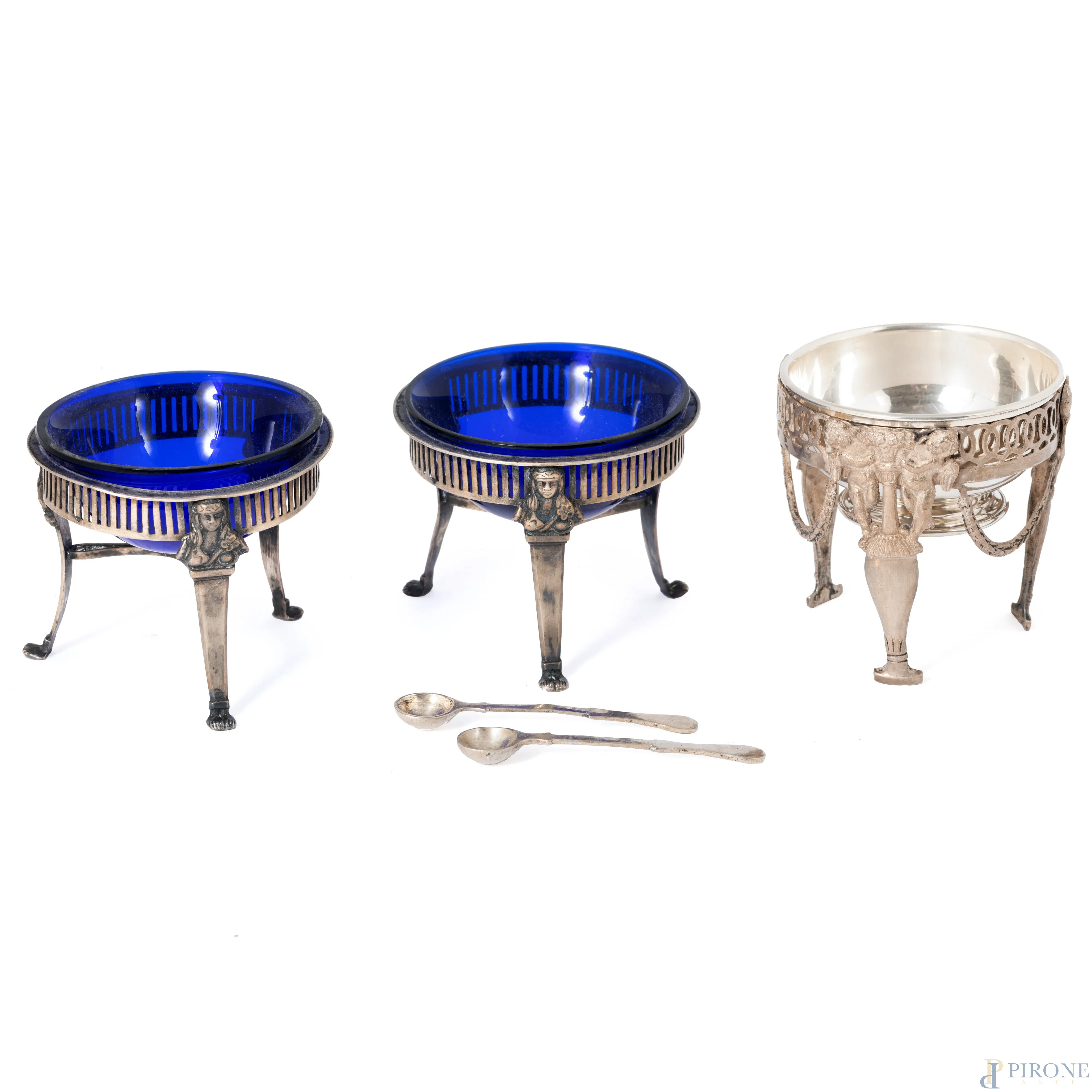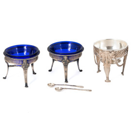 Lotto di tre salierine in argento e vetro cobalto, altezza massima cm 7x7, peso dell'argento gr 220