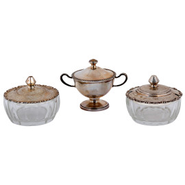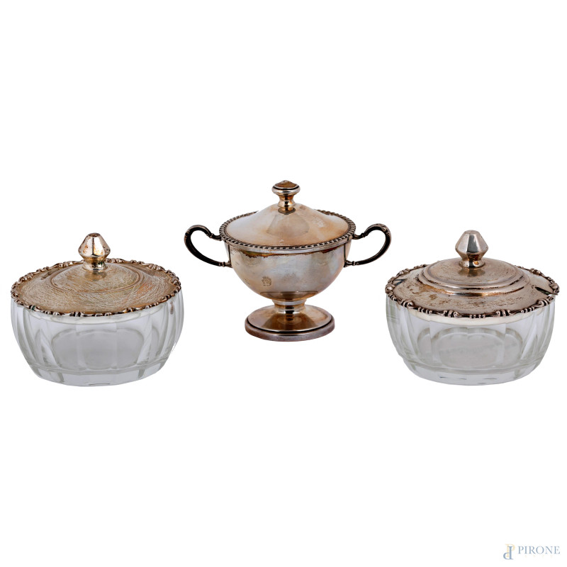 Lotto di tre zuccheriere in cristallo e argento 800/000, misura massima altezza cm 9,5x13,5, peso argento gr 230