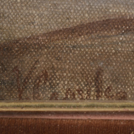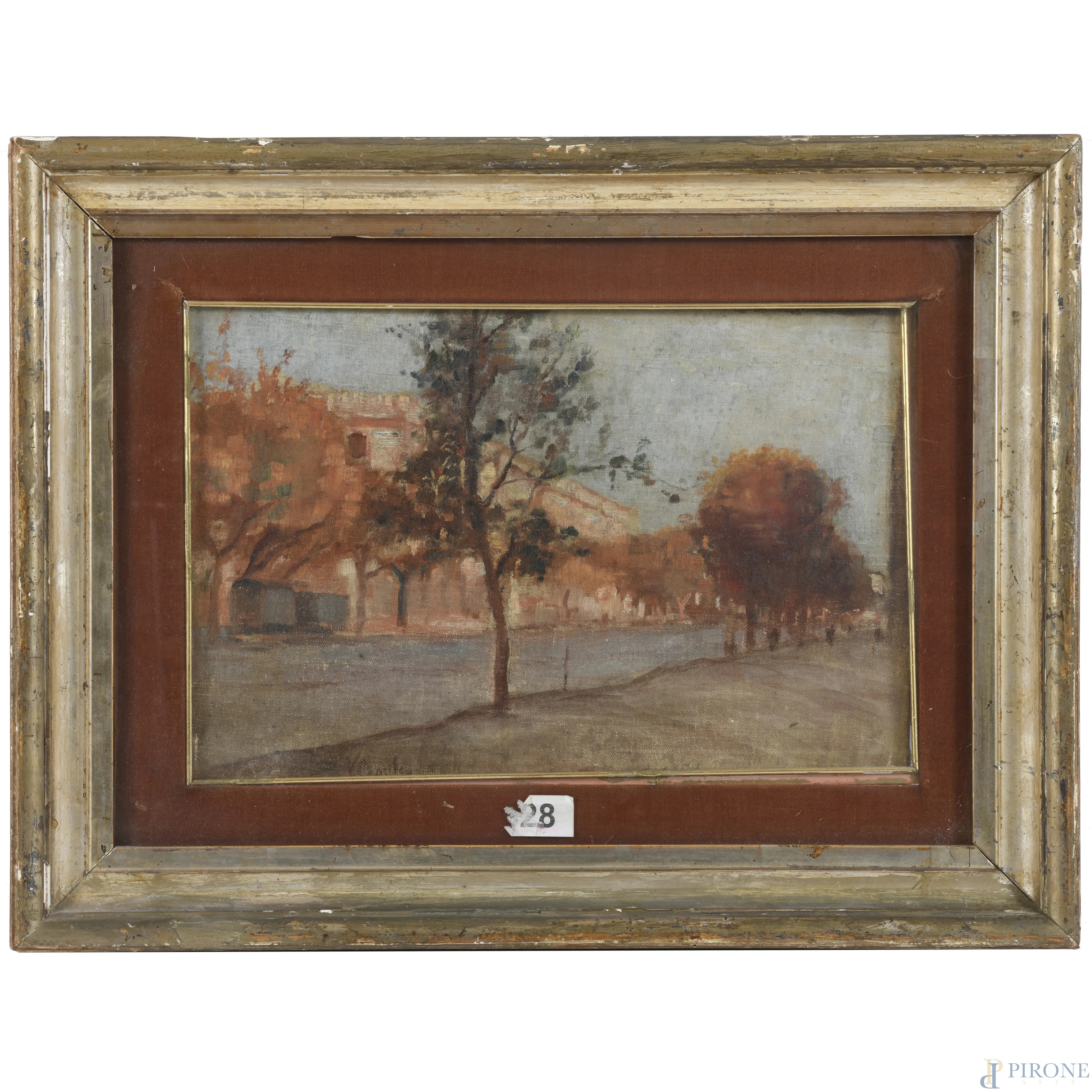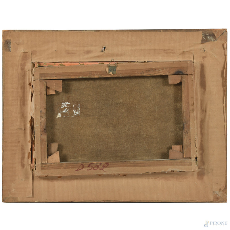 Lungo il fiume, XX secolo, olio su tela, cm 26x39, firmato in basso, entro cornice