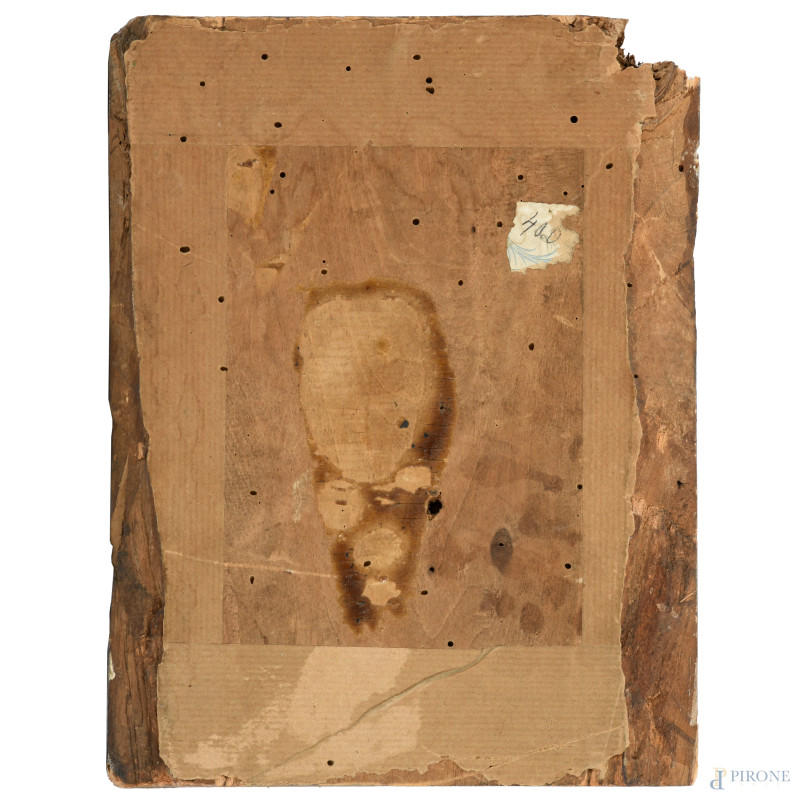 Madonna con Bambino, XIX secolo, tempera su tavola, cm 27x21, (segni di usura, rotture, cadute di colore, abrasioni, fori di tarlo, difetti)