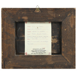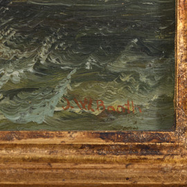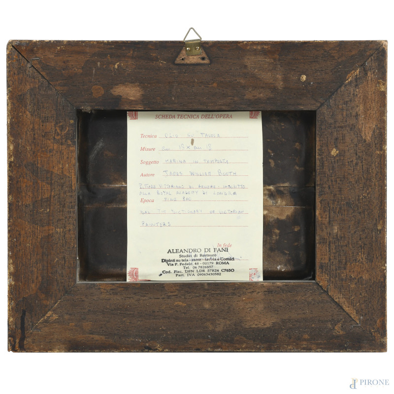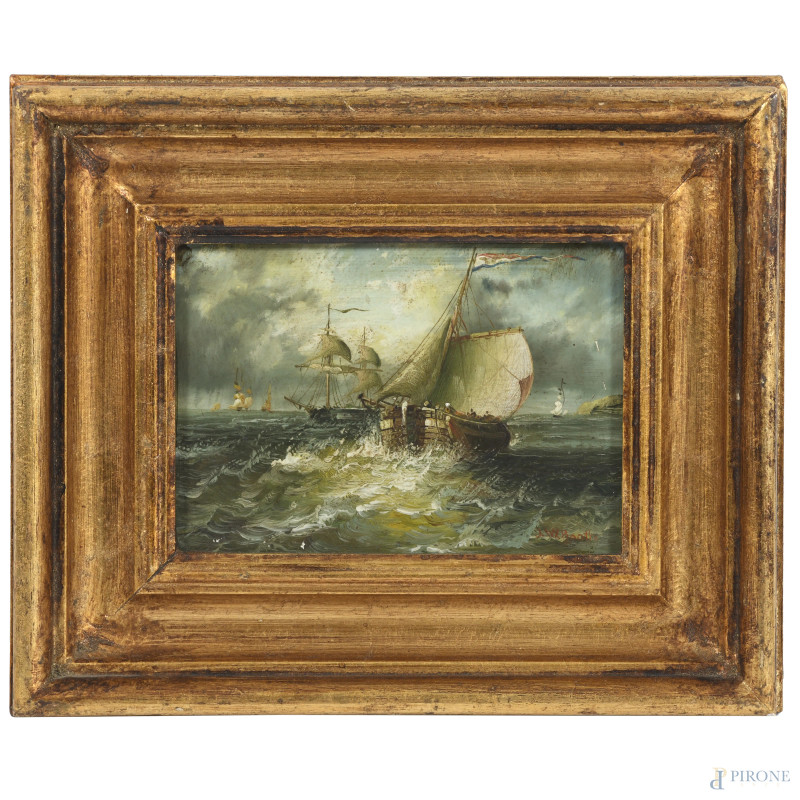 Mare in tempesta con velieri, XIX-XX secolo, olio su tavola, cm 13,5x18,5, firmato in basso a destra, entro cornice, (segni di usura)