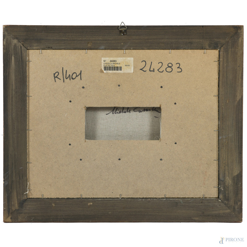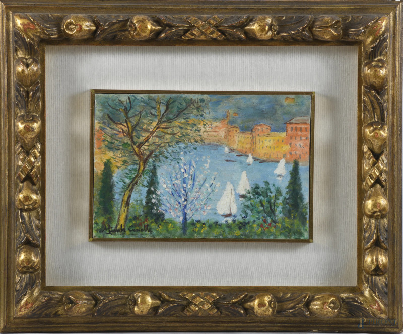 Michele Cascella (1892-1989), Veduta di Portofino, olio su tela cm 20x30, entro cornice, corredato di certificazione di autenticità firmata dall'artista rilasciata dalla Galleria Spagnoli