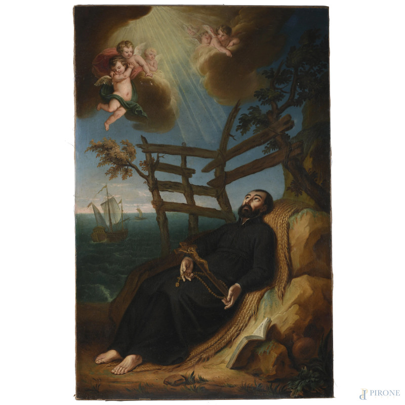 Morte di San Francesco Saverio, XVIII-XIX secolo, olio su tela, cm 142x92, (craquelure, sollevamenti di colore, piccole lacerazioni)