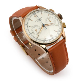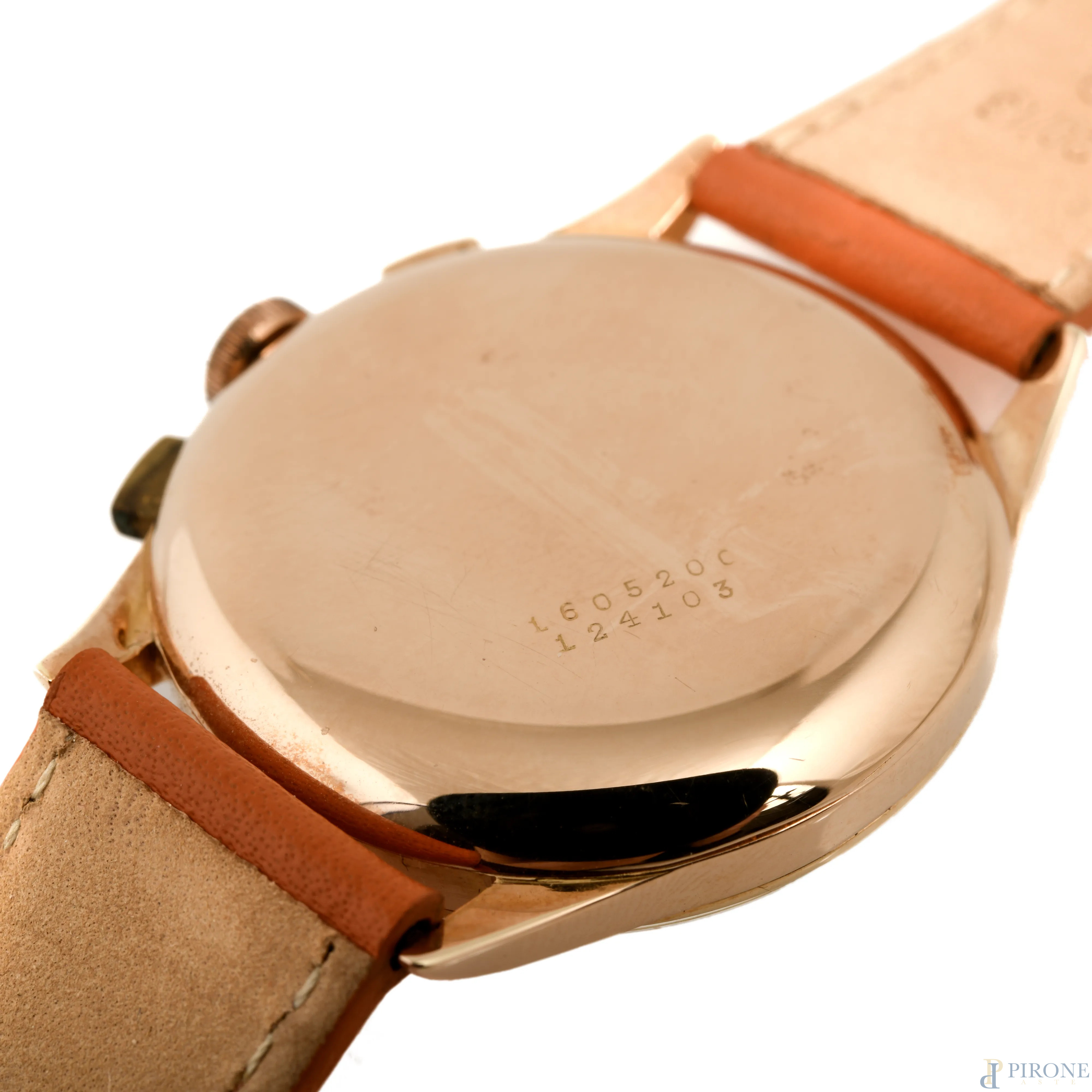 Orologio da polso Universal Geneve in oro 18 ktcon cinturino in cuoio arancio, lunghezza cinturino cm 24, diametro cassa 35 mm, (da revisionare)