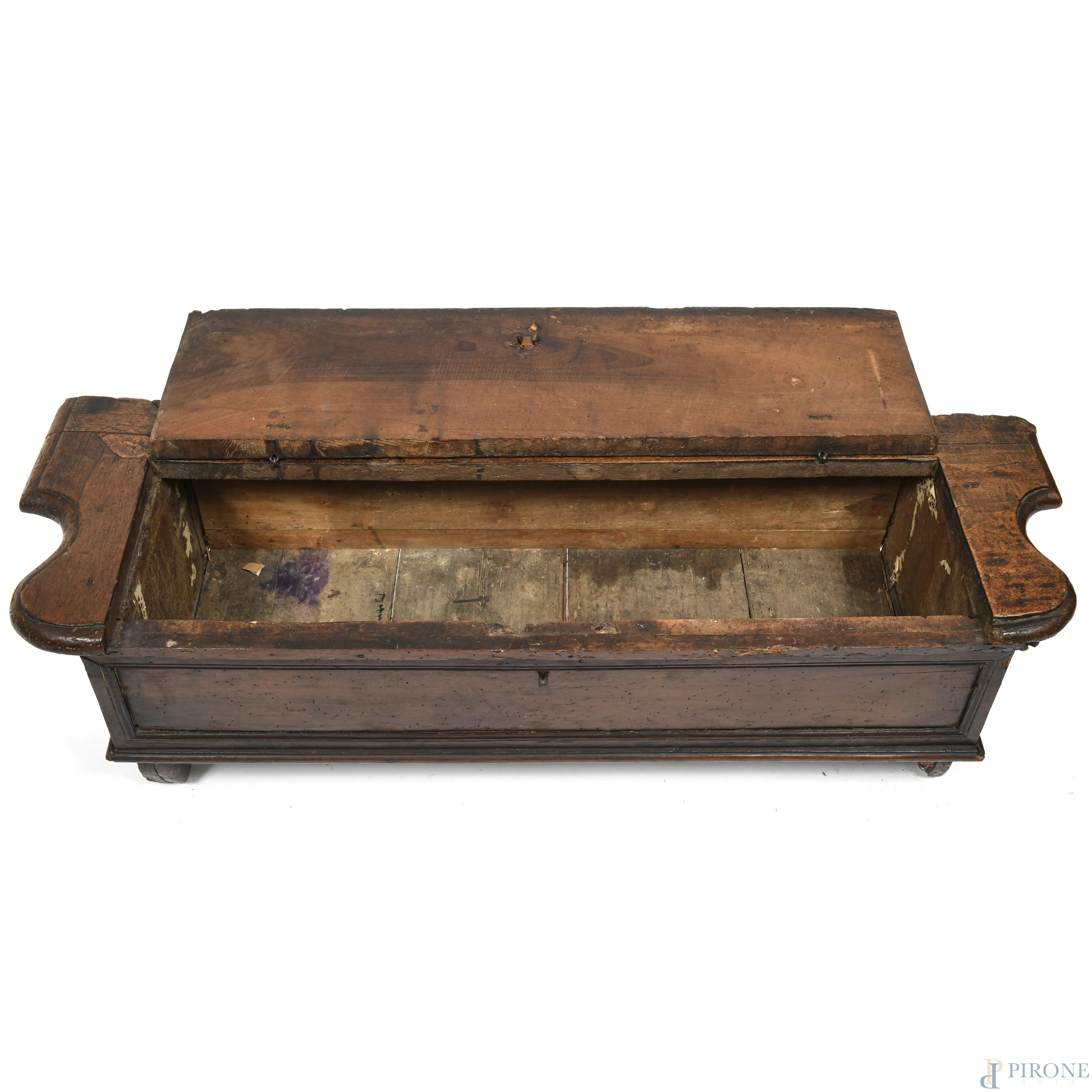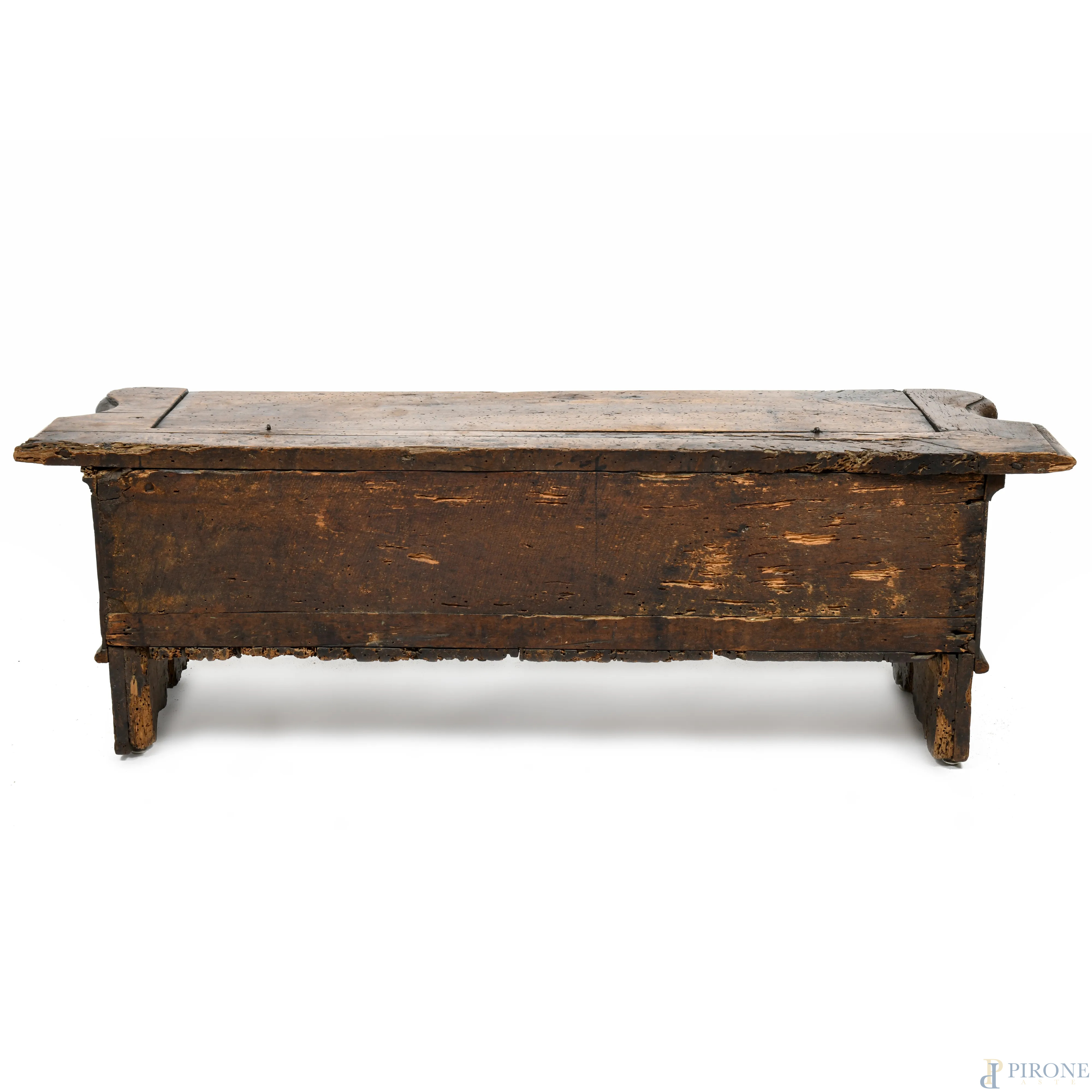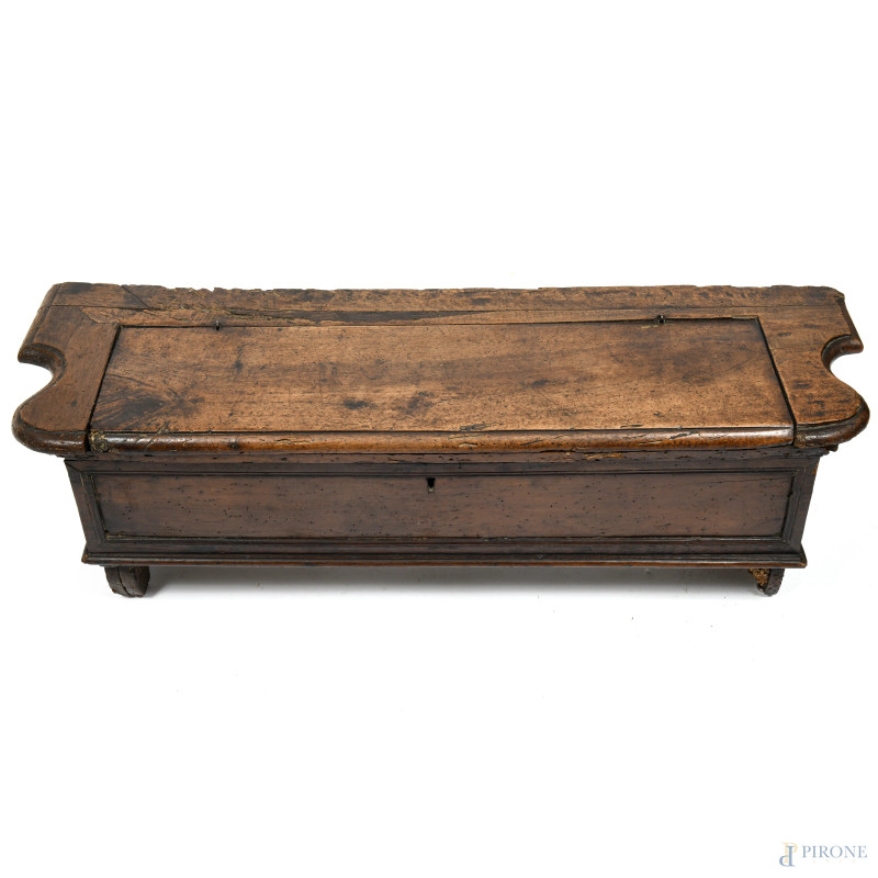 Panchetta in noce, XVIII-XIX, cm 37,5x113x33, (segni di usura, scalfiture, rotture, fori di tarlo, difetti)
