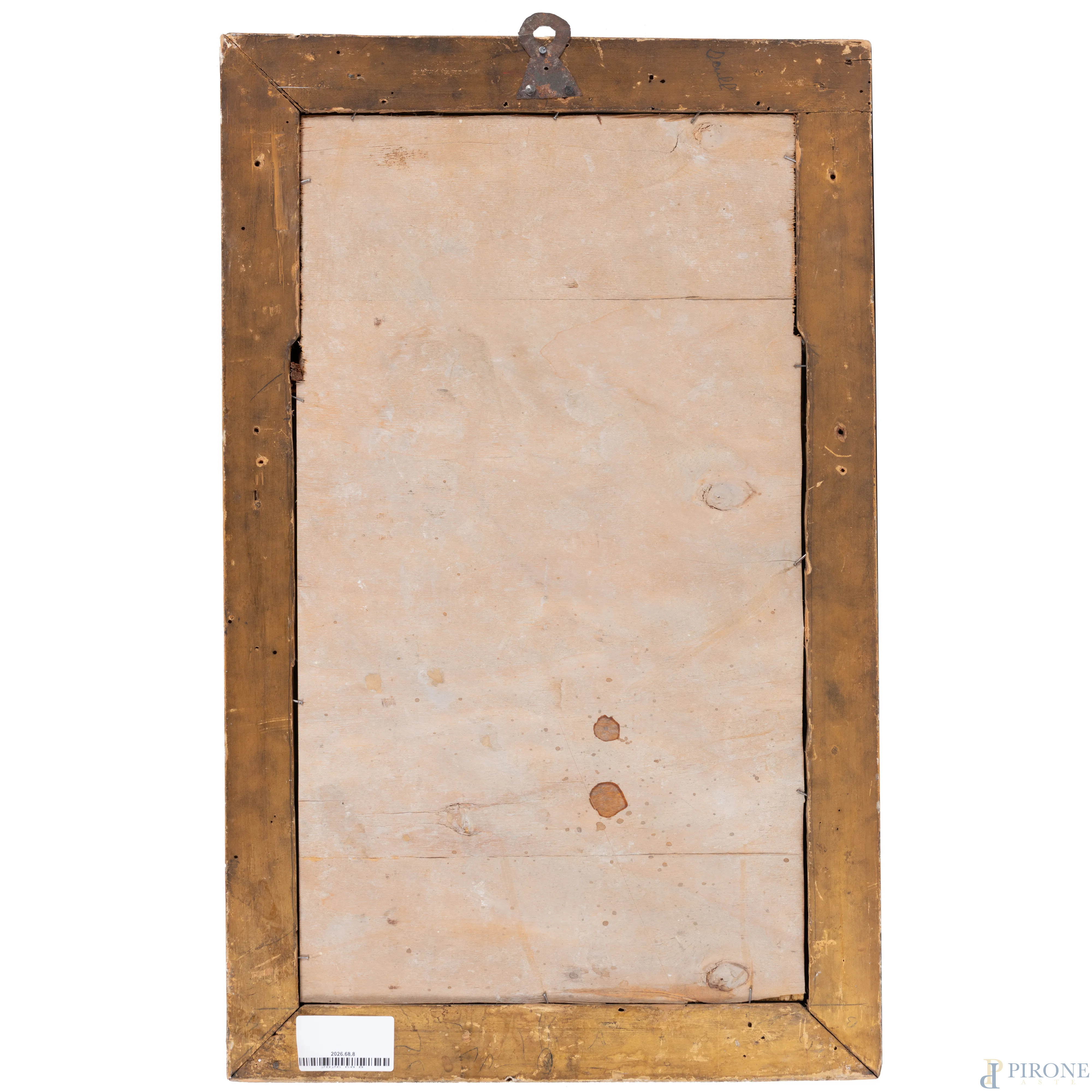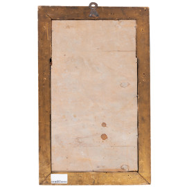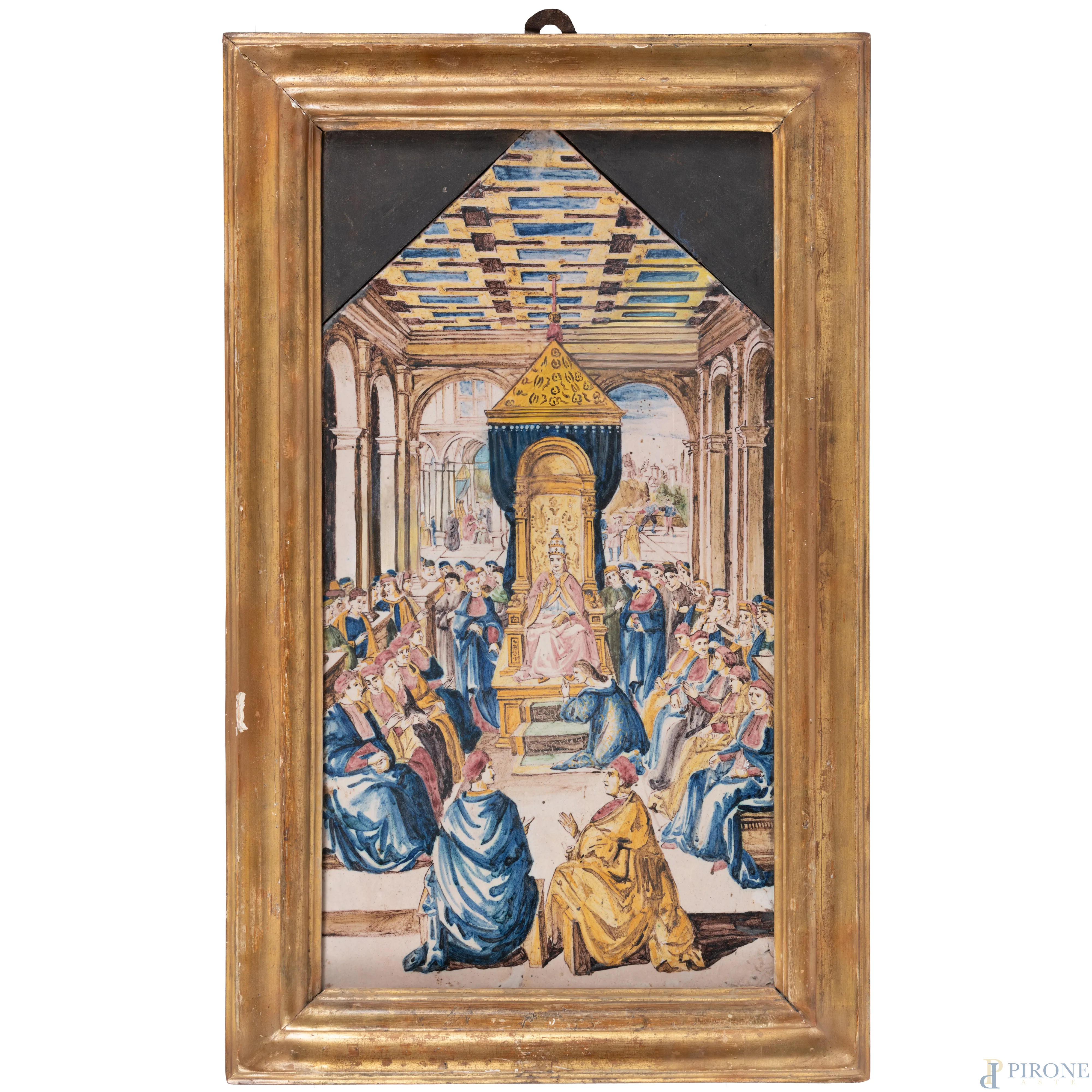 Placca in maiolica dipinta e smaltata raffigurante Pontefice in udienza, XVII secolo, misure comprensive di cornice cm 61x38