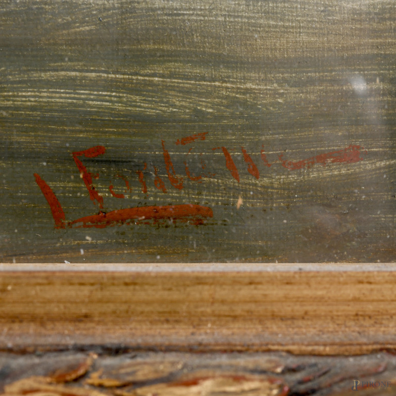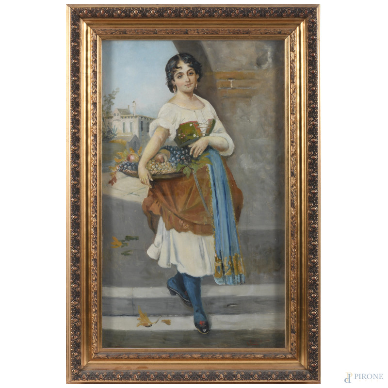 Popolana con cesto di frutta, XX secolo, olio su tela applicata su cartone, cm 75,5x45, firmato in basso a destra, entro cornice, (sollevamenti di colore, segni di usura)