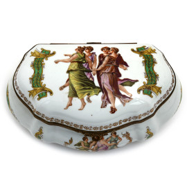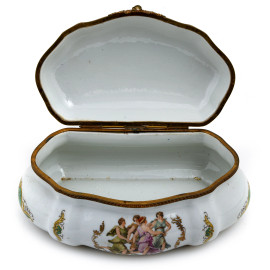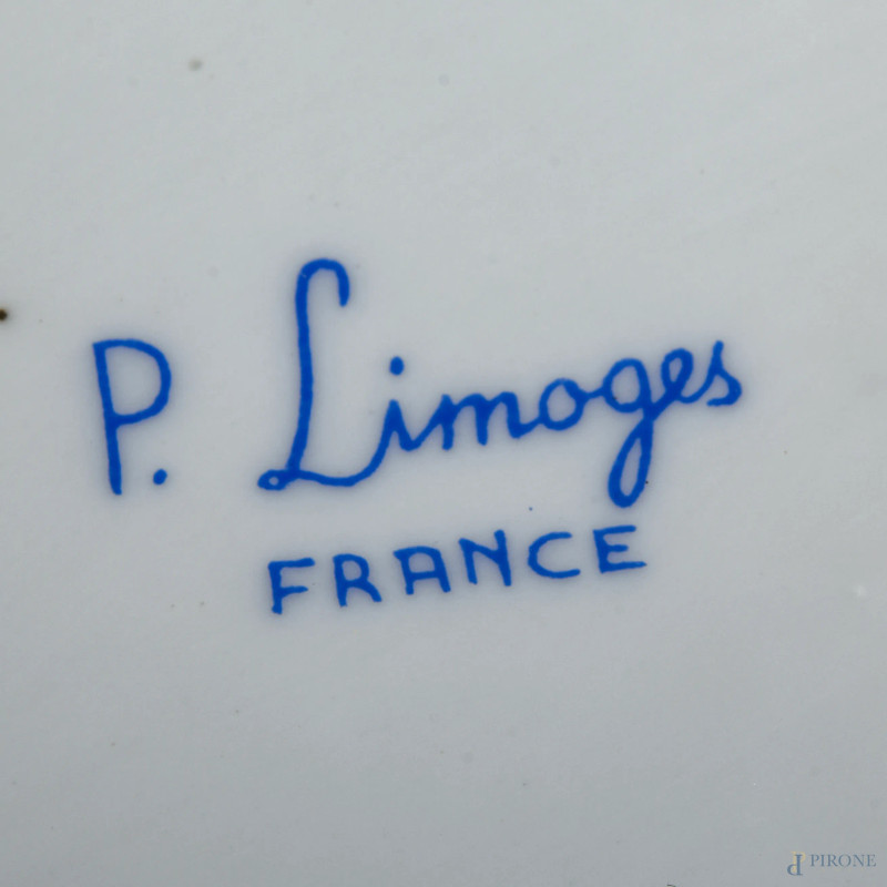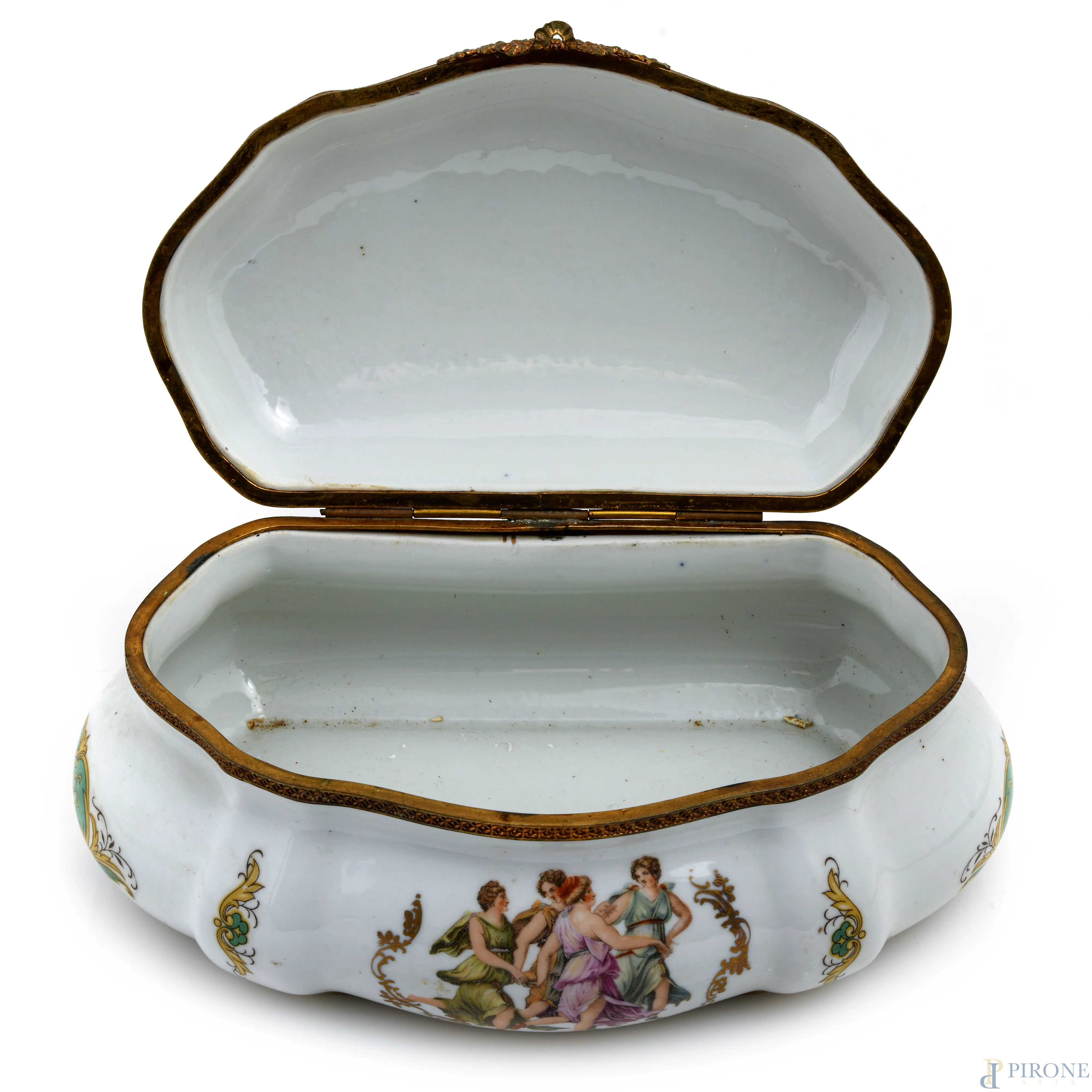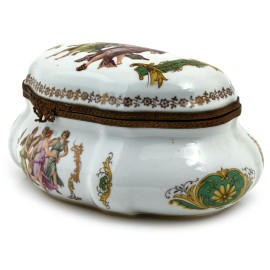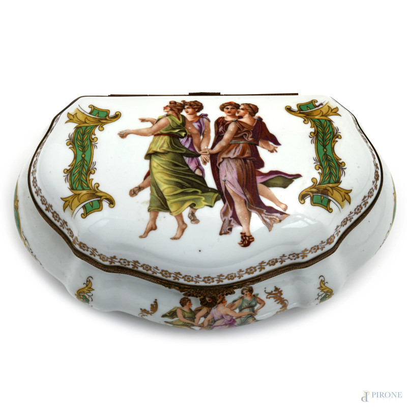 Portagioie in porcellana Limoges decorata con figure femminili, XX secolo, cm 9x21x13, (segni di usura)