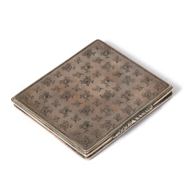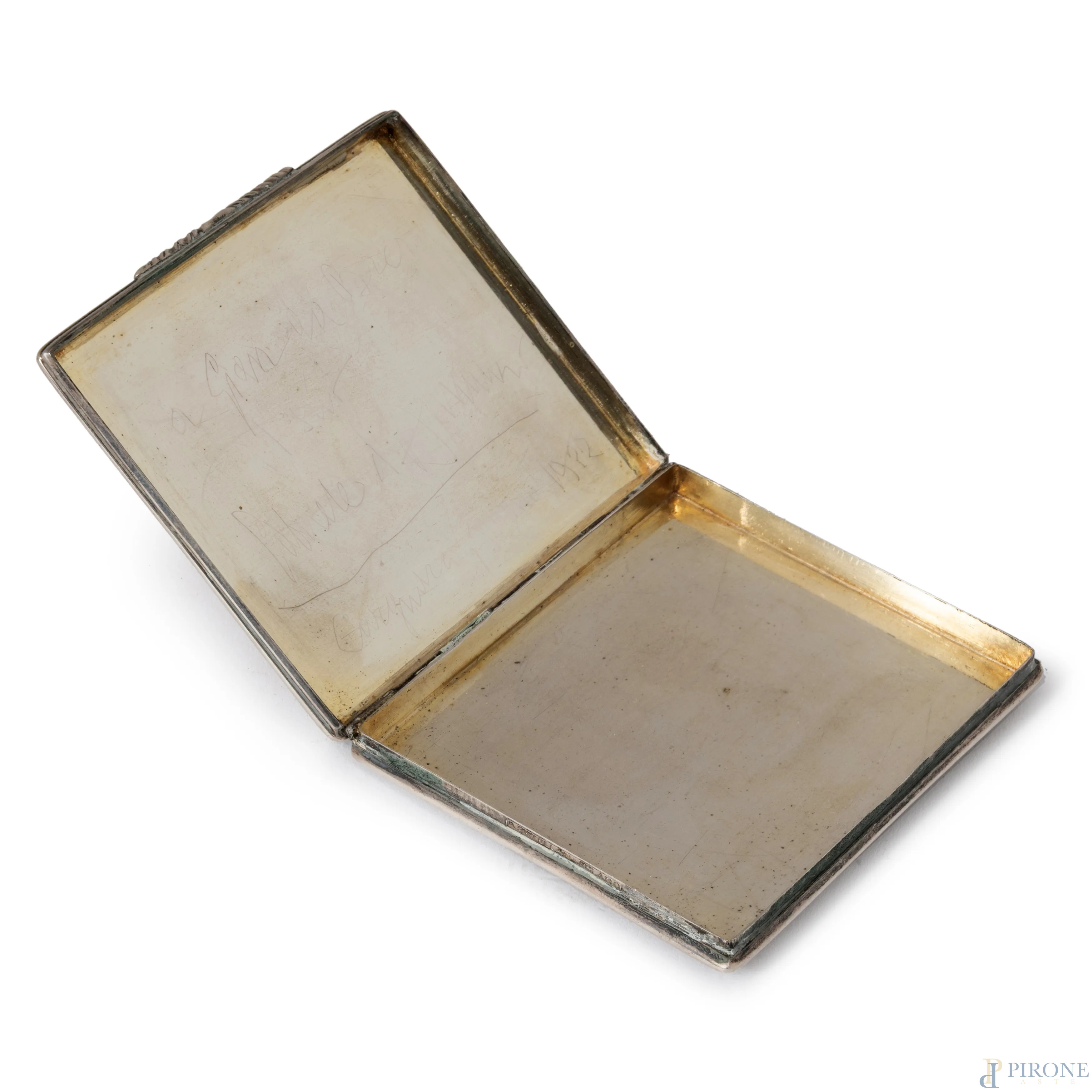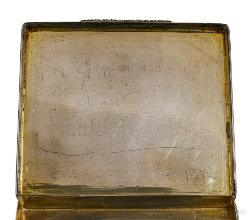 Portasigarette in argento Buccellati con firma e dedica a graffio 'A Gian da Brera, il suo Gabriele D'Annunzio' in data 'giungo 1922', cm 8x8,5, peso gr 130