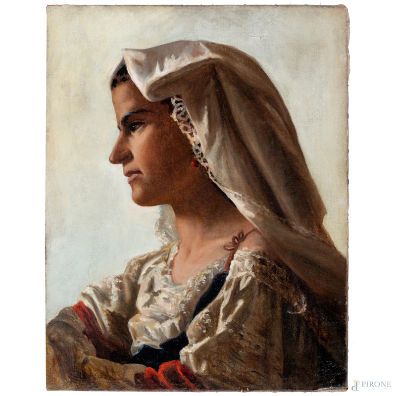 Profilo di popolana, XIX secolo, olio su tela, cm 50,5x40, firmato in basso a sinistra, (segni di usura, lacerazione)