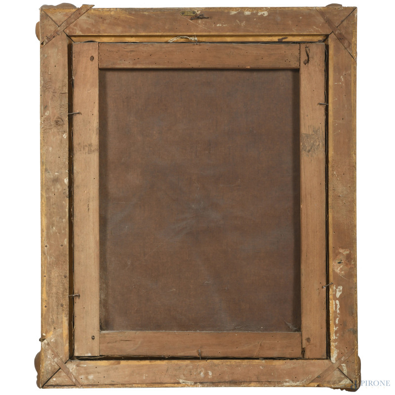 Ritratto di gentiluomo con baffi, XIX-XX secolo, olio su tela, cm 64x51,5, entro cornice, (segni di usura, abrasioni e ondulazioni del supporto, cadute di colore, difetti)